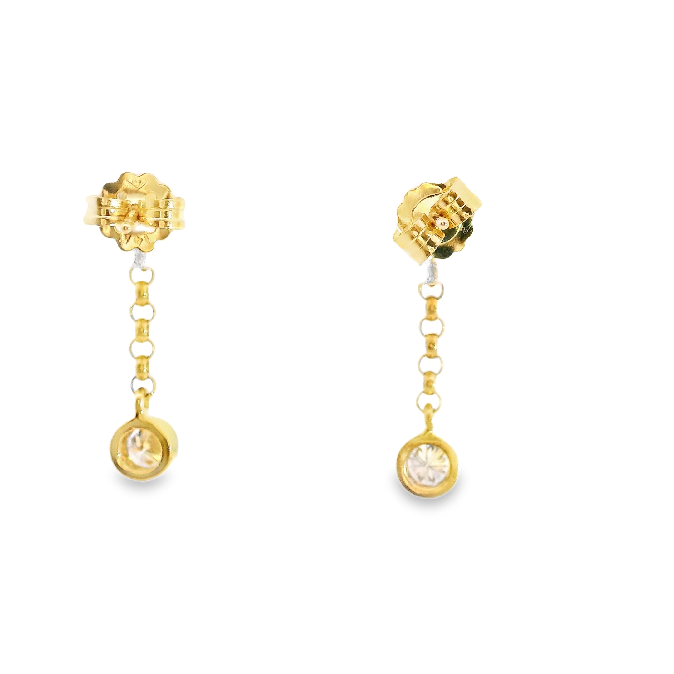 These earrings are 14k yellow gold with a diamond bezel set hanging from the bottom of the yellow gold cable link chain and ball post. The earrings hang 0.75" long with friction backs. 0.20 CT TW