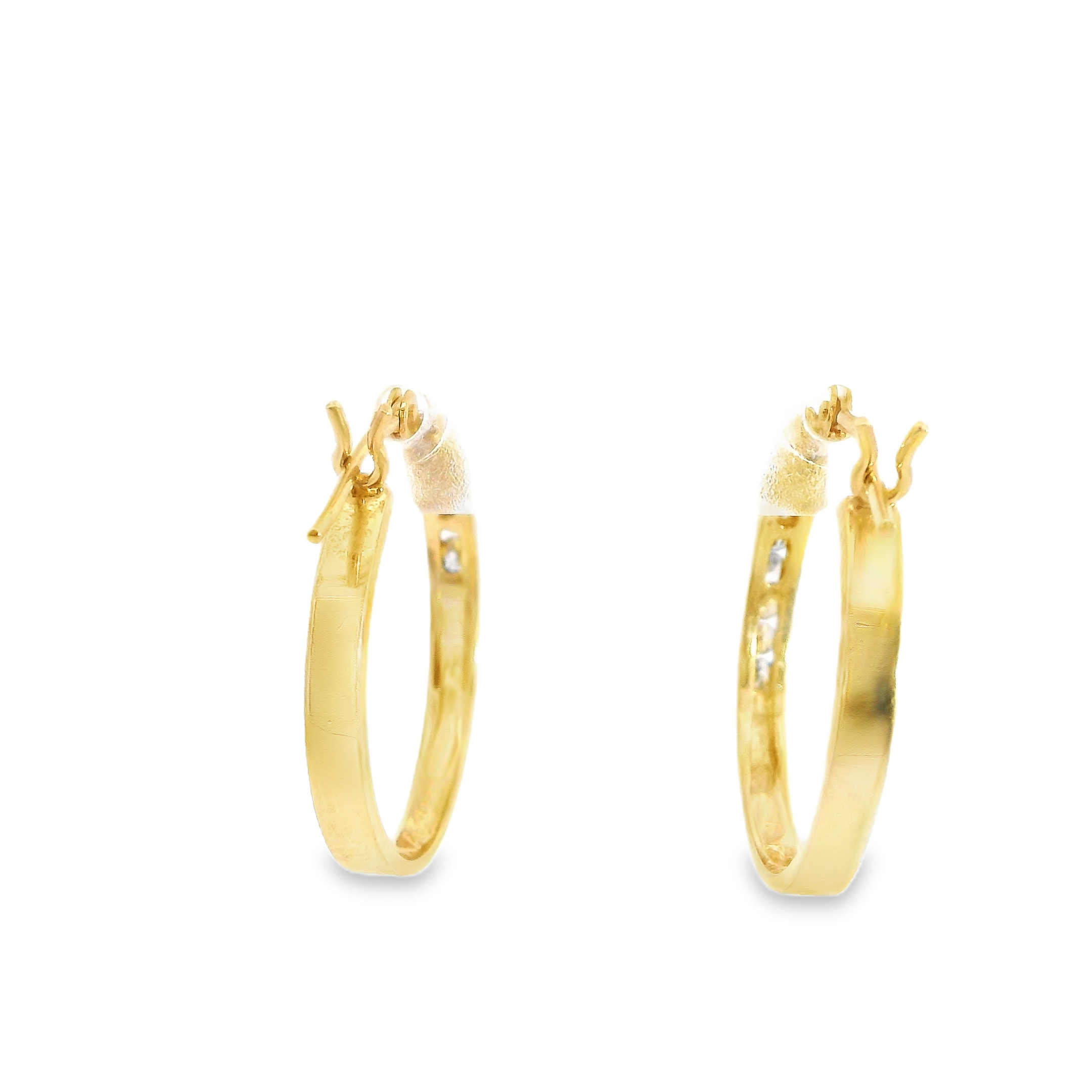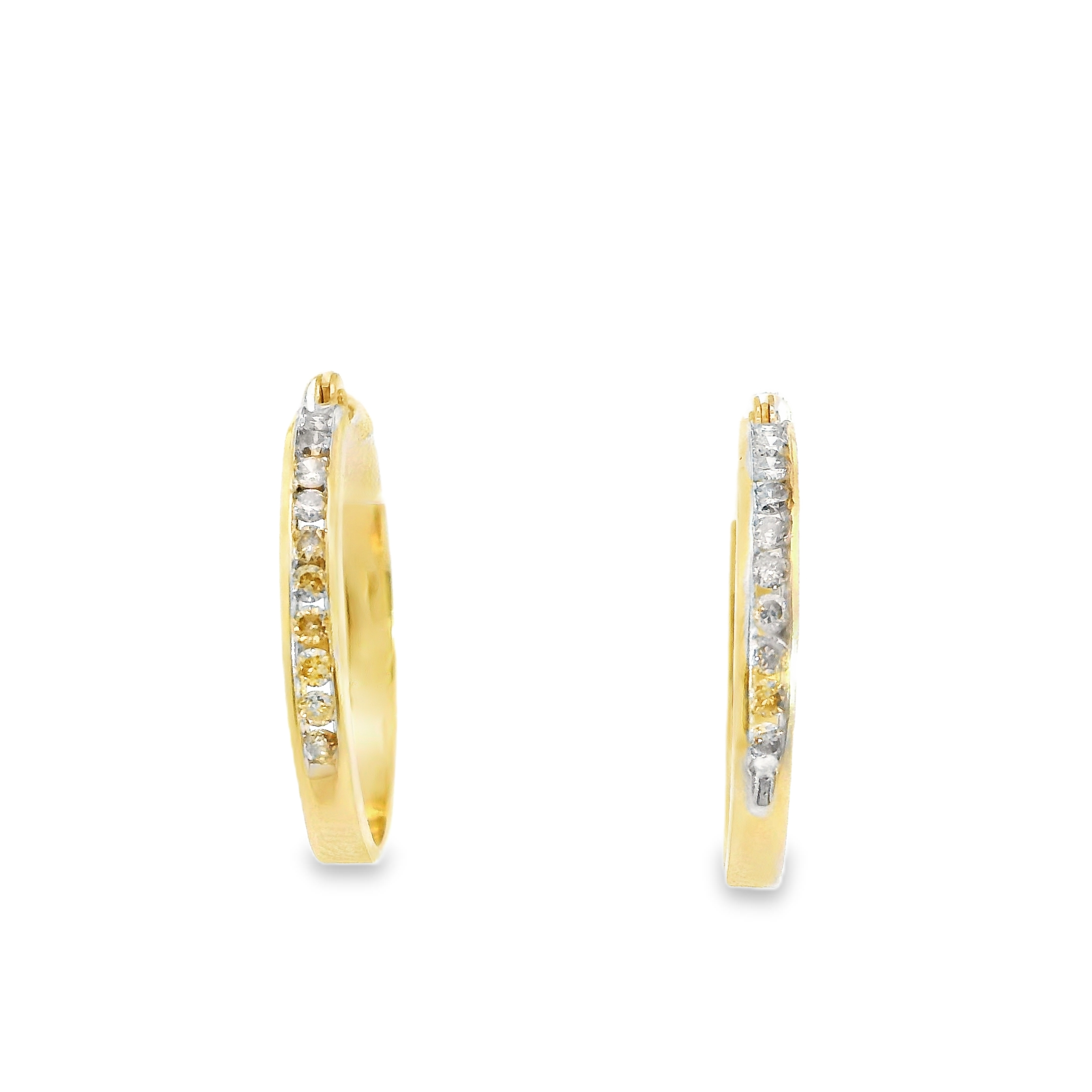 These estate earrings are 14k yellow gold with 9 diamonds channel set in each earring. The diamonds total approx 0.34 CT TW.