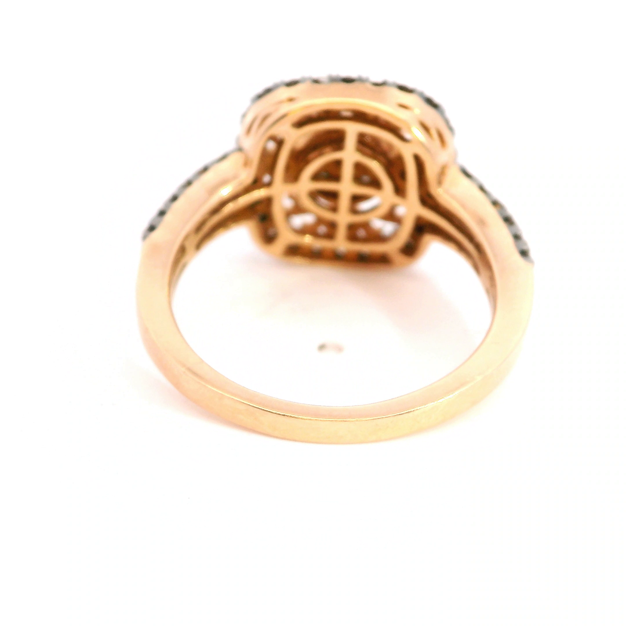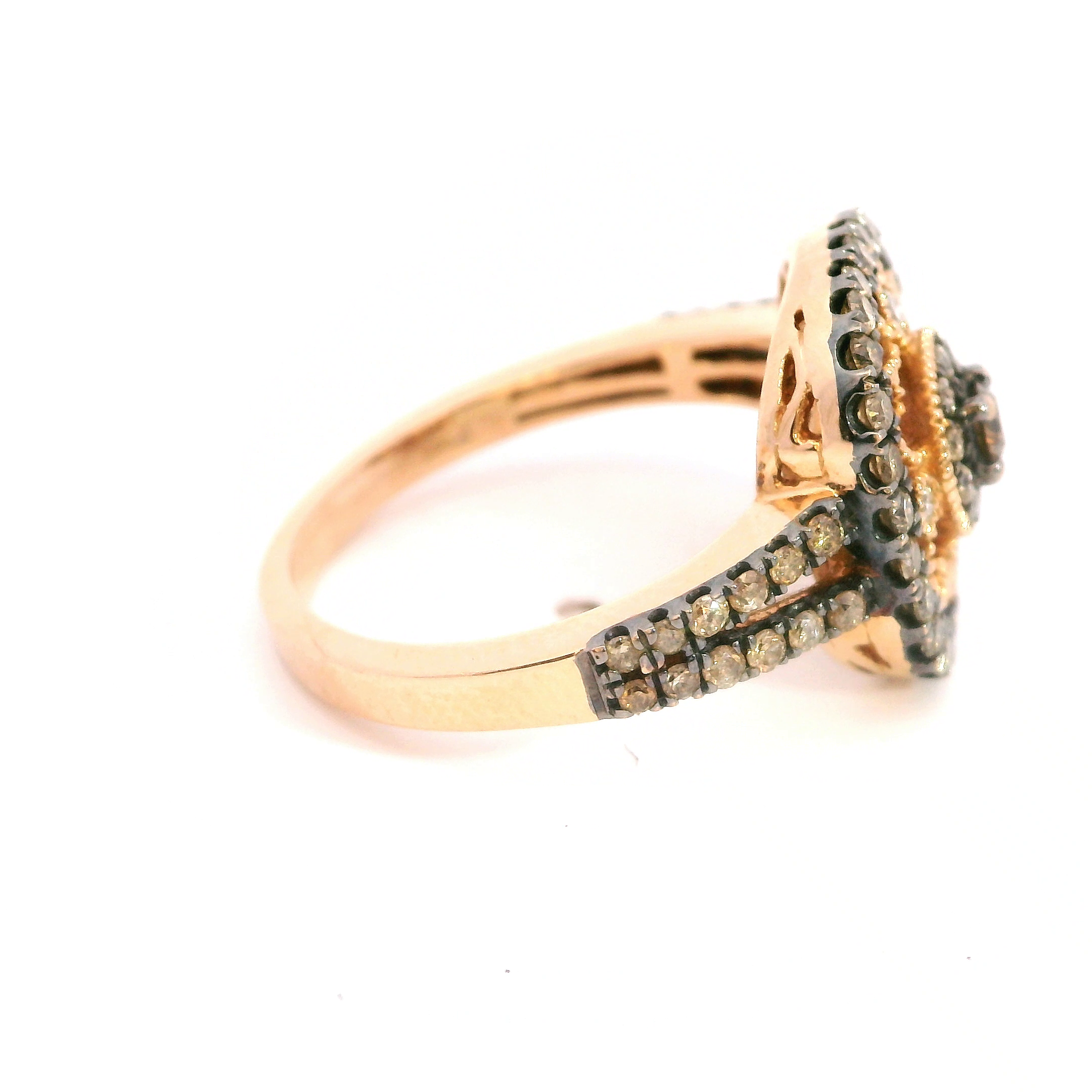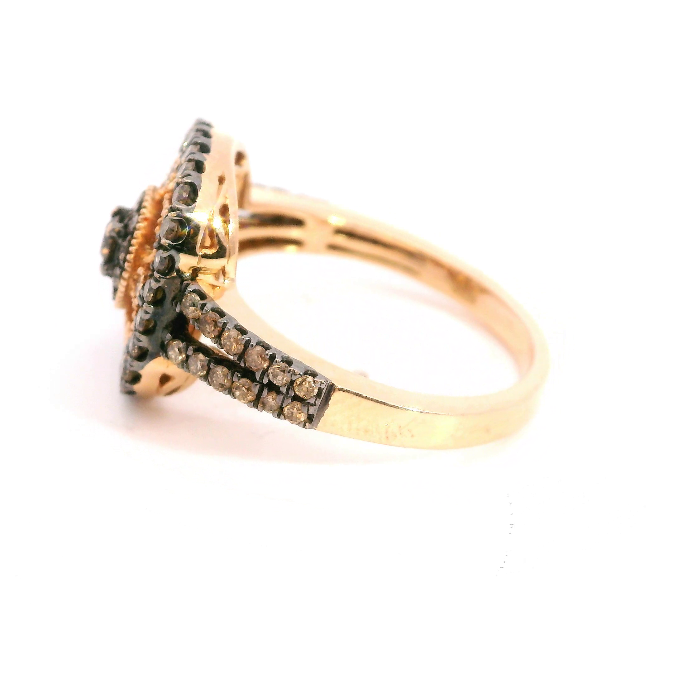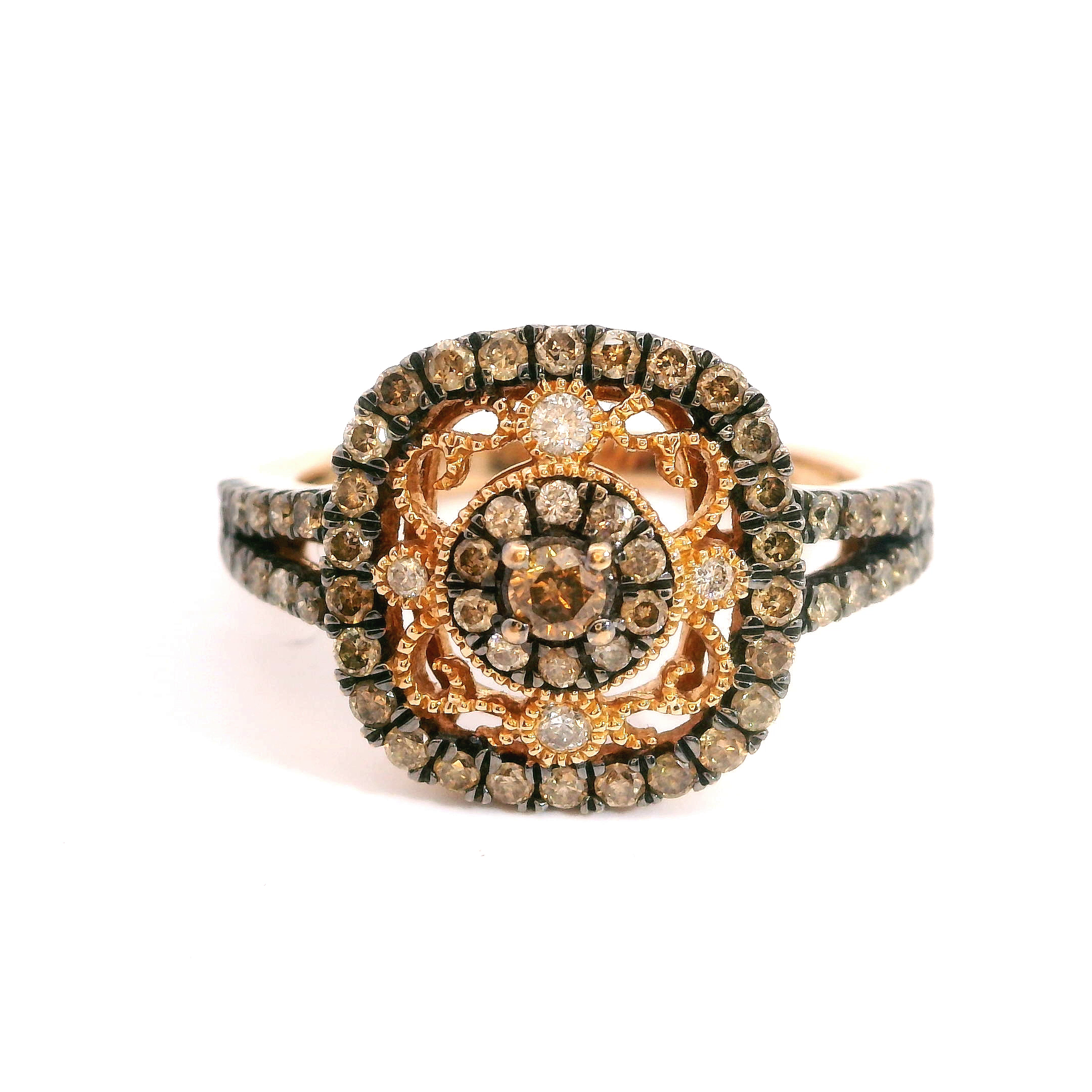 This estate ring is a 14k rose gold ring with chocolate and white diamonds prong set in a halo cluster style with vintage milgrain detailing in the ring. The diamonds total approx 1.00 ct tw. Size 7.25