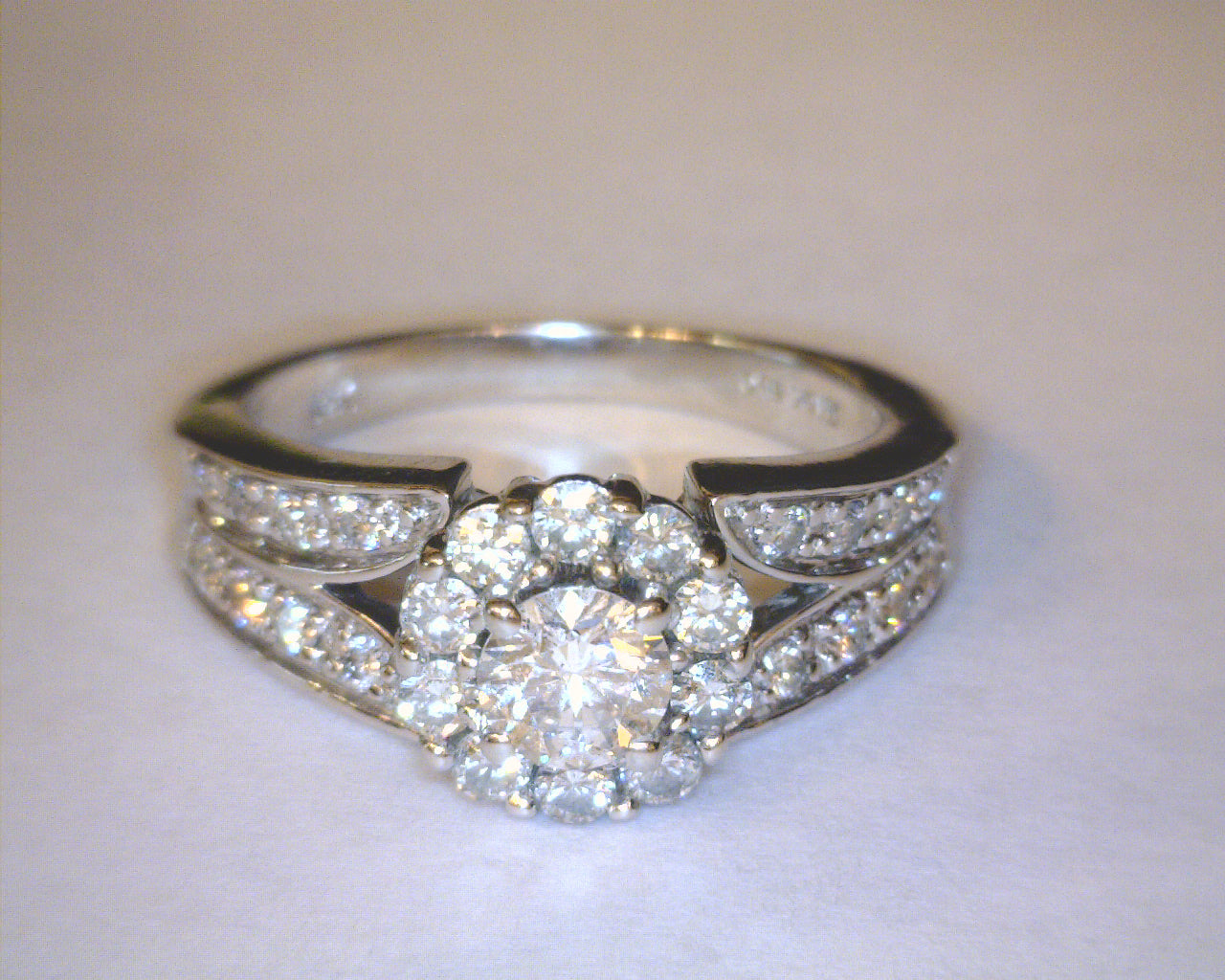 HAVE TO LOVE A DIAMOND HALO! THIS ESTATE 14K WG HALO DIAMOND ENGAGEMENT RING MOUNT BOASTS 1.00 CT TW (CENTER=0.45 CT HALO=0.30 CT BAND=0.25 CT). SPLIT SHANK HAS PRONGSET DIAMONDS W/CHANNEL EDGE.