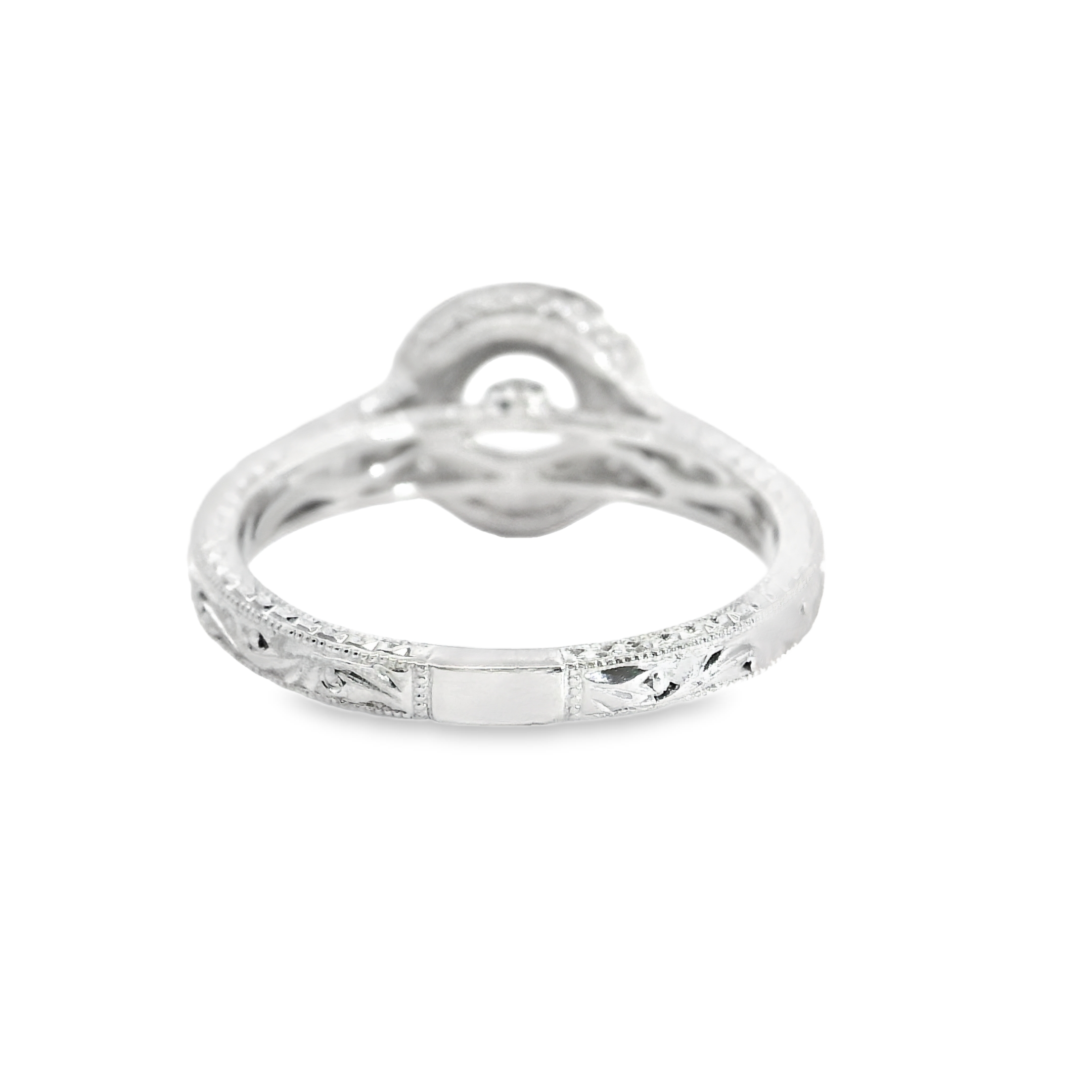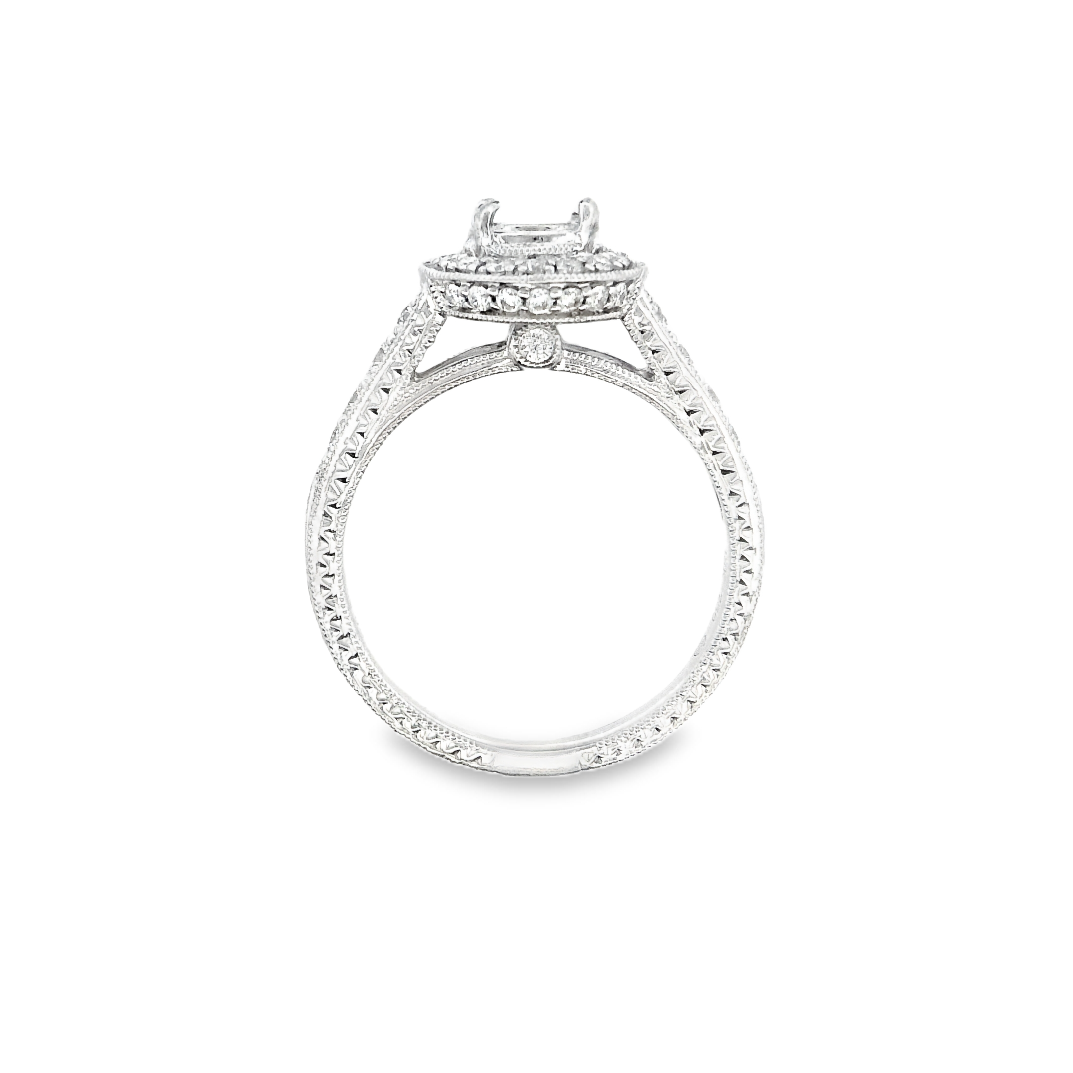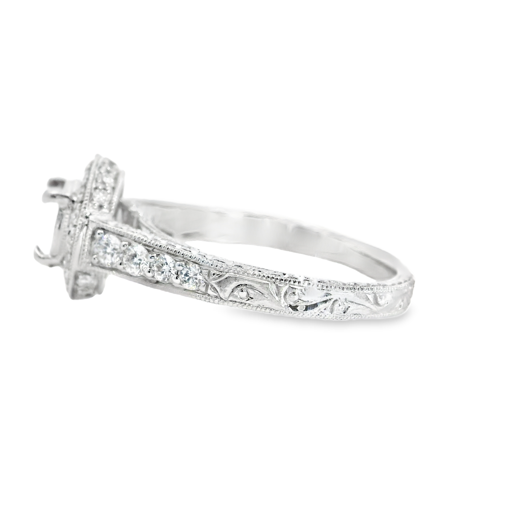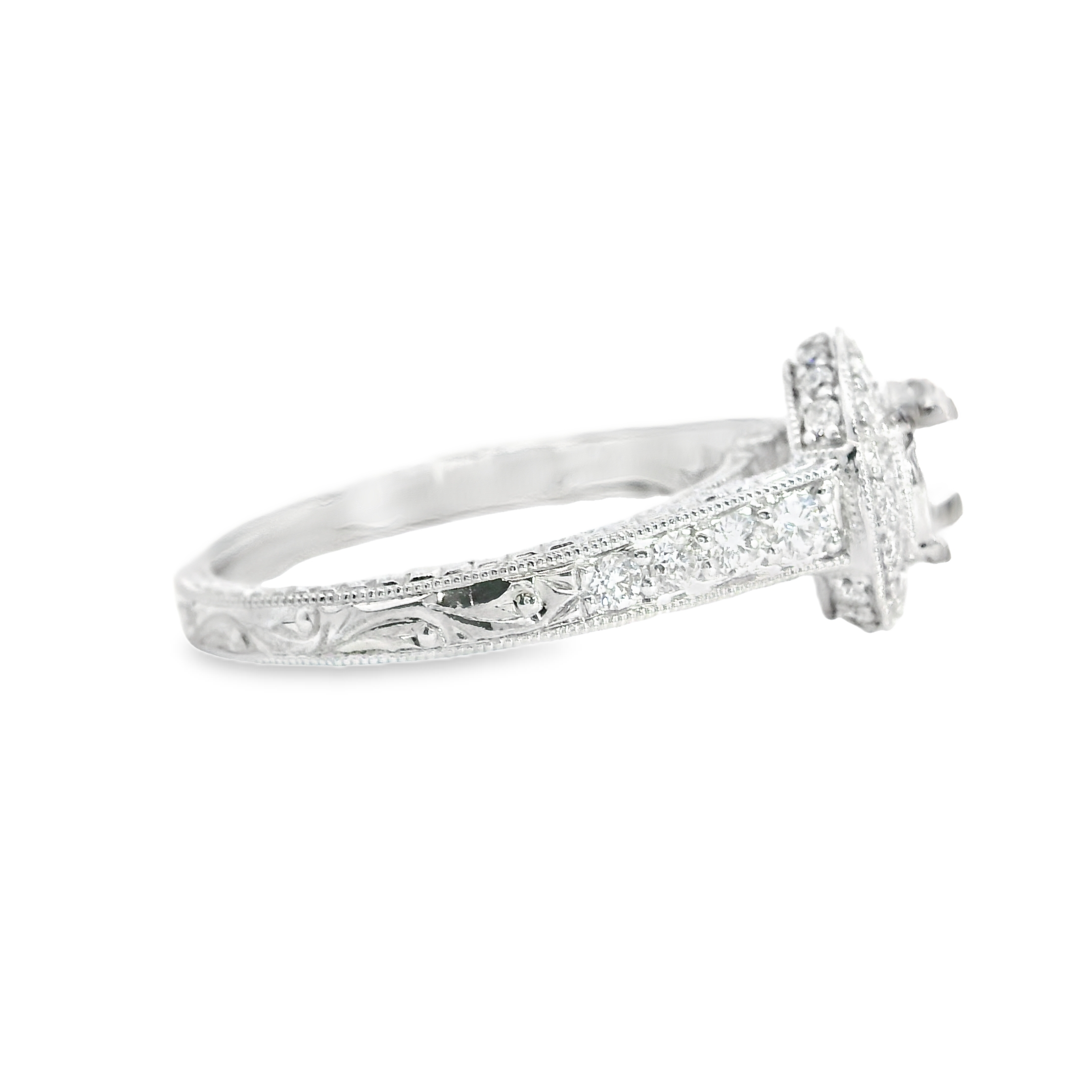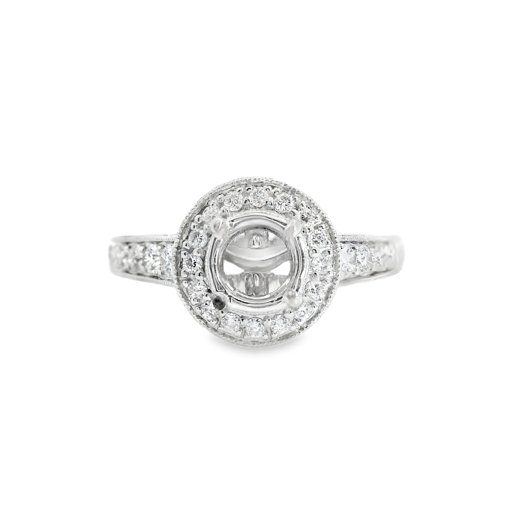 18K WHITE GOLD DIAMOND ROUND HALO ENGAGEMENT MOUNTING WITH DIAMONDS = 0.53 CT TW. MILIGRAIN EDGE AND ROPE DESIGN ON PROFILE OF BAND.