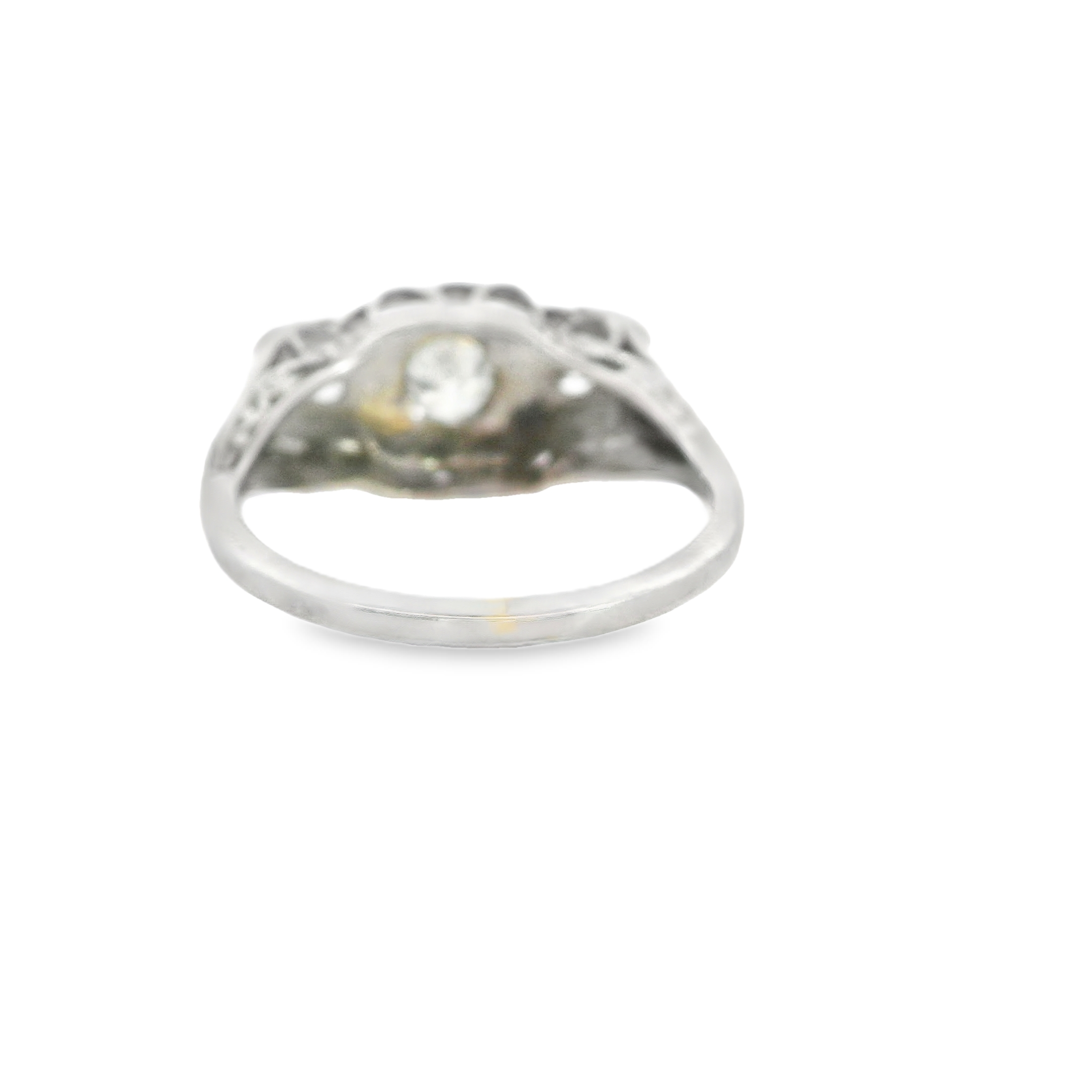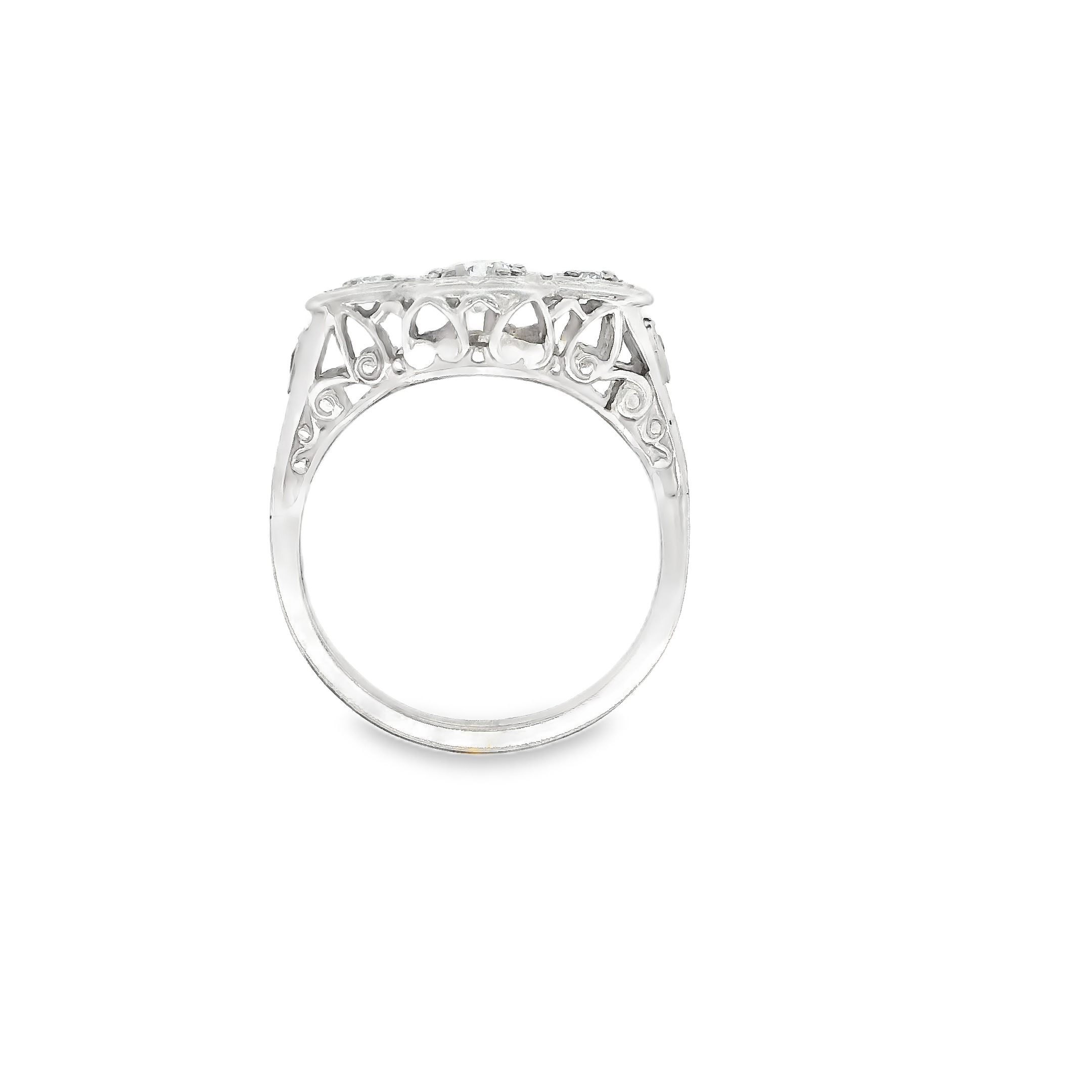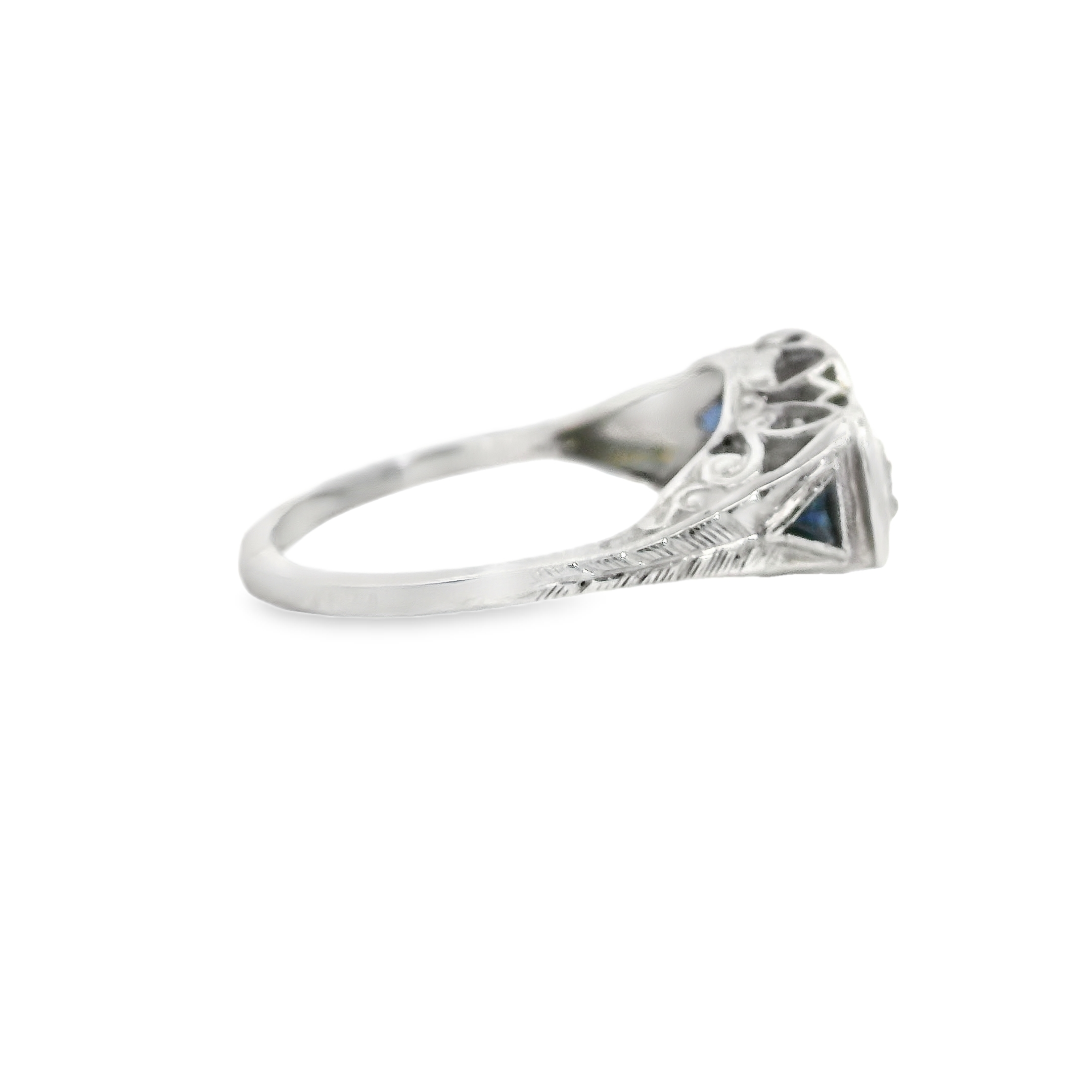 This is an estate vintage 14k white gold diamond & sapphire ring. The diamonds total approx 0.45 ct tw with 2 trillion accent sapphires set on the sides. Filigree work throughout the ring. The ring is a size 6.5