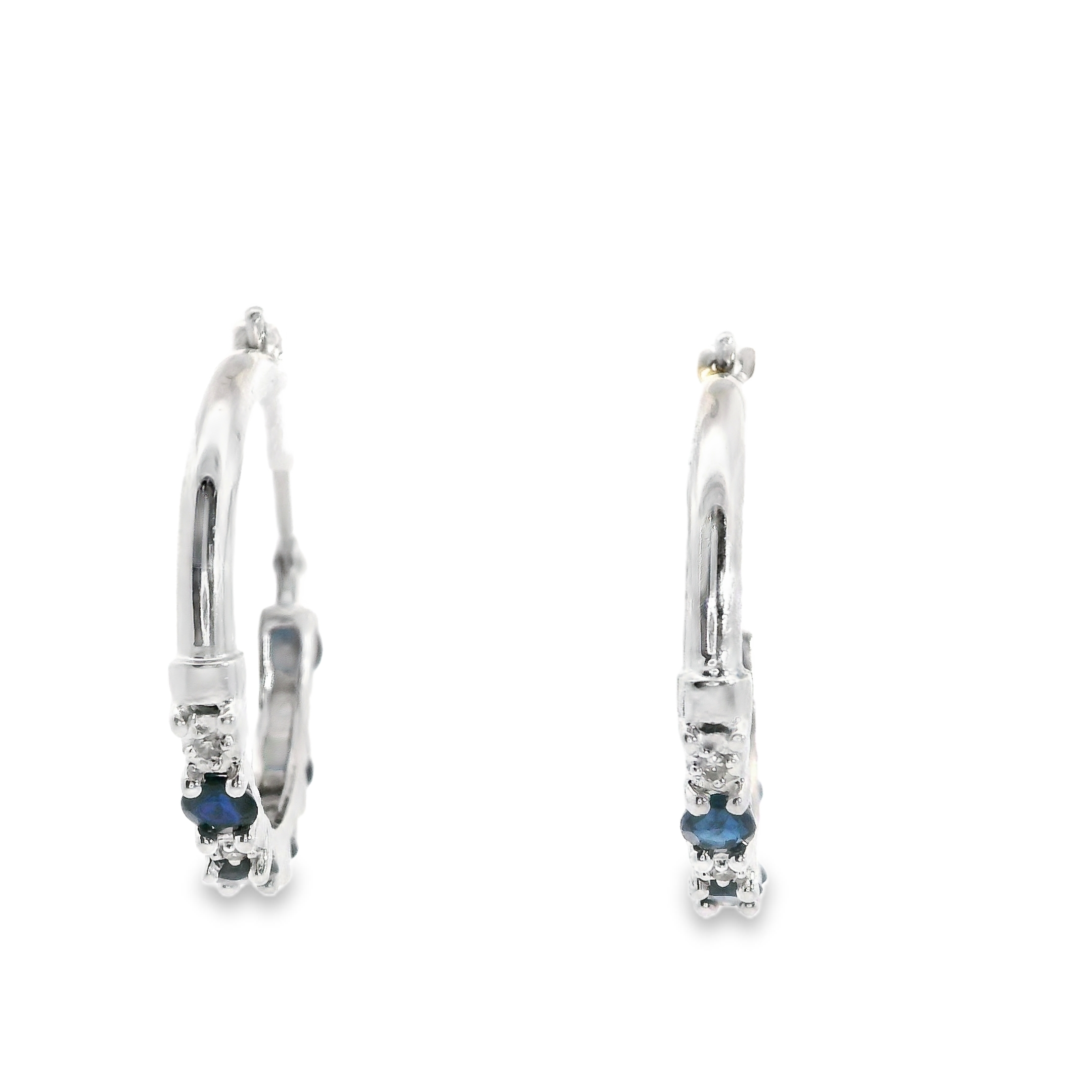 These estate earrings are 10K WG sapphire & diamond hoop earrings. Te stones alternate in the front of the hoop. The 10 sapphires total approx 1.0 ct tw and the diamonds total approx 0.05 CT TW. 0.75" in diameter