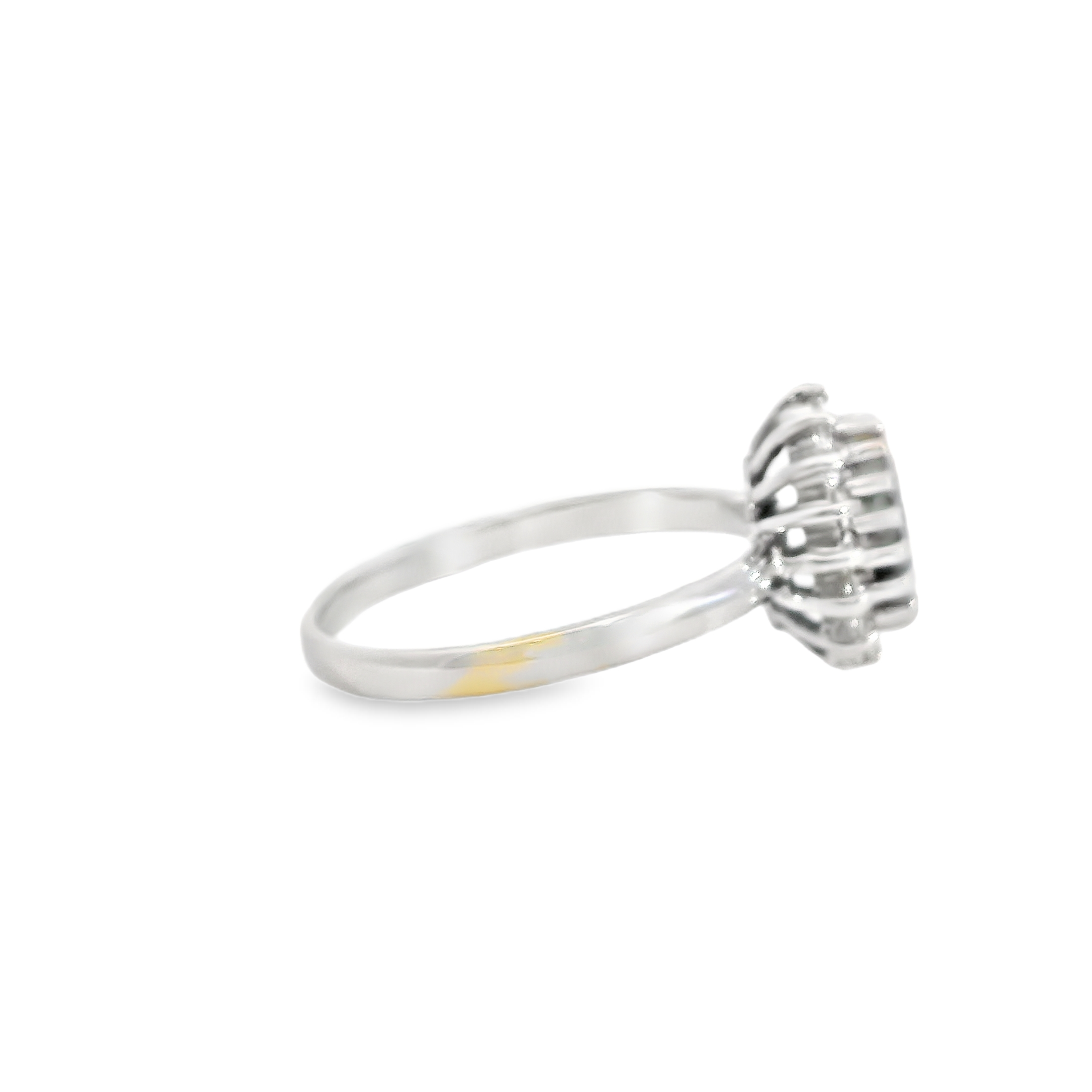 This estate ring is a 10k white gold sapphire & diamond ring with an approx 1.0 CT blue sapphire set in the center and a halo of diamonds prong set around the outside totaling approx 0.16 ct tw. It is a size 6.5