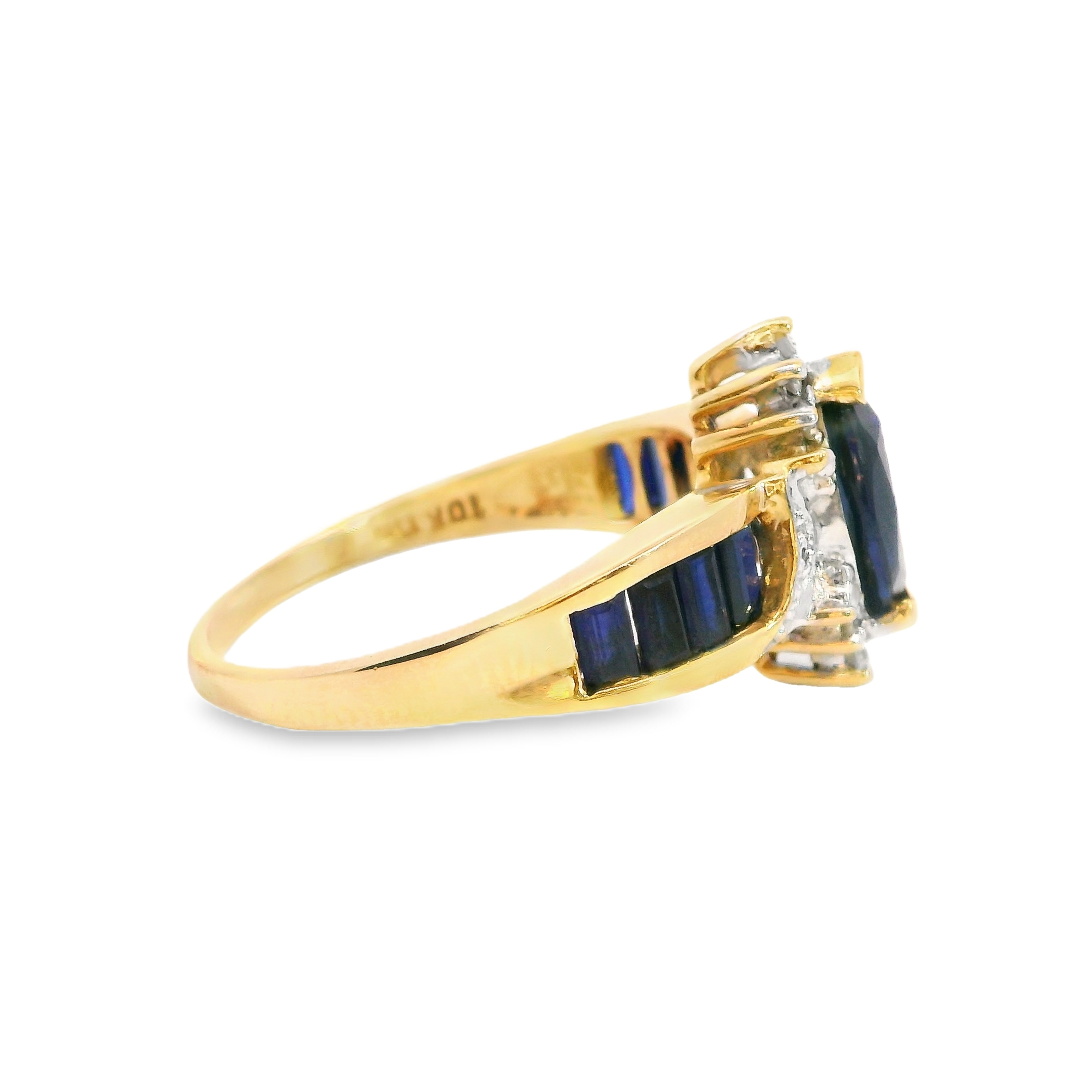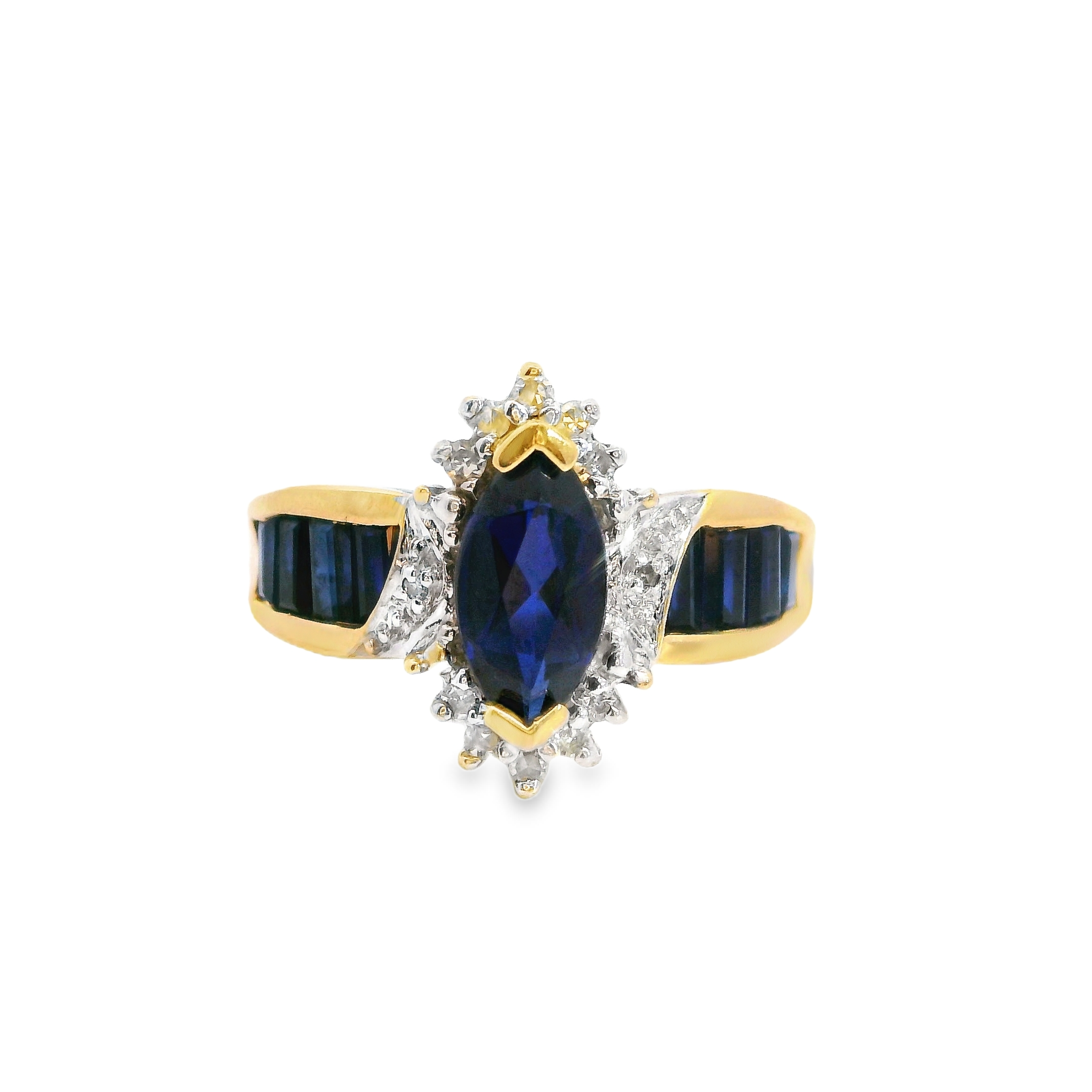 This estate ring is a 10k yellow gold ring with a synthetic marquis shape sapphire set in the cent er and emerald cut sapphires channel set in the band. There is a halo of small diamonds set around the center sapphire. The ring is a size 9.25.