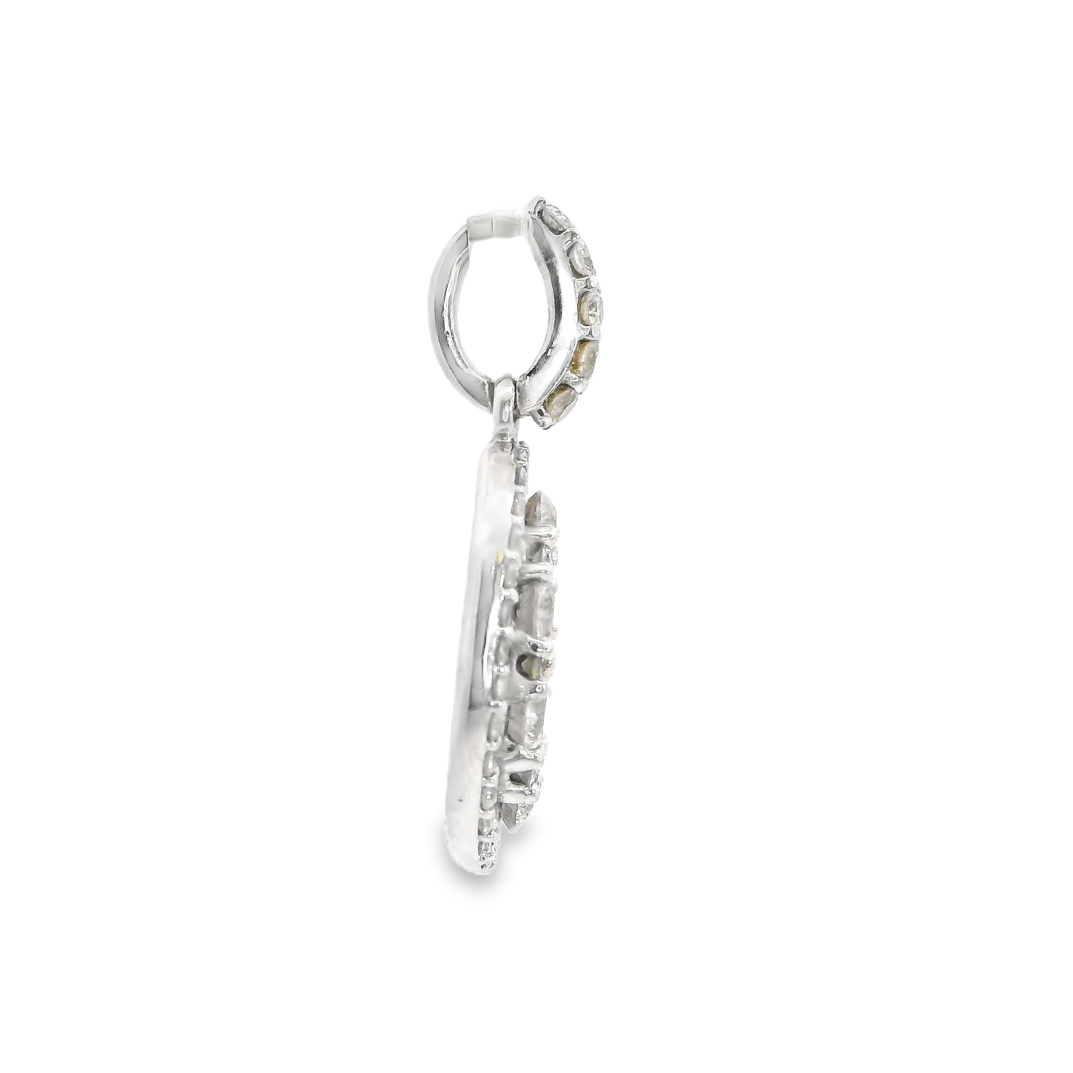 This estate pendant is a 14k white gold oval shape diamond pendant with 43 diamonds set in a cluster oval in the center with diamonds prong set in a halo around the center and in the bail. The diamonds total approx 0.70 CT TW and are H/I in color and SI2-I1 clarity.