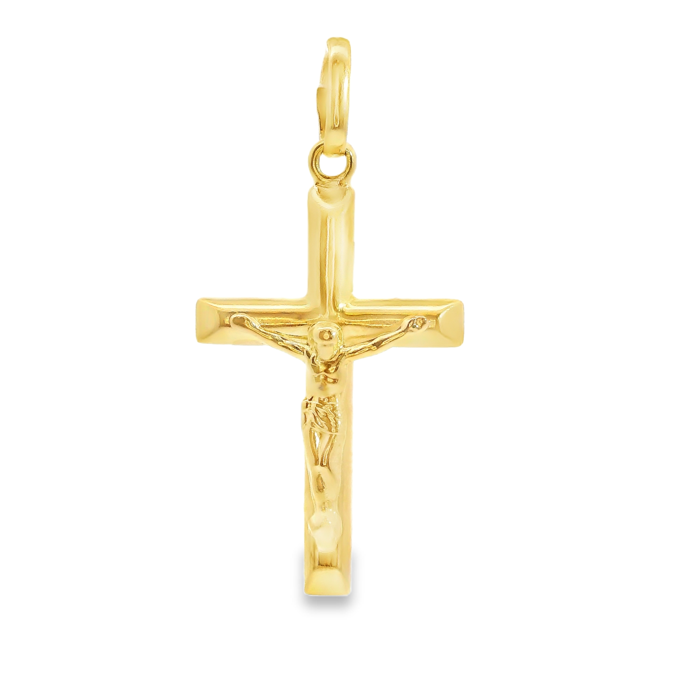This estate charm is a 14k yellow crucifix style cross, 1.25" long and 0.5" across.
