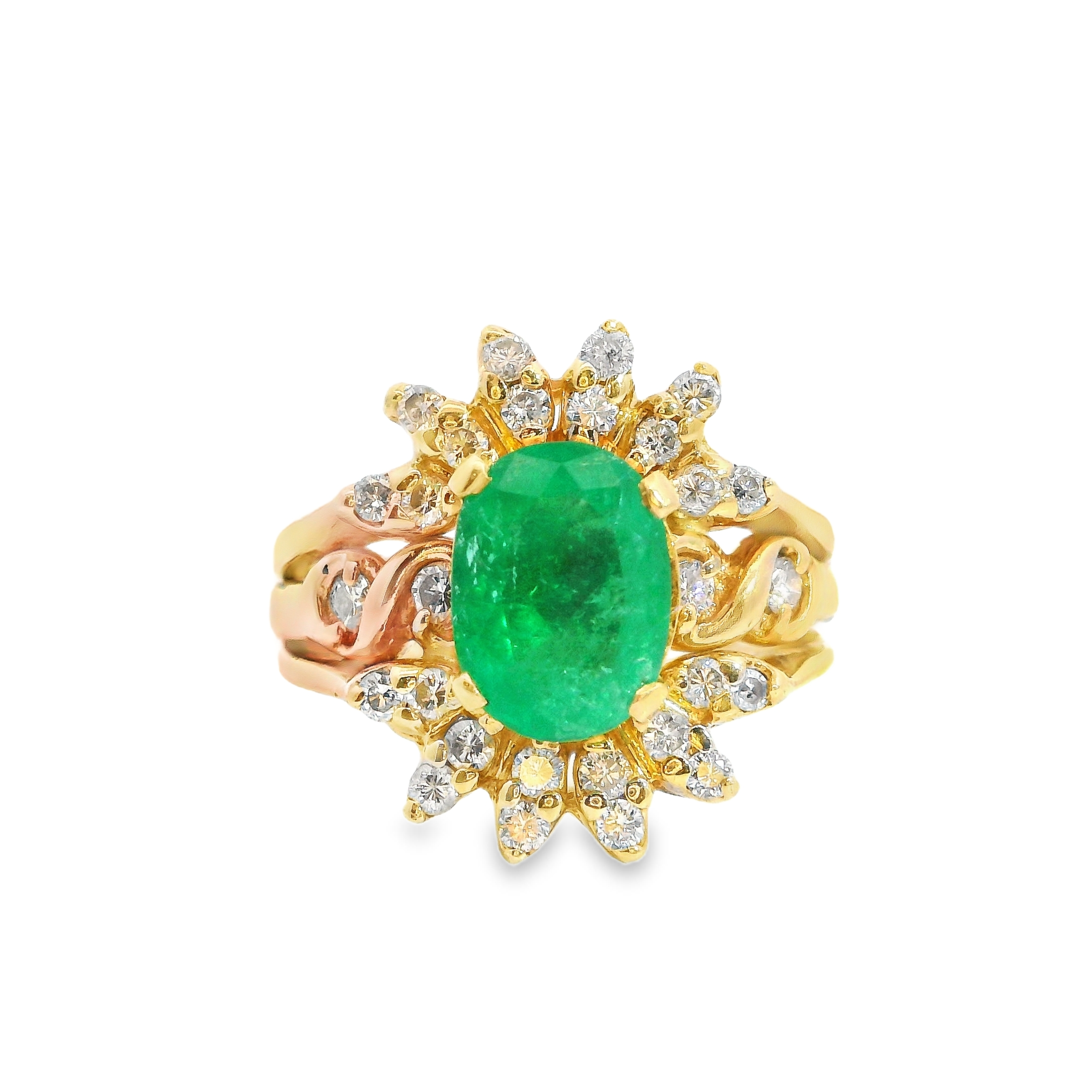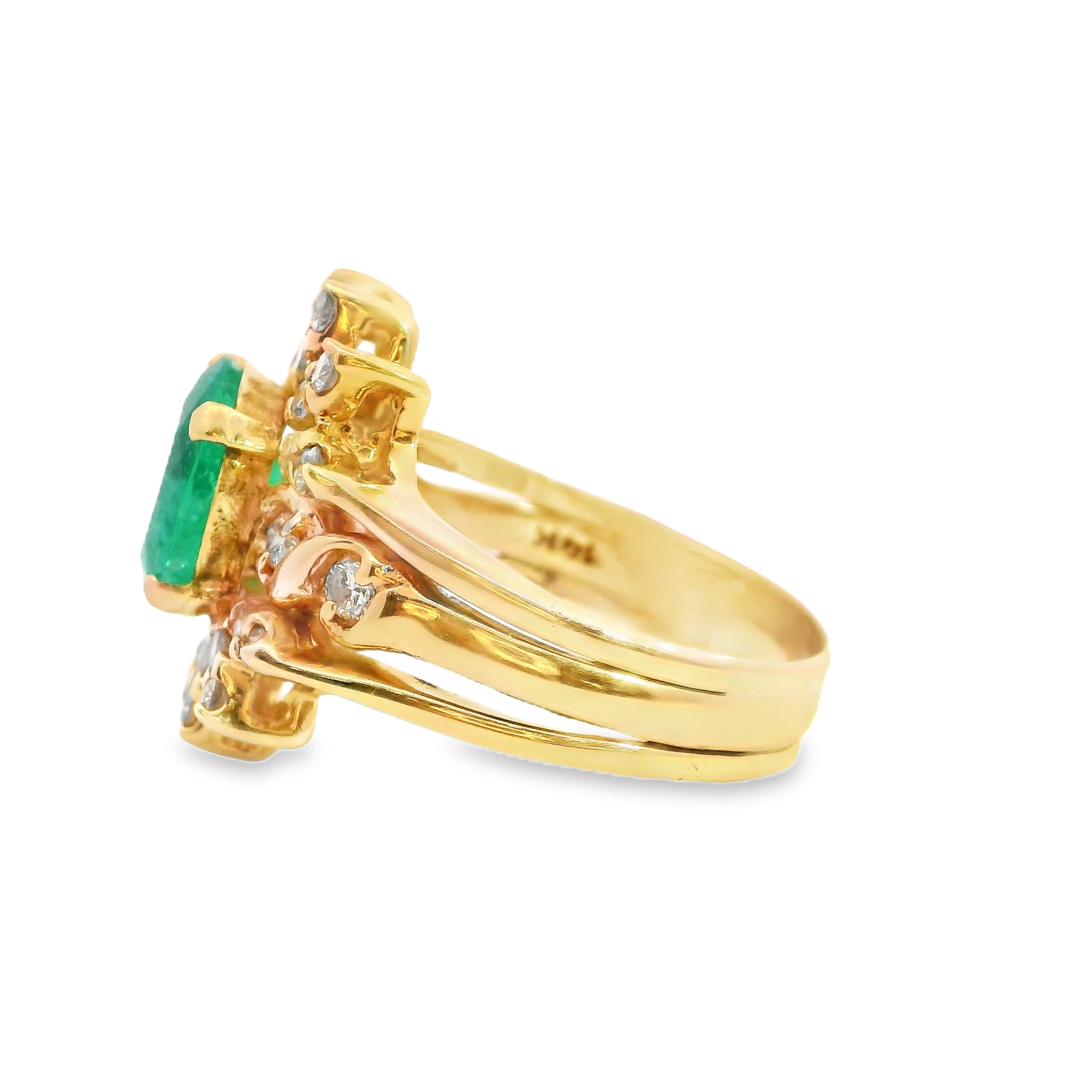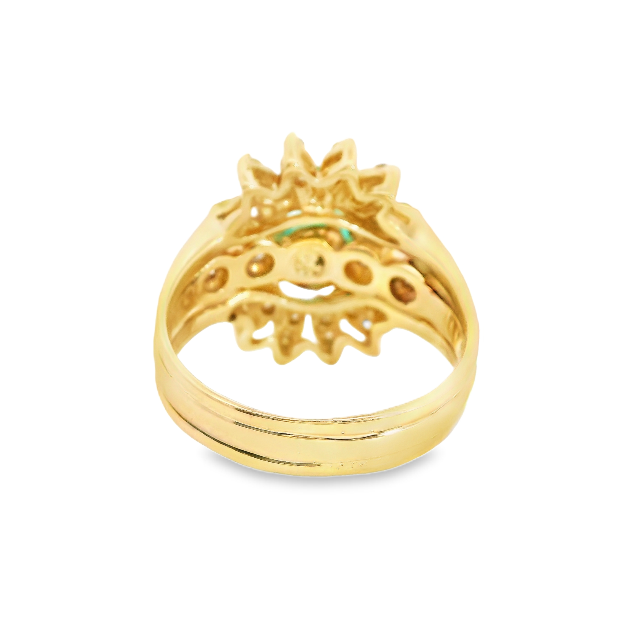 This estate ring is a 14k yellow gold emerald & diamond ring with an oval emerald set in the center, approx 1.60 ct. Nice green in color, moderately included. Diamonds are prong set around the outside of the emerald and down the shank. The piece is 3 rings soldered together. Diamonds total approx 0.52 CT TW. Size 8.25
