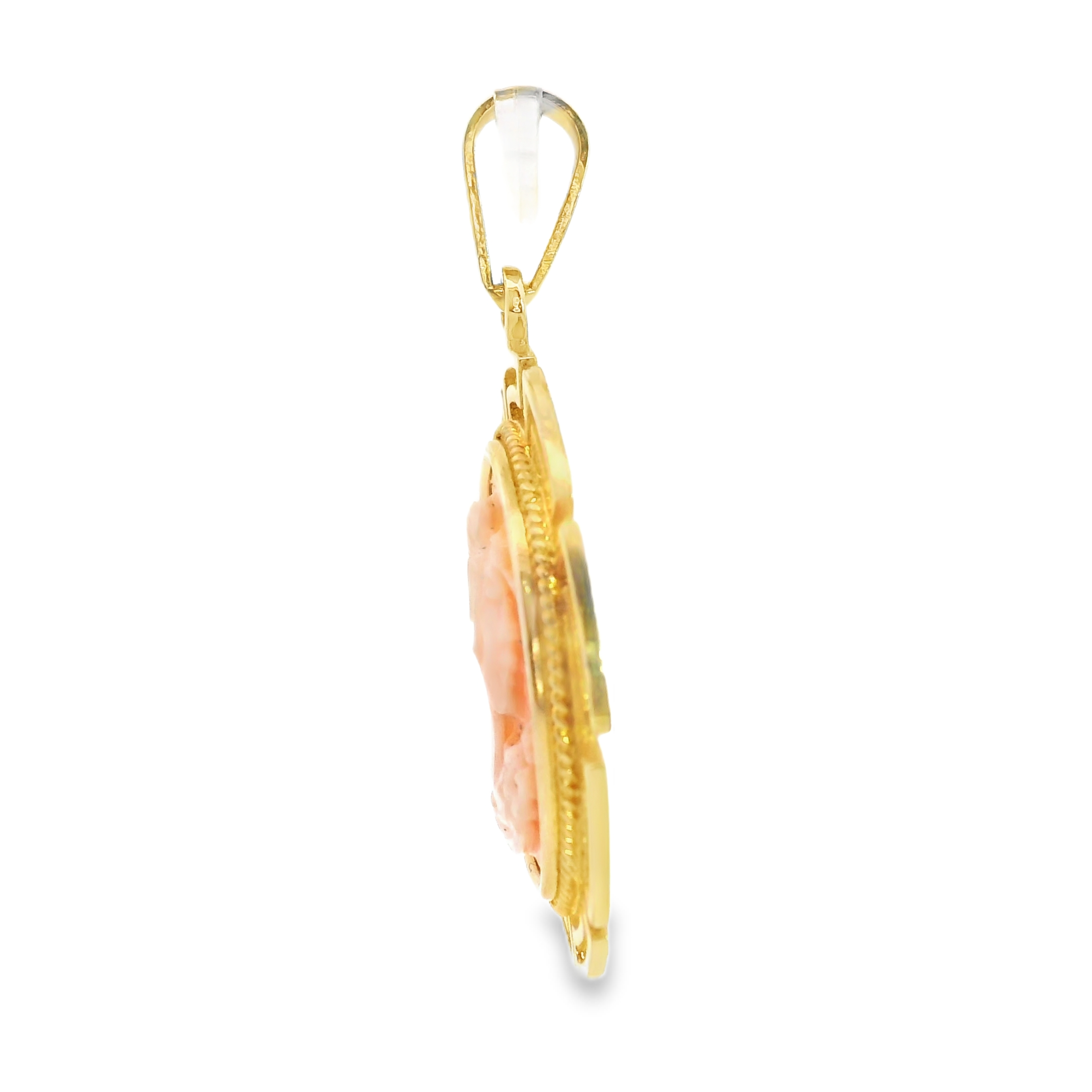 This estate pendant is a 14k yellow gold pendant with a greek key bezel and roping detail holding the helmet shell cameo pendant.