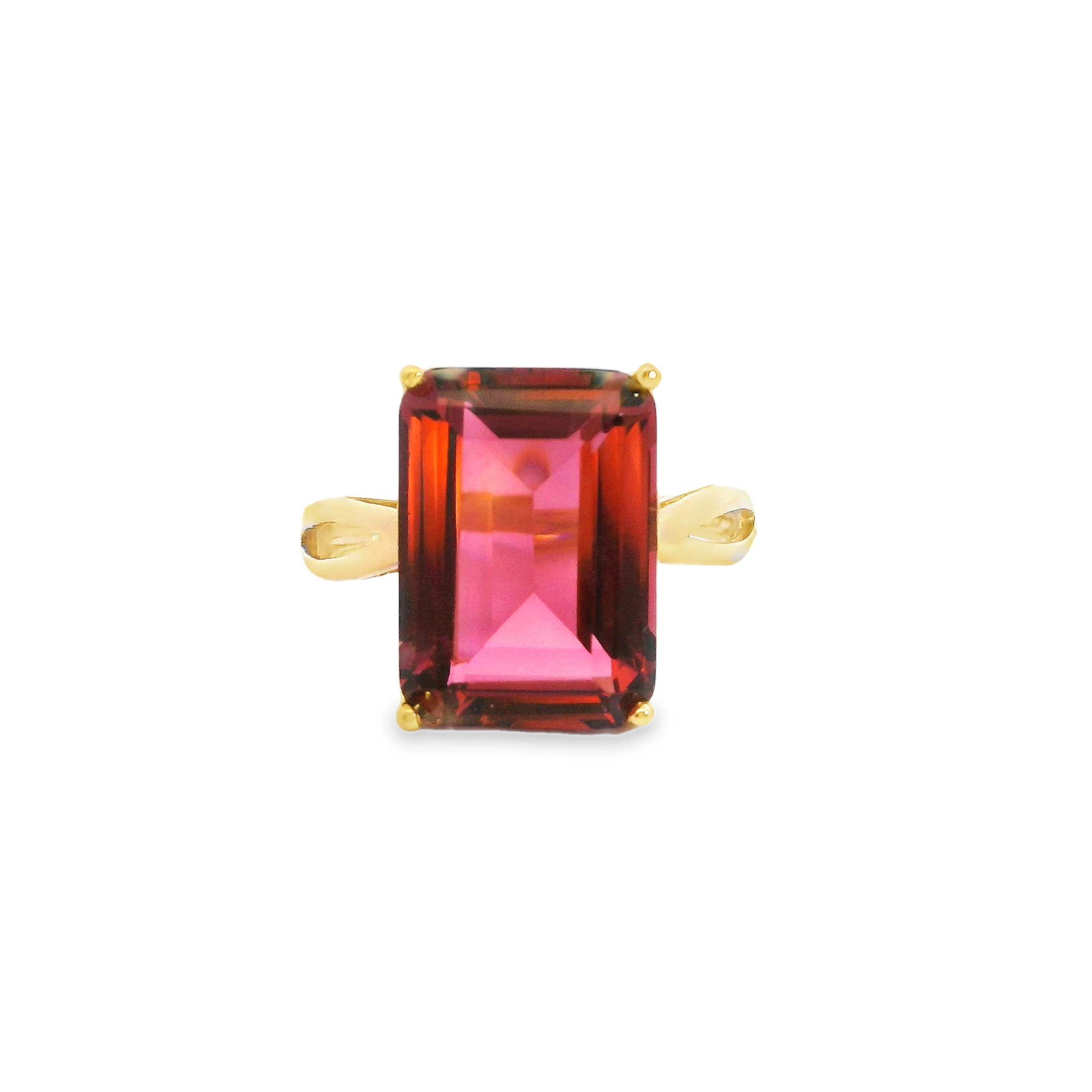 This estate ring is a 14k yellow gold solitaire ring with a 14x10mm purple/pink emerald cut glass prong set in the center of the split shank style band with 4 prongs. It is a size 6.75 currently.
