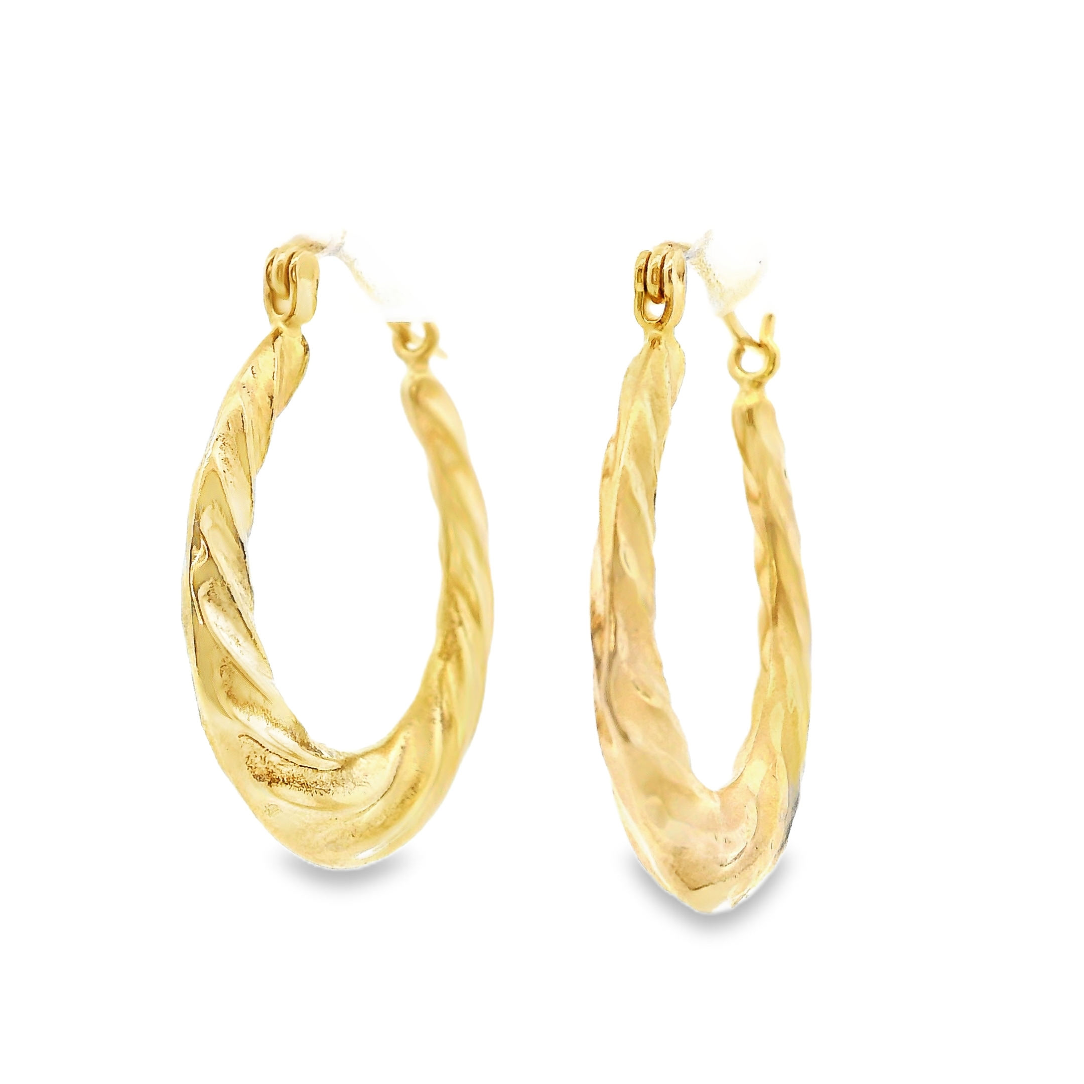 These estate earrings are 14k yellow gold, approx 1" across with a twisted diamond cut design. As is, slight dent.