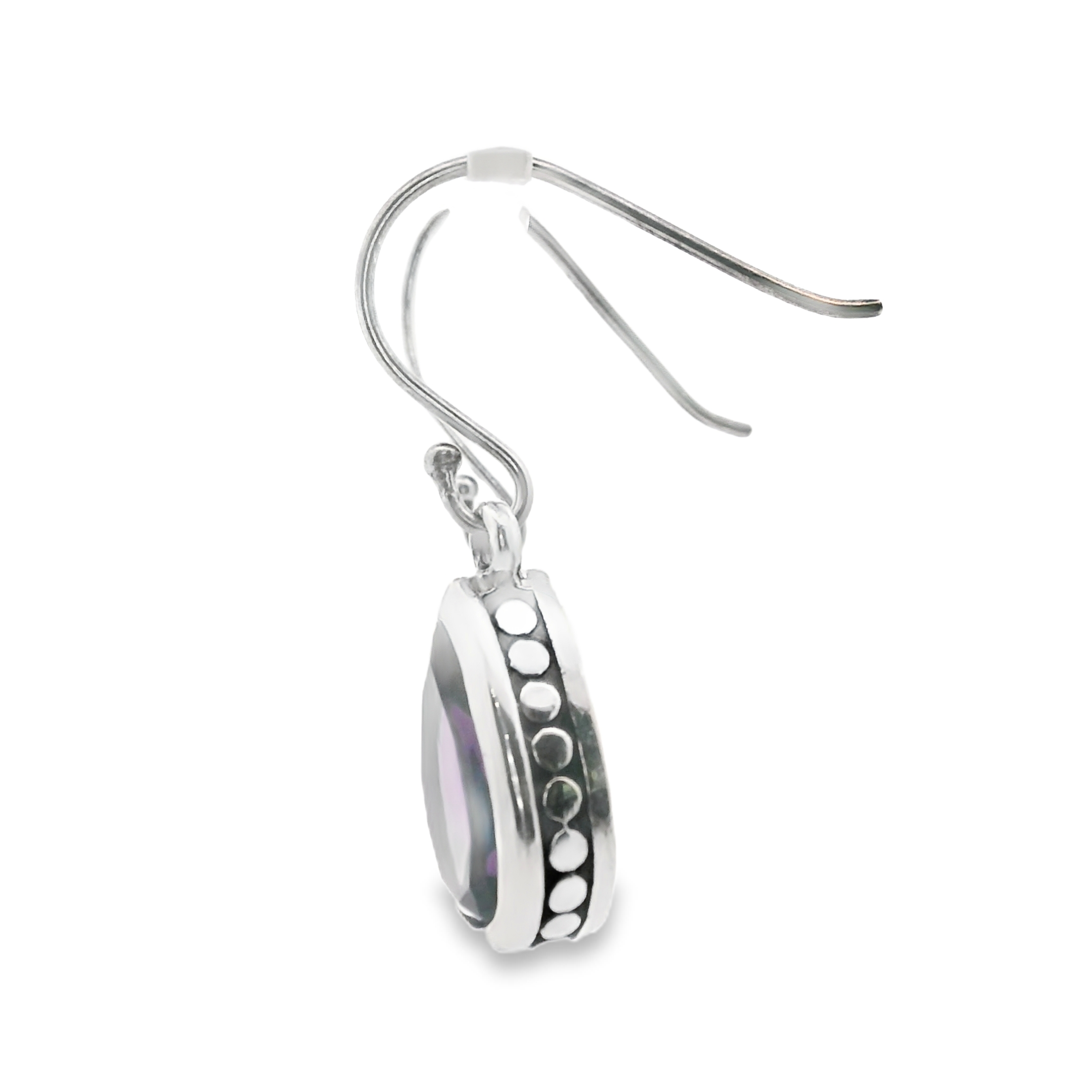 These estate earrings are sterling silver earrings with a bezel set pear shape amethyst hanging from the bottom of the fish hoot style ear wires. They hang approx 1.25" long. Beaded circle detailing around the bezel of the earrings,