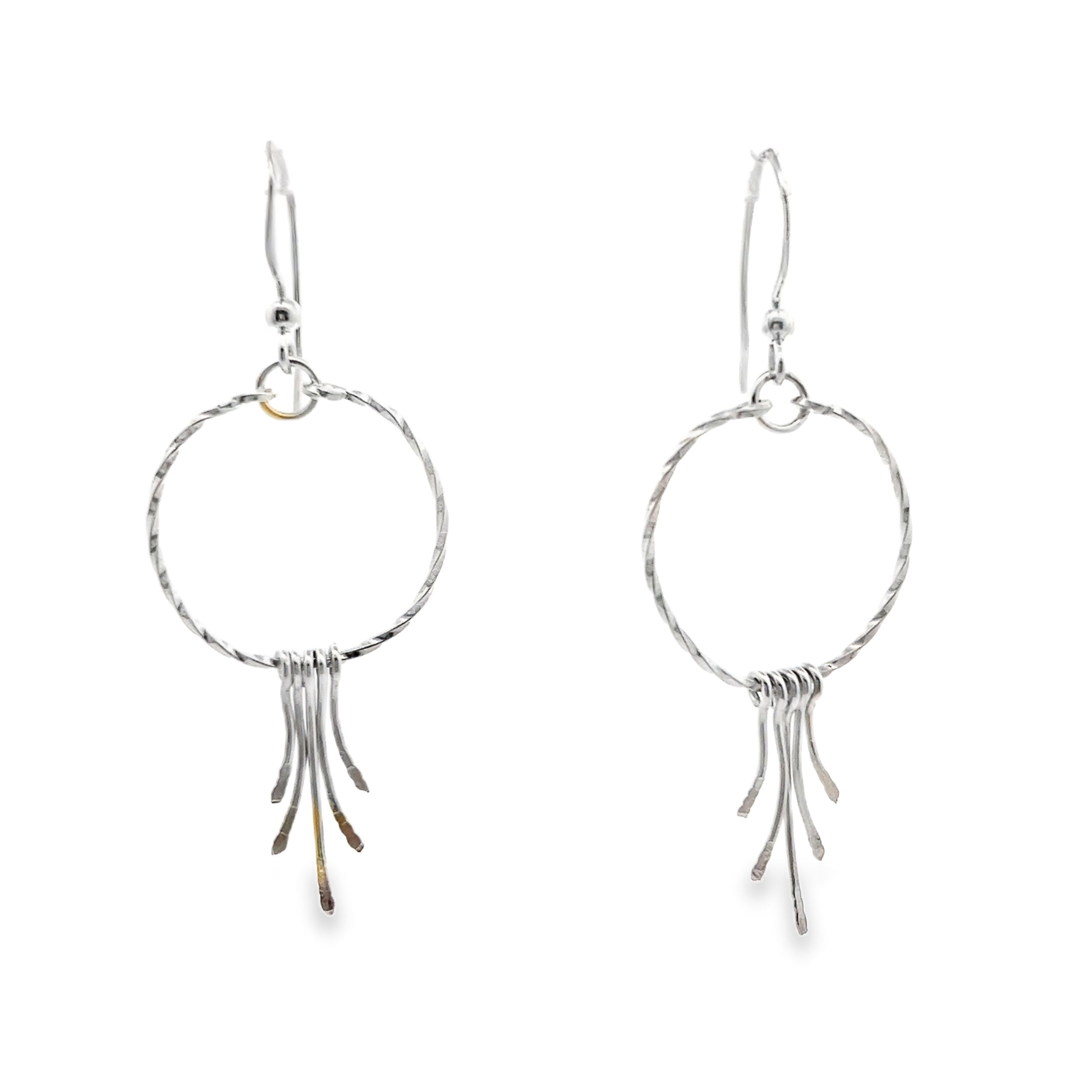These estate earrings are sterling silver earrings with a twisted silver circle with silver bars hanging free flowing from the bottom of the silver circle. They have fish hook style ear wires.