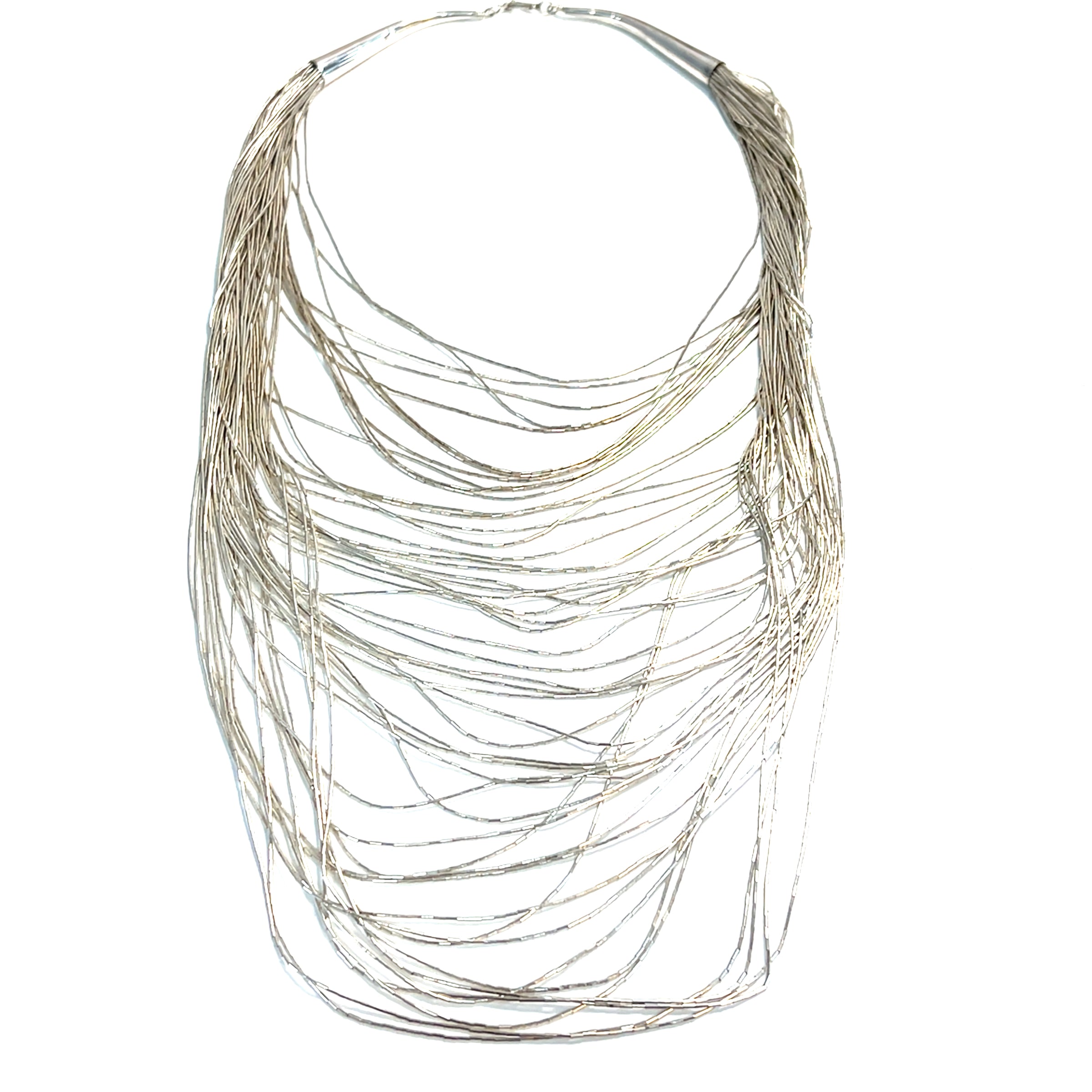 This estate sterling silver necklace has 50 silver strands strung into the silver necklace with lengths from 16-28" long and an S hook clasp in the back.