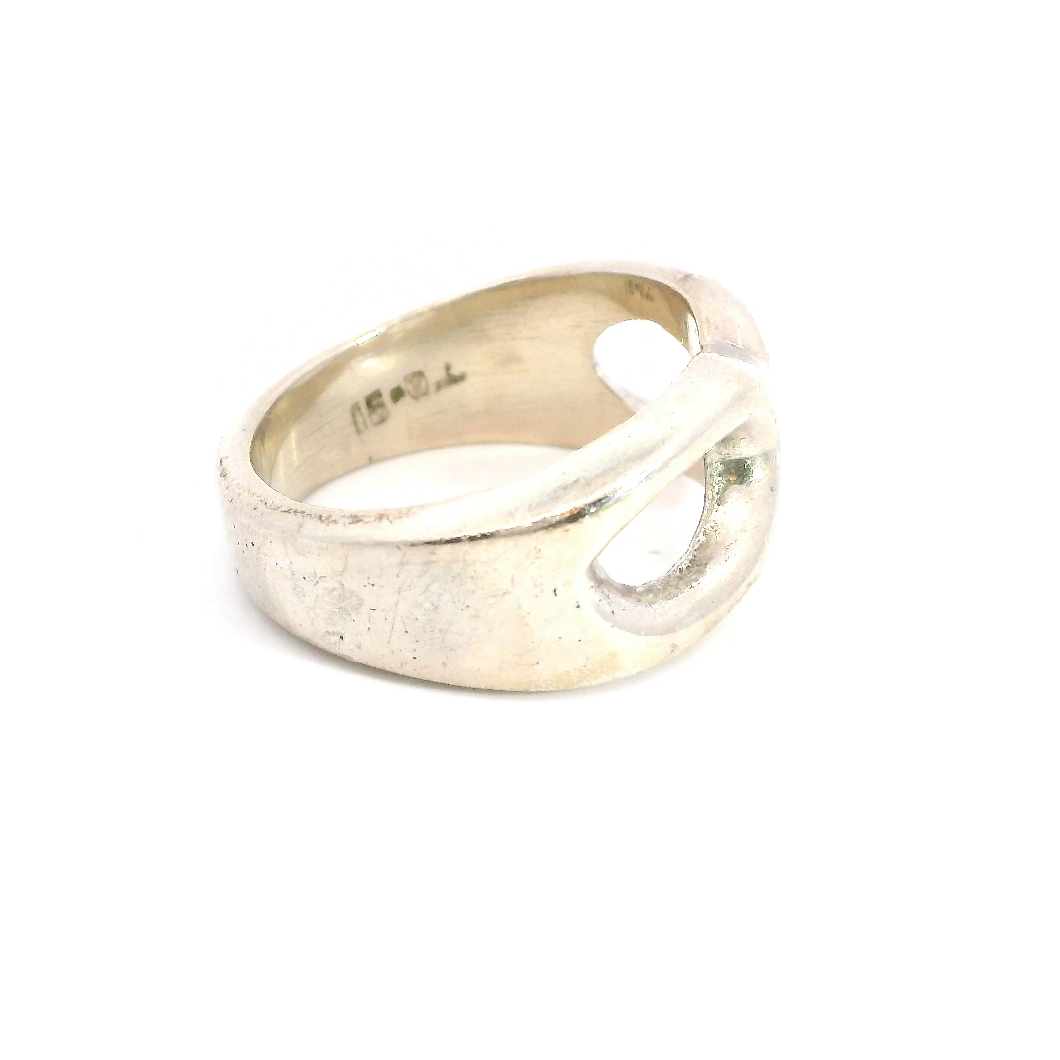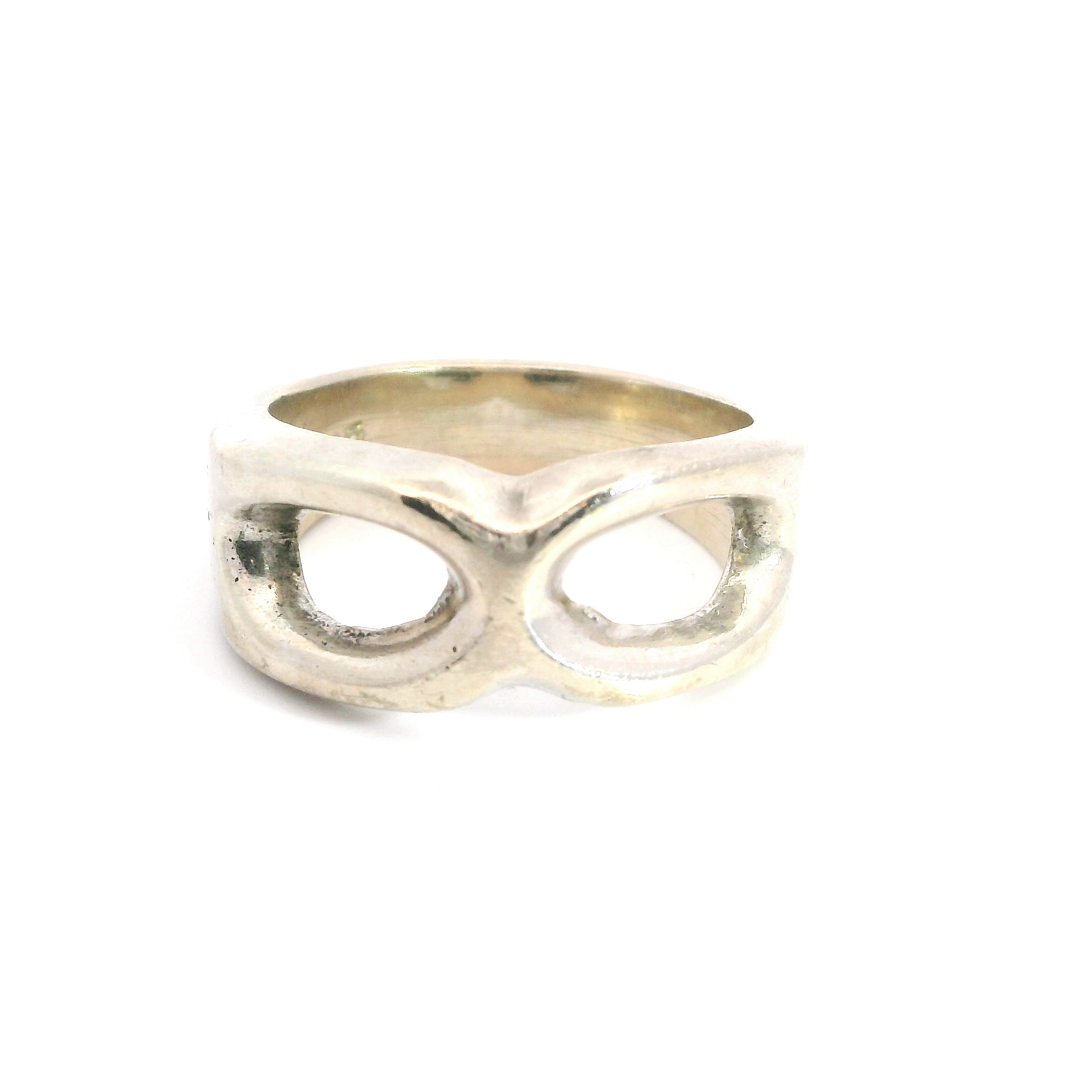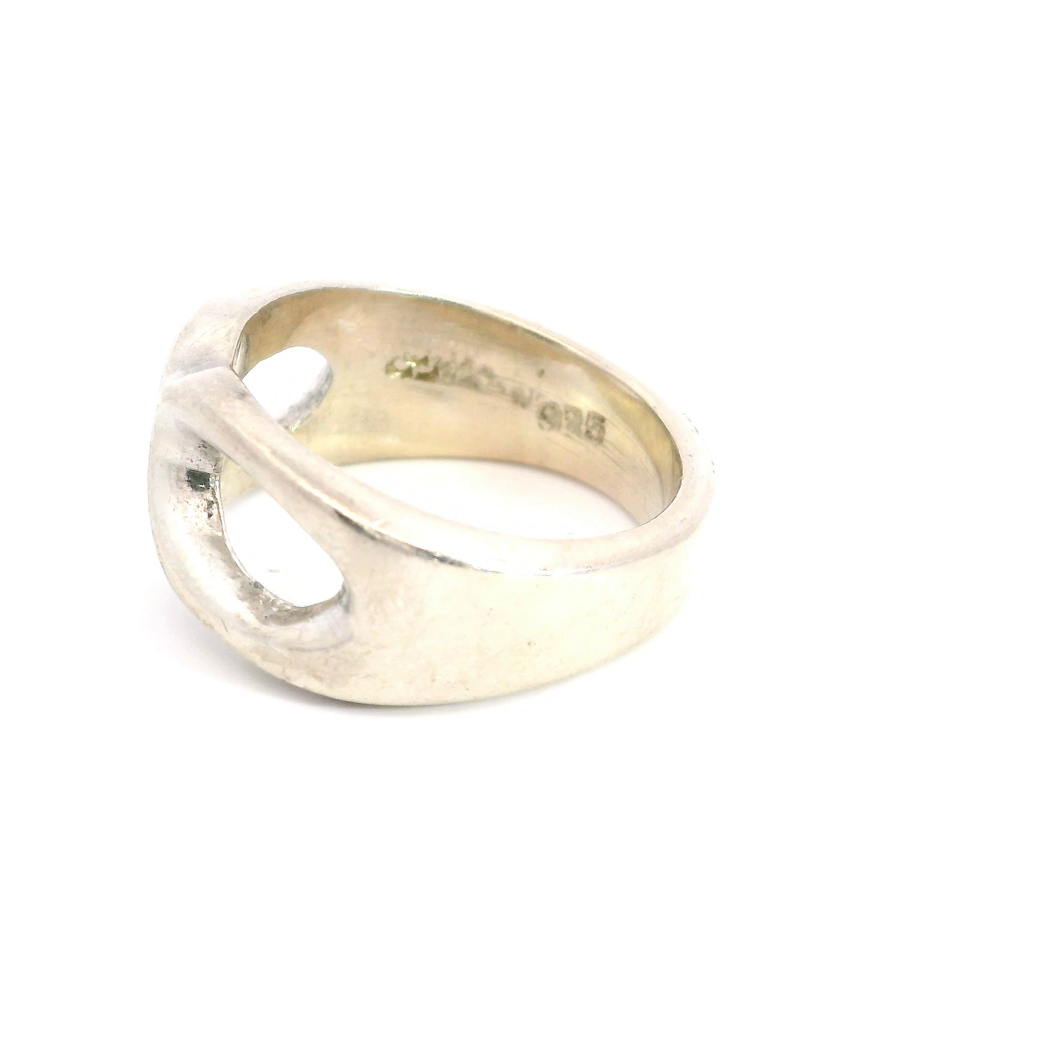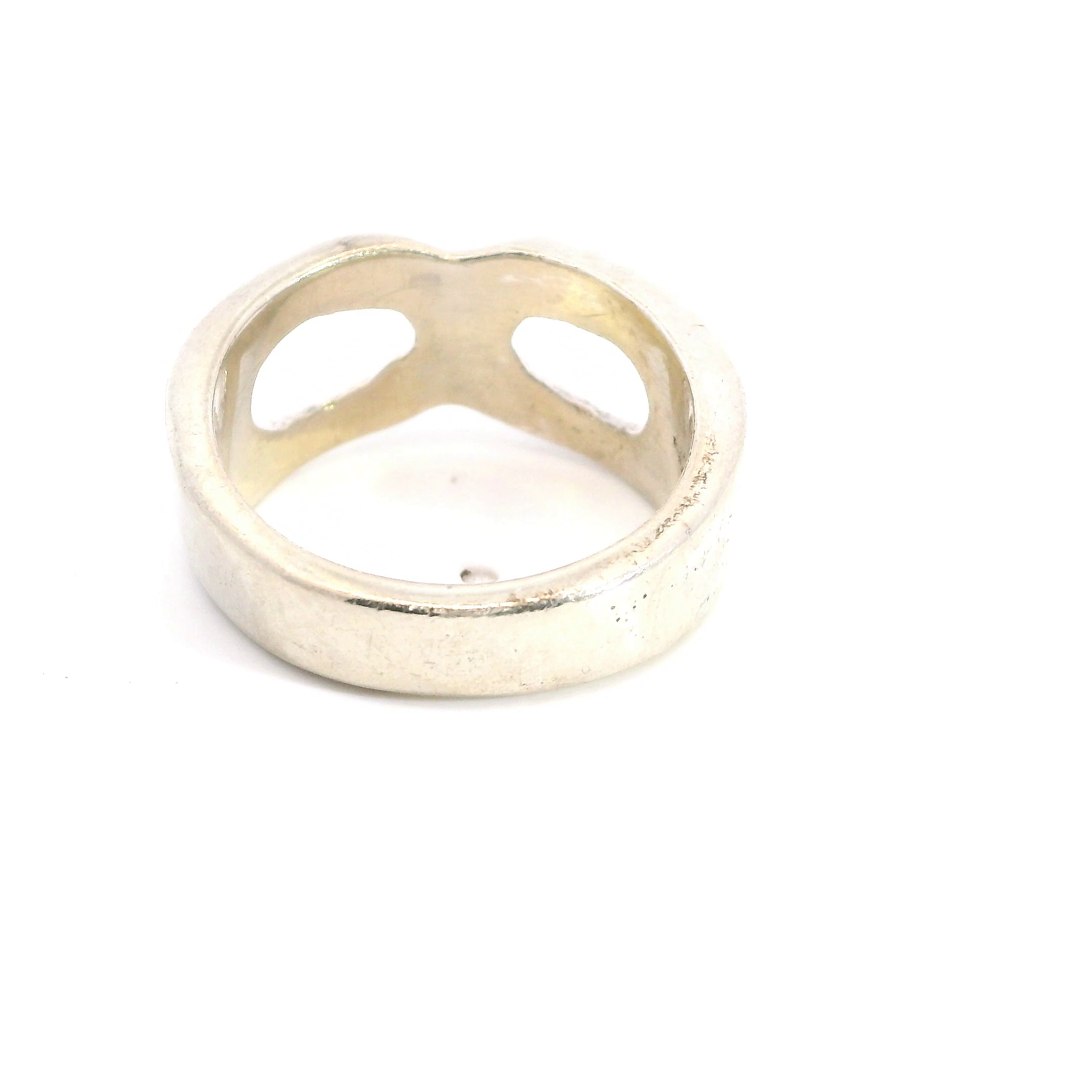 This estate ring is a sterling silver wide band with x design and open center, It is a size 7.5