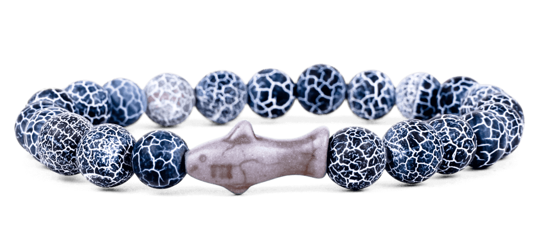 This bracelet is made of blue agate beads with an shark center. The bracelet comes with your own real shark to track!
