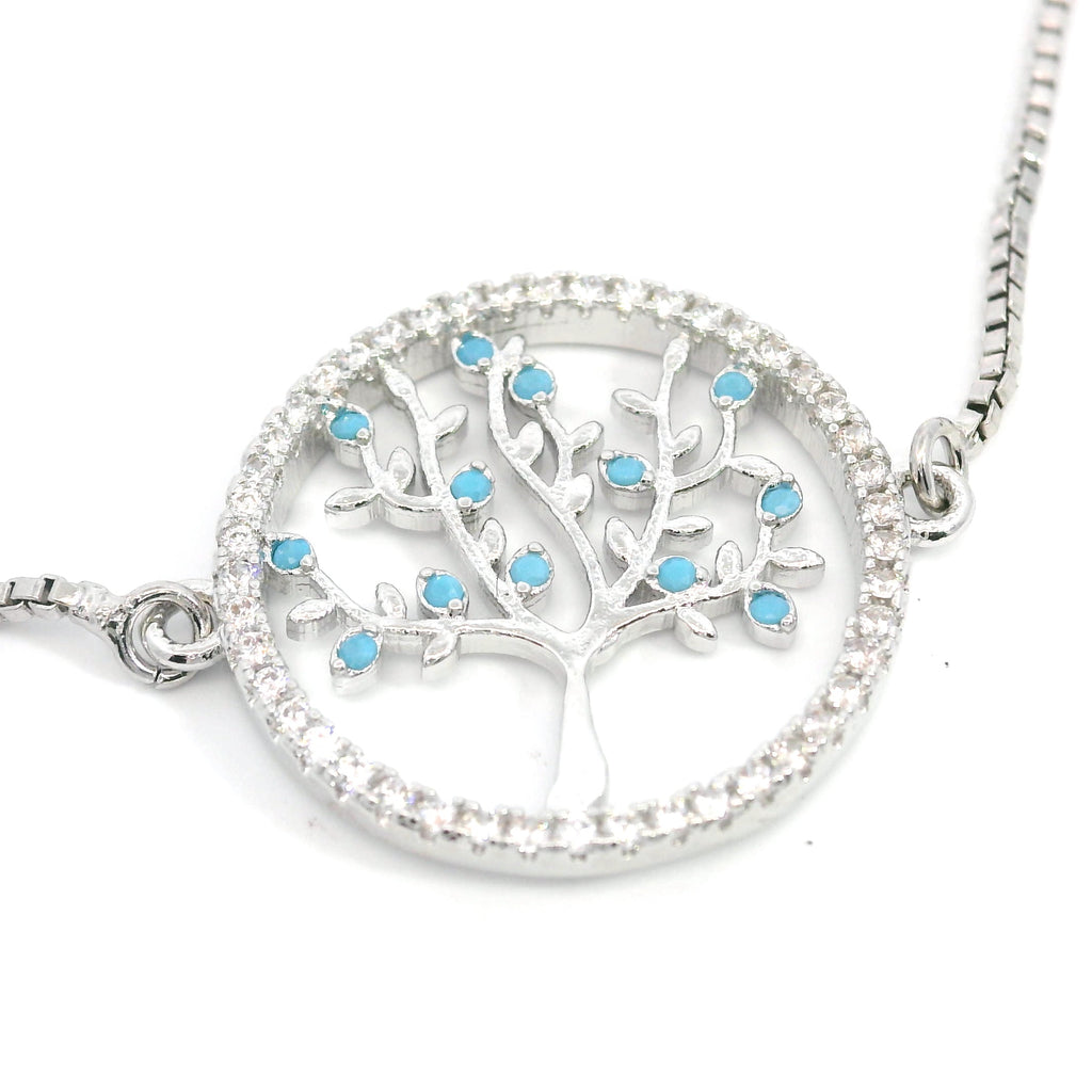 Silver Tone Tree of Live Lariat Style Bracelet with Turquoise & Clear CZ's