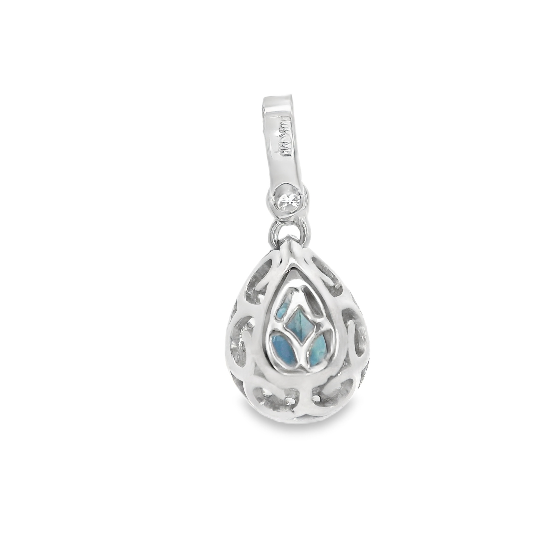 This 10k white gold sapphire & diamond pendant has a 0.54 ct pear shape sapphire prong set in the center surrounded by a halo of diamonds totaling 0.11 ct tw.