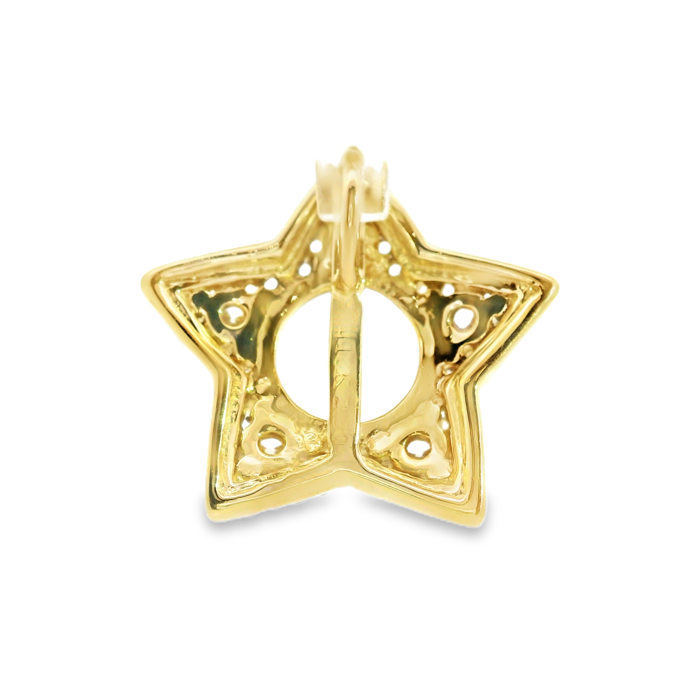 This pendant is an 18k yellow gold star pendant. Set in the center is a round faceted moonstone, 2.30 ct. Set in the points of the stars are 5 chocolate diamonds with white diamonds prong set along the outside of the star. The diamonds total 0.63 ct tw.