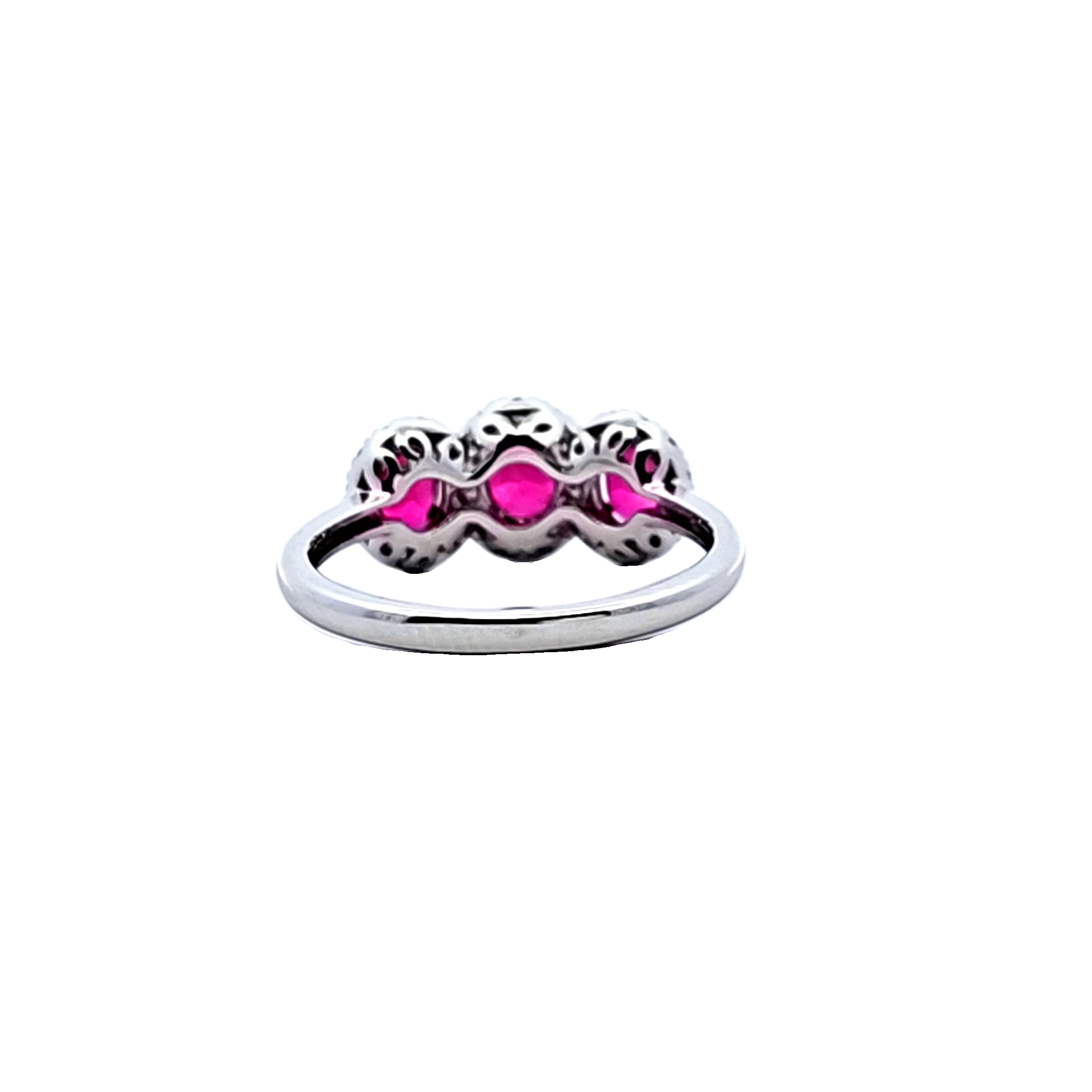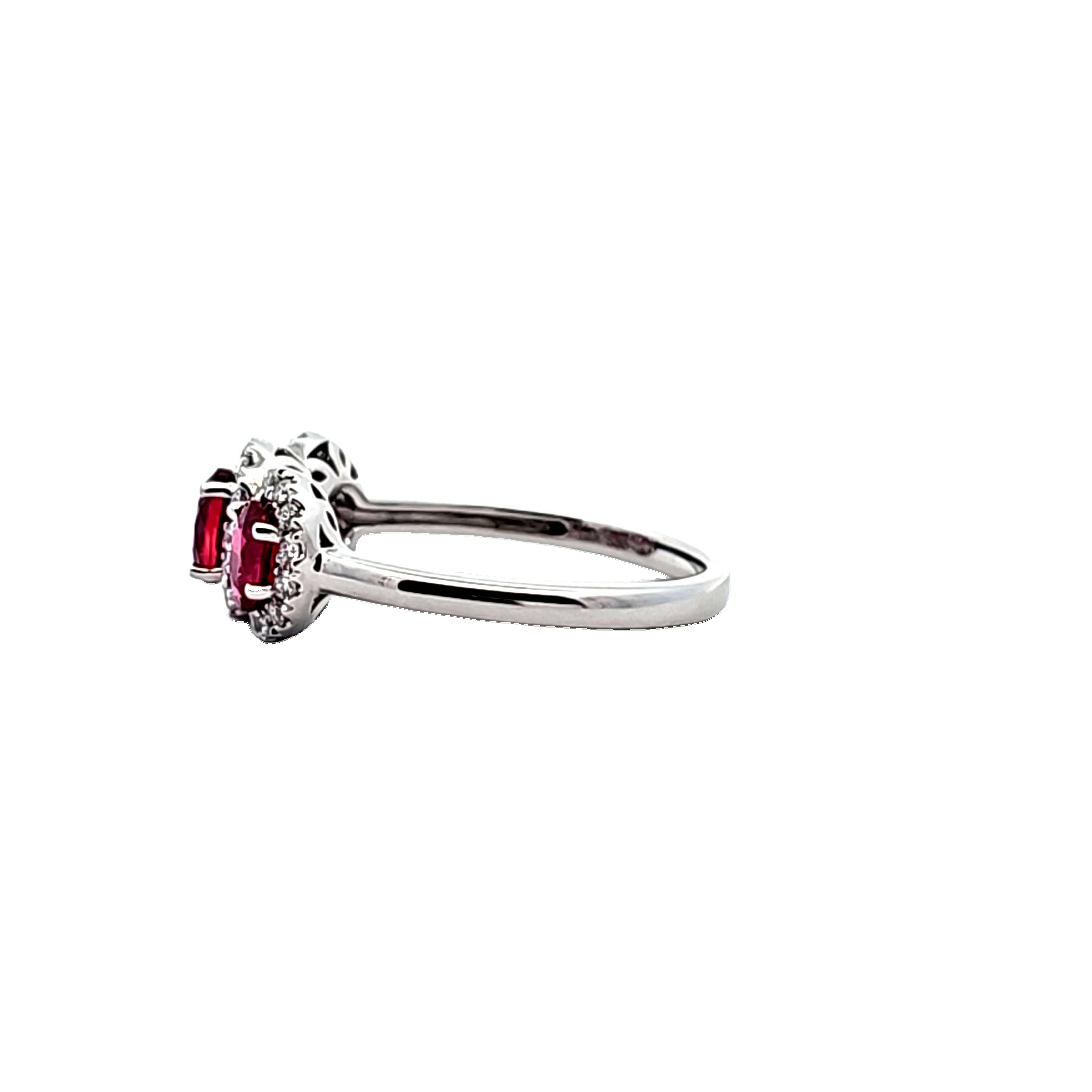 This ring is a beautiful 14k white gold ruby & diamond ring. The ring features 3 oval cut rubies prong set in the band, each surrounded by a halo of diamonds. The 3 rubies total 1.25 ct tw and 32 diamonds total 0.25 ct tw. Size 7