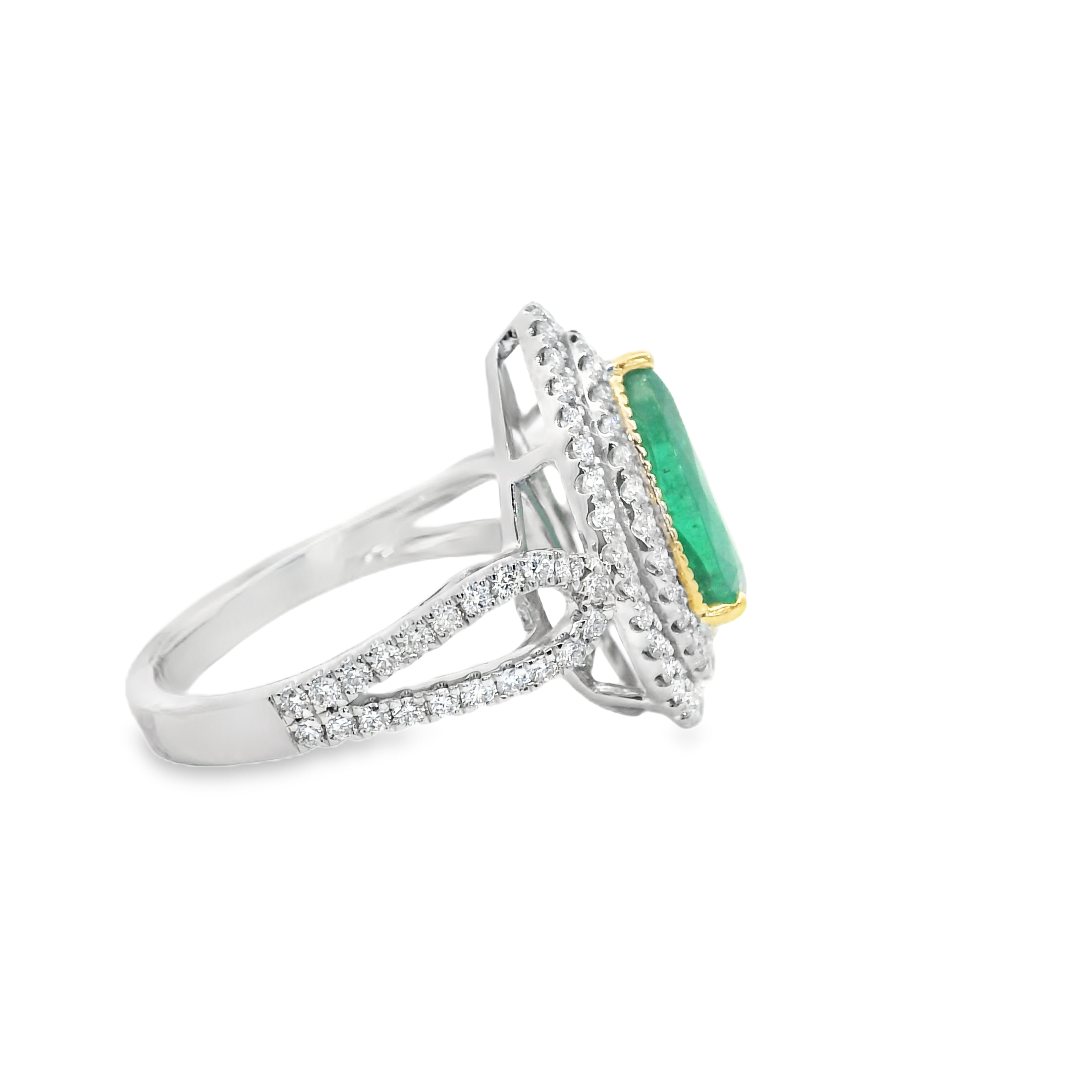 This gorgeous ring is a Platinum Emerald & Diamond Ring. The center emerald is a pear shape that is 2.10 CT, AA quality, beautiful color and moderately included. The emerald has a yellow gold bezel with beaded accent. It is surrounded by a double halo of diamonds with diamonds also set in a split shank in the band. The diamonds total 0.72 CT TW.