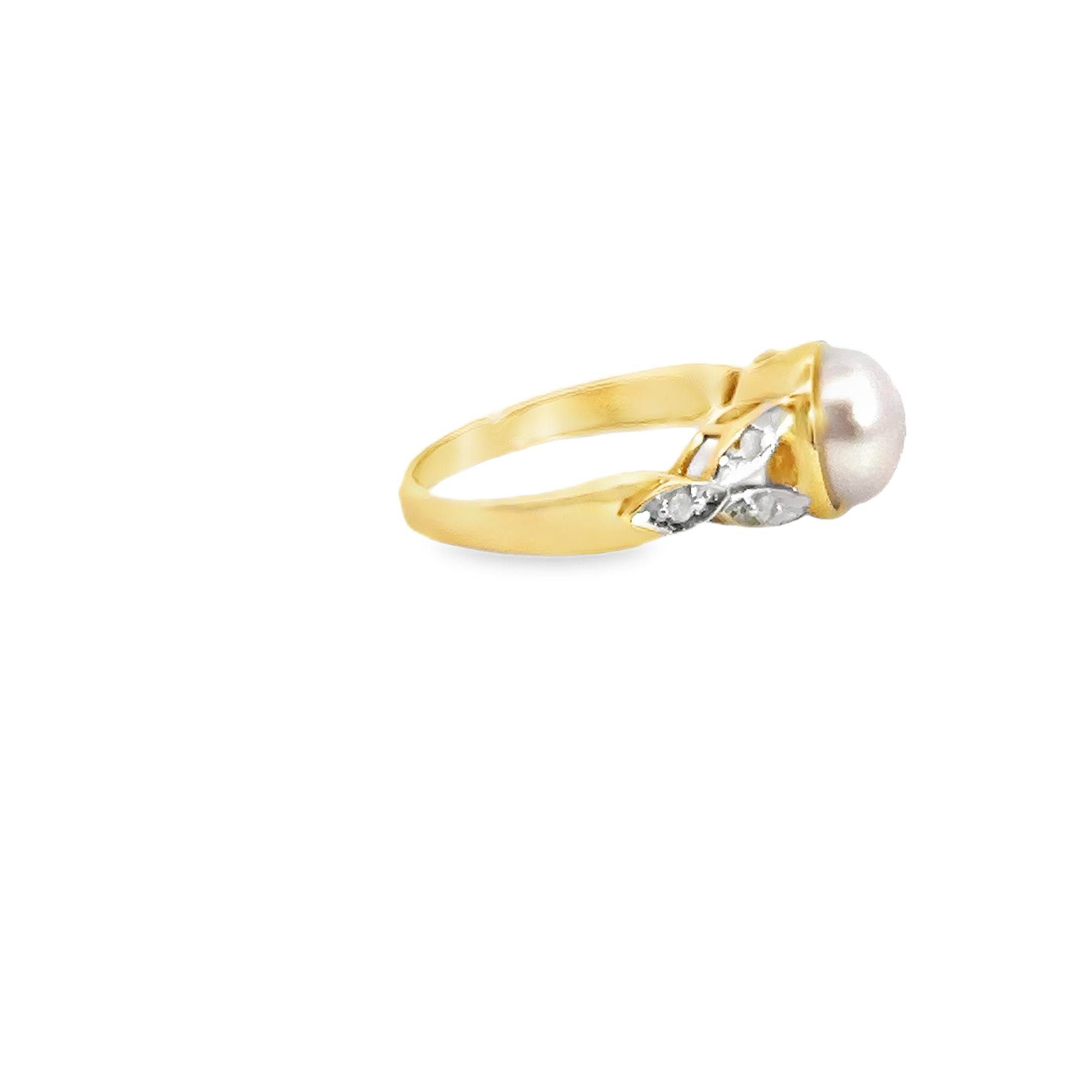 This estate ring is 14l yellow gold with a 8 mm white button pearl set at the center. The sides of the band have a leaf design with diamond accents. Size 7