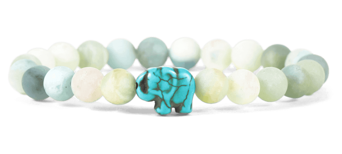 This stretch Fahlo bracelet in sky stone with elephant center detail comes with it's own real live elephant to track!