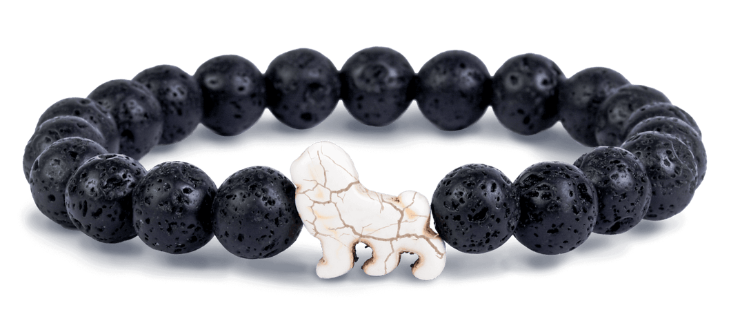 This stretch Fahlo bracelet in lava rock with lion center detail comes with it's own real live lion to track!