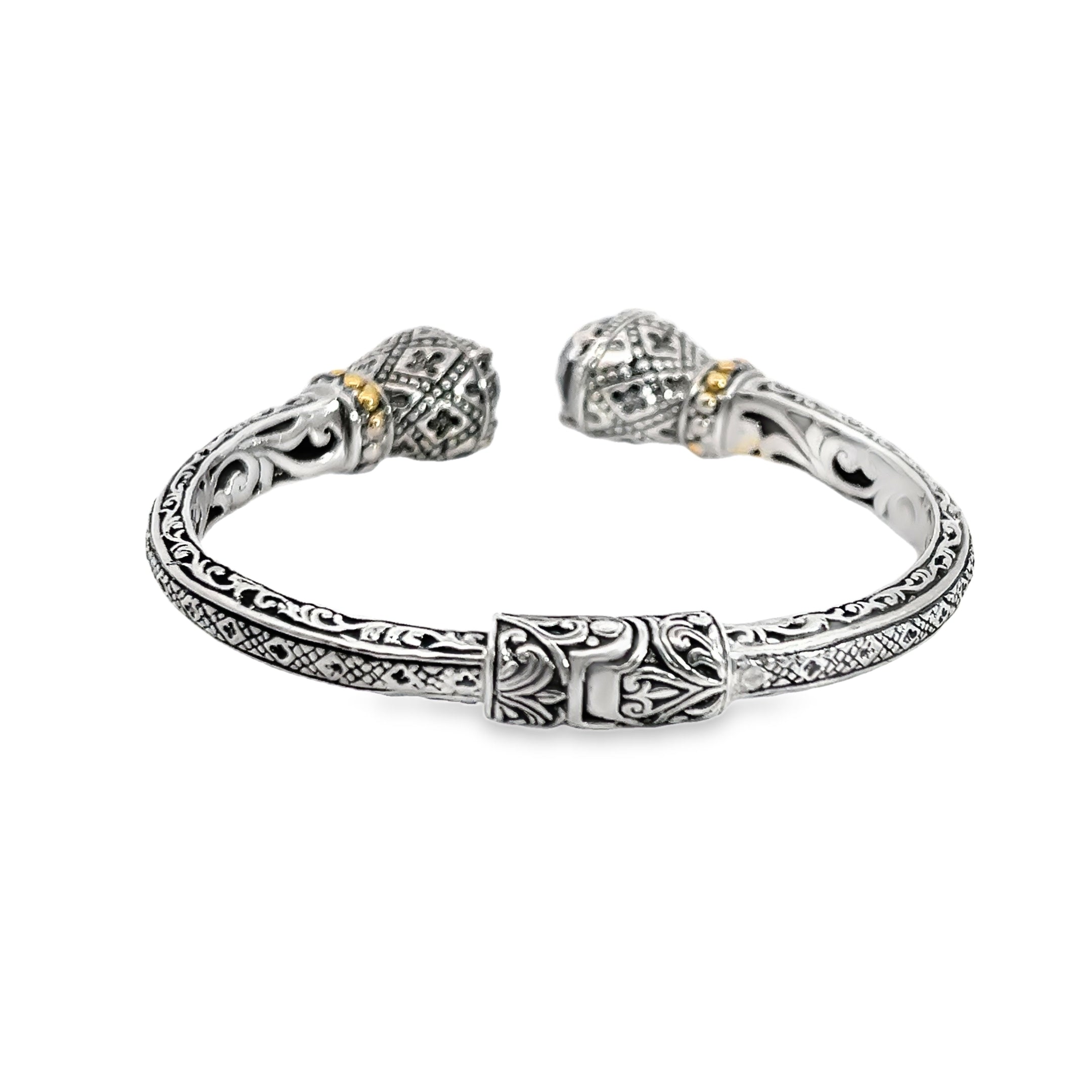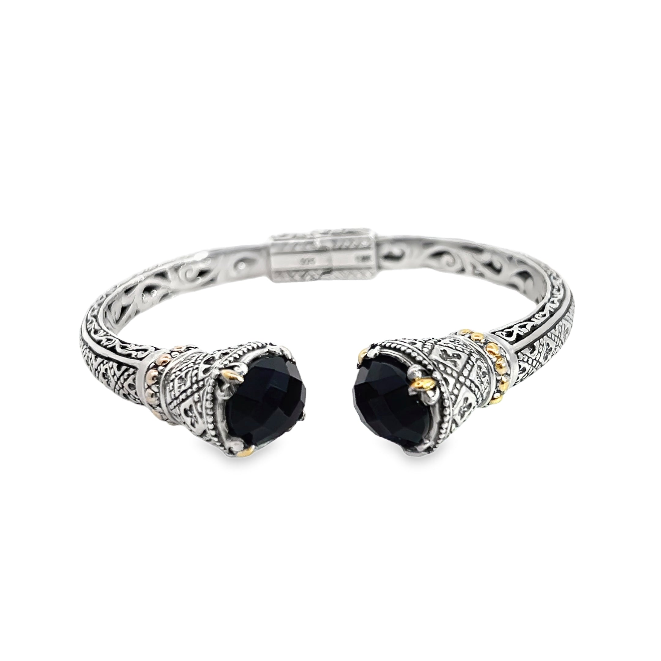 This cuff style bracelet is sterling silver with 18k yellow gold detailing and faceted black onyx in the ends of the cuff, The bracelet has bali style detailing throughout.