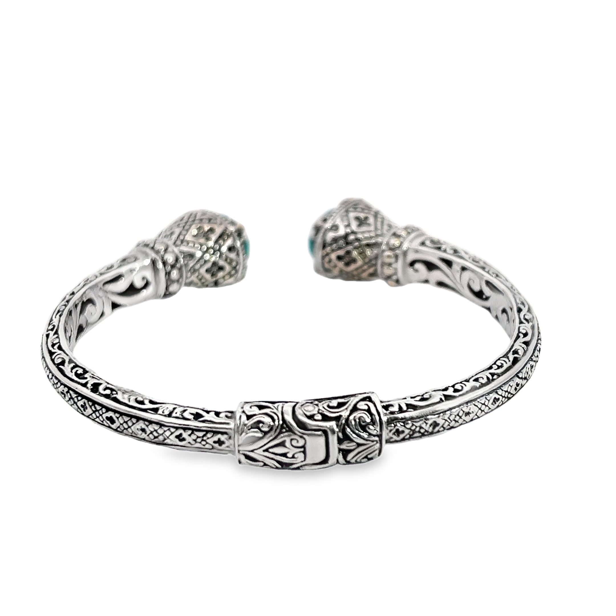 This cuff style bracelet is sterling silver with 18k yellow gold detailing and turquoise stones set in the ends of the cuff, The bracelet has bali style detailing throughout.