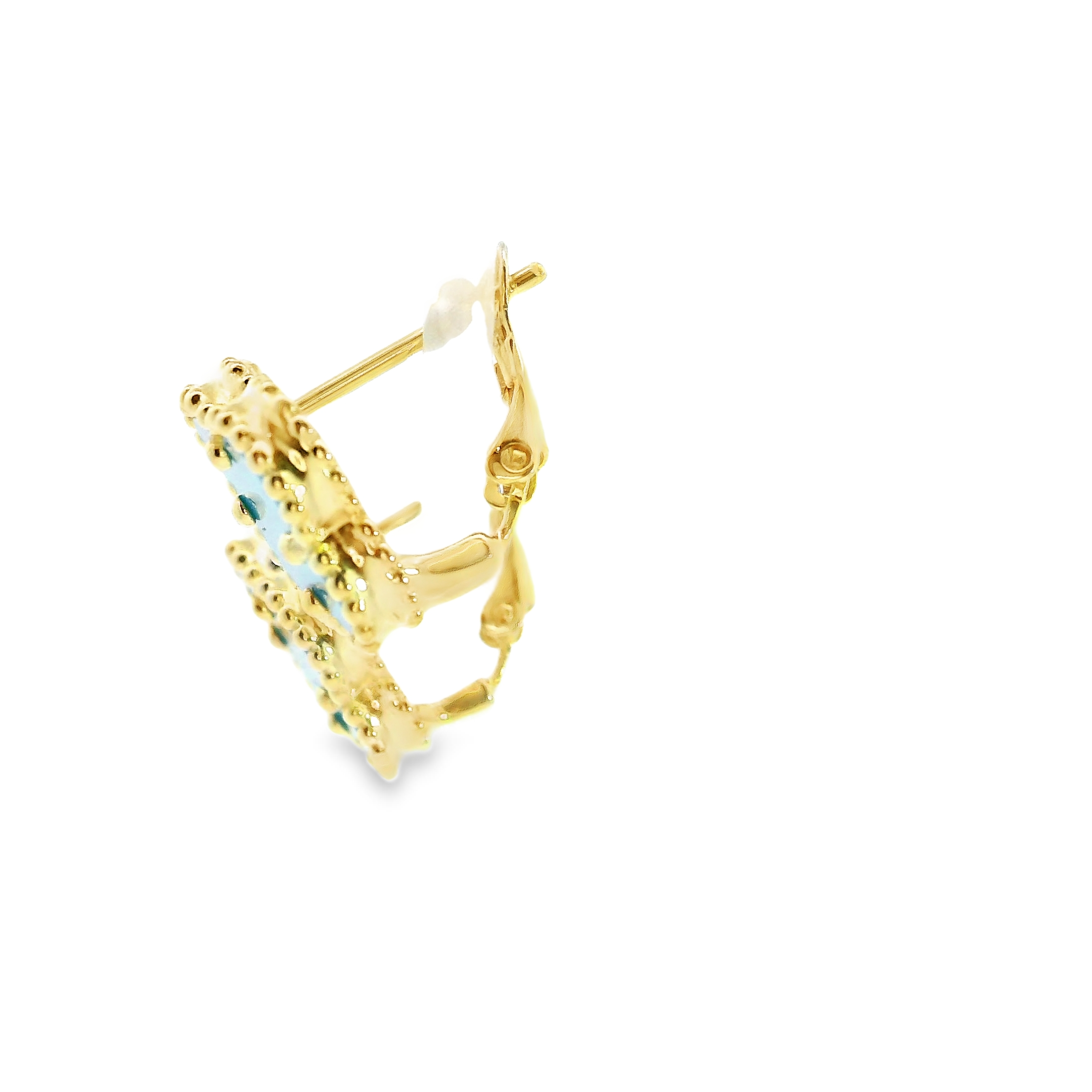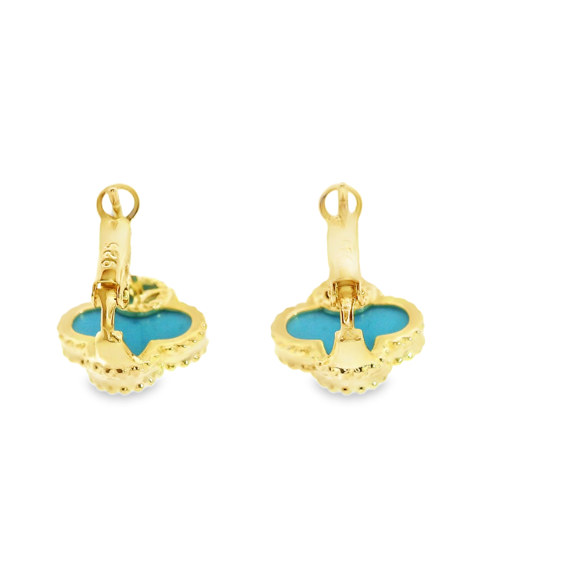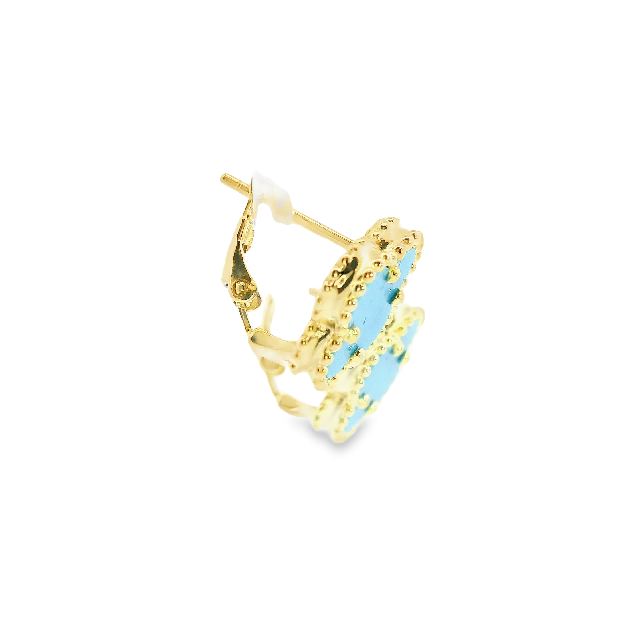 These clover style earrings are sterling silver with yellow gold plating and clover shaped turquoise set in the center of the clover. They have omega clip style backs.