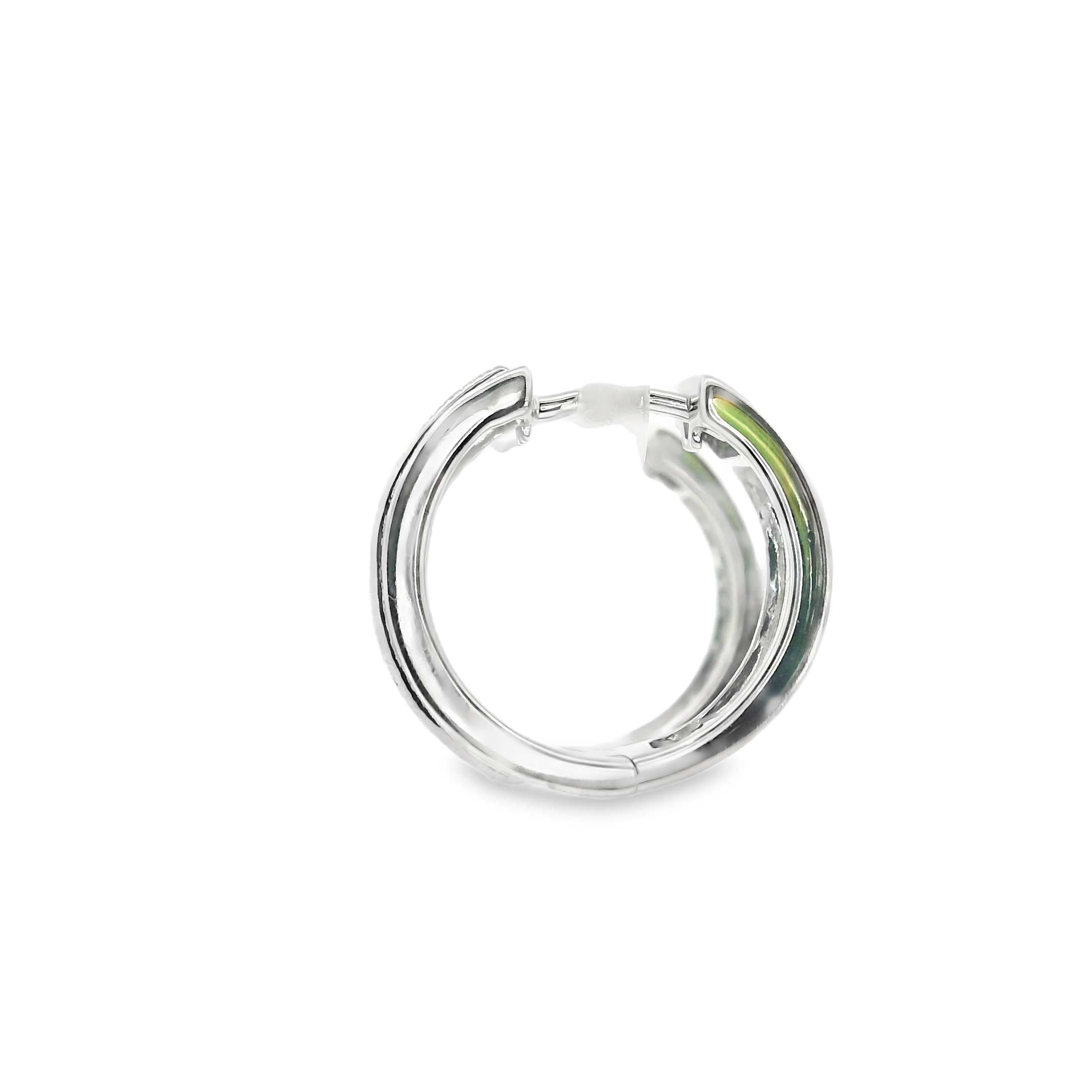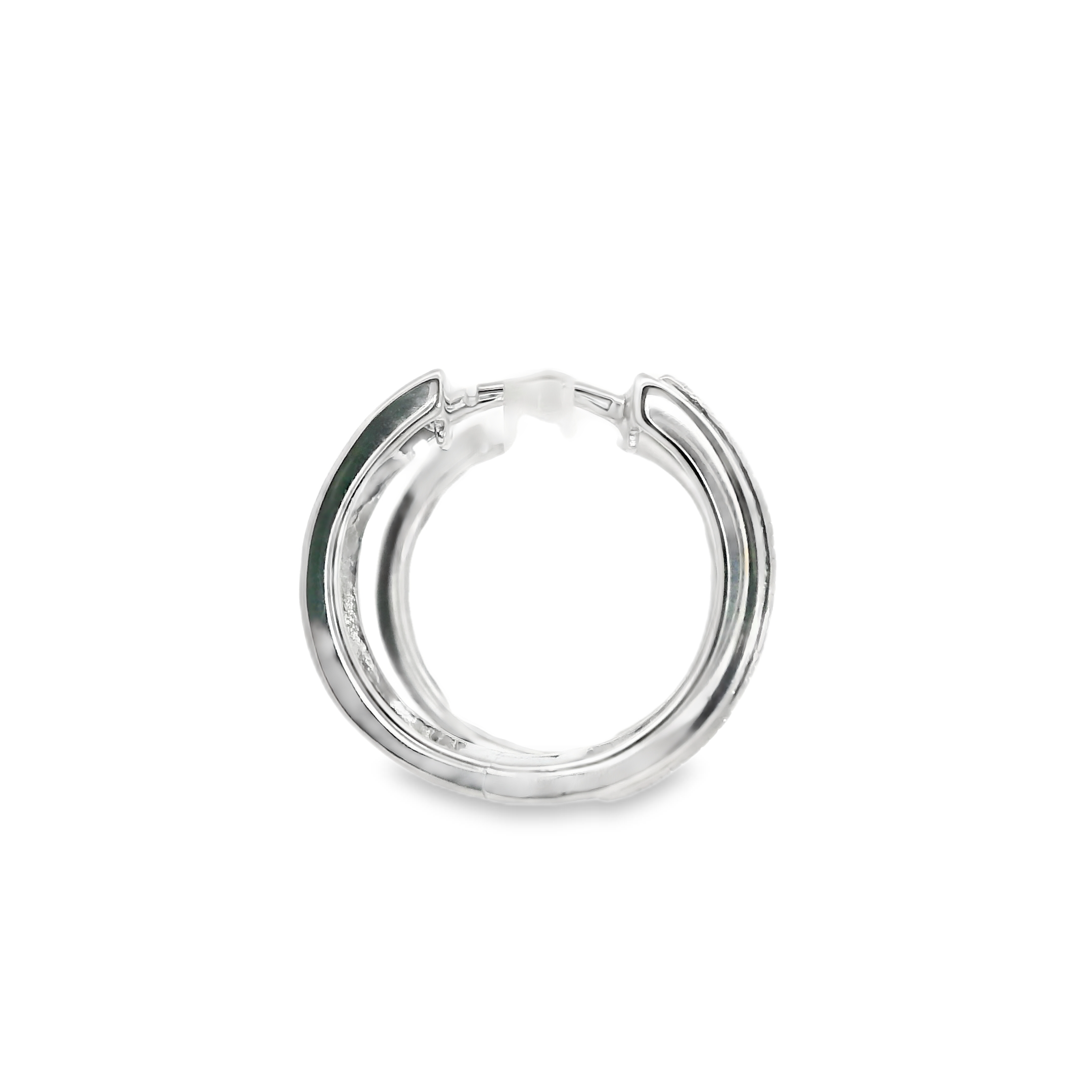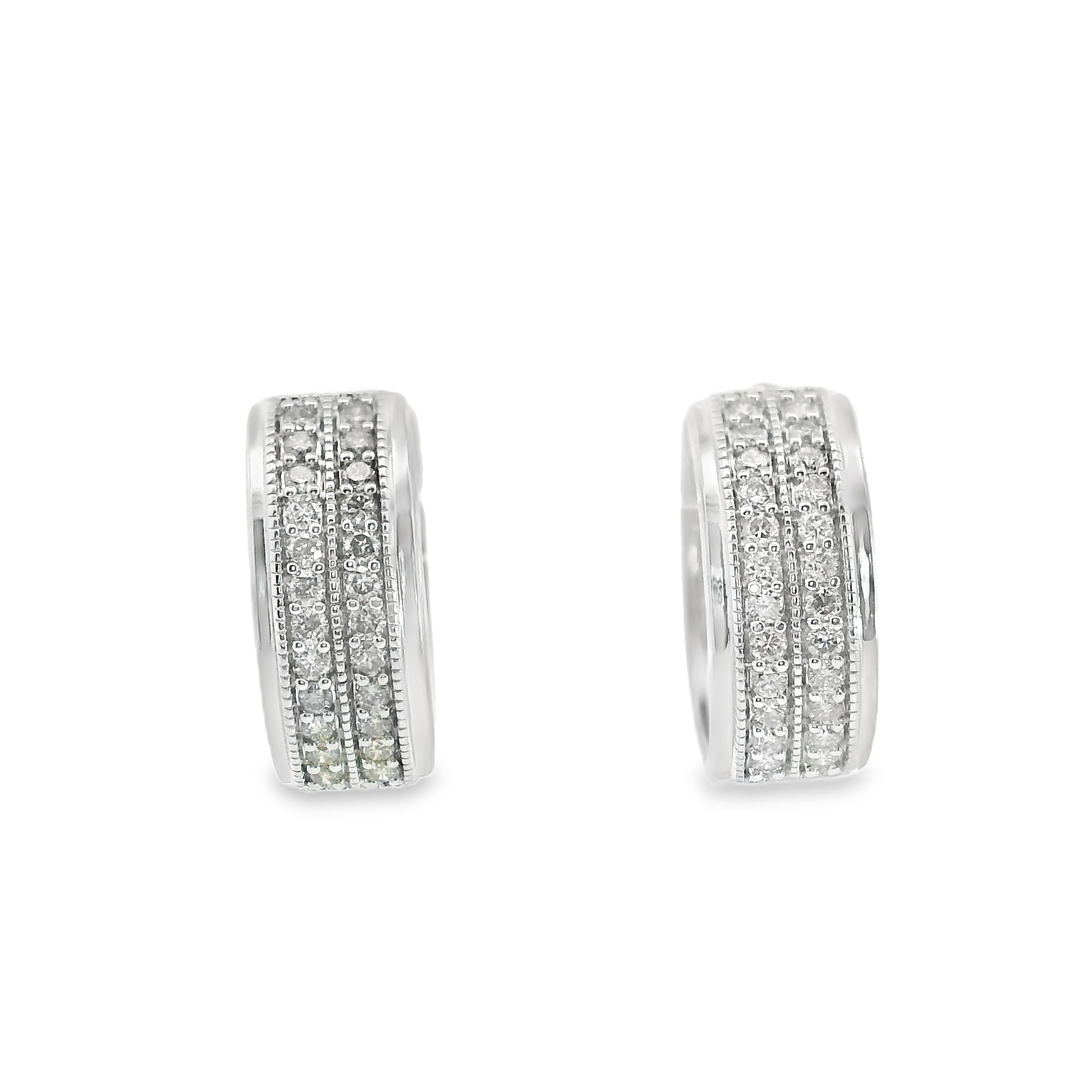 These sterling silver hoop earrings are small huggie style hoops wit 2 rows of diamonds prong set across the front of the hoop totaling 0.50 ct tw.