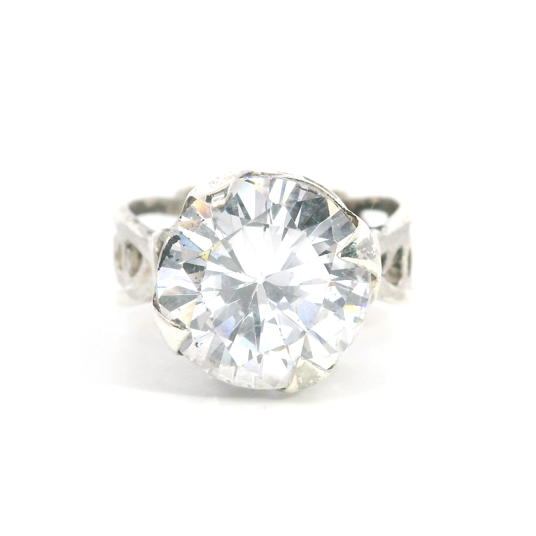 This estate ring is a sterling silver ring with a large 12mm CZ prong set in the center of the open swirl style band. It is a size 6.5