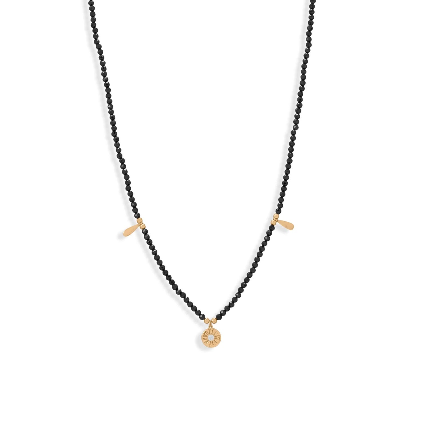 Neutral tones with pops of gold, perfect for everyday wear. 16" + 2" black spinel beaded necklace features 14 karat gold plated sterling silver beads and charms. Spinel beads are 2.4mm, gold pear drops are 2.8mm and 8.9mm, and CZ star charm is 7.8mm with 2.5mm CZ. Necklace features a lobster clasp closure.