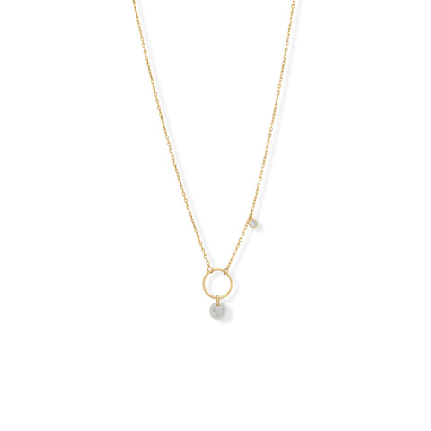 A darling necklace! 16" + 2" 14 karat gold plated sterling silver necklace features a 2mm offset CZ charm and circle drop with a 6mm faceted rainbow moonstone drops. Necklace is finished with a lobster clasp closure.