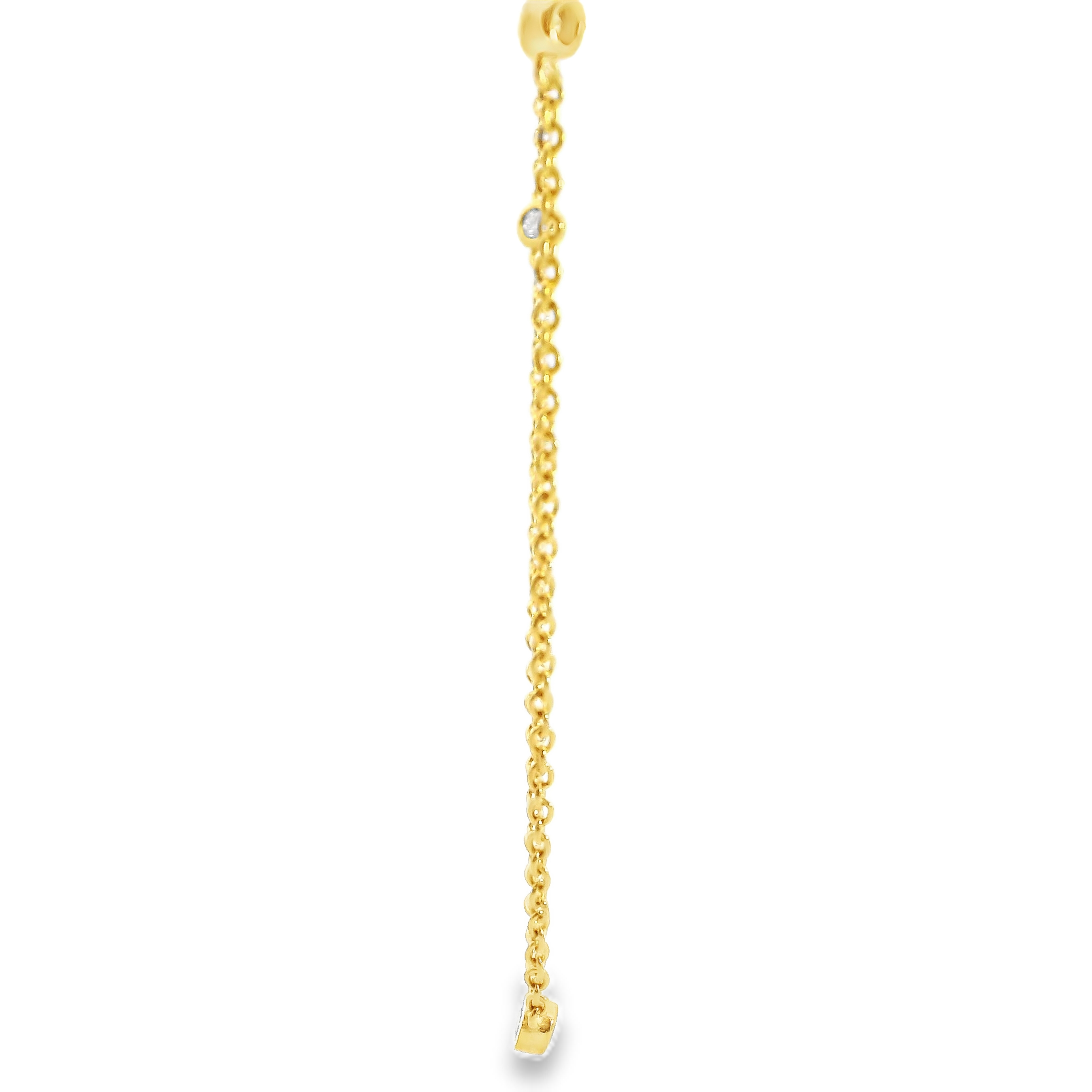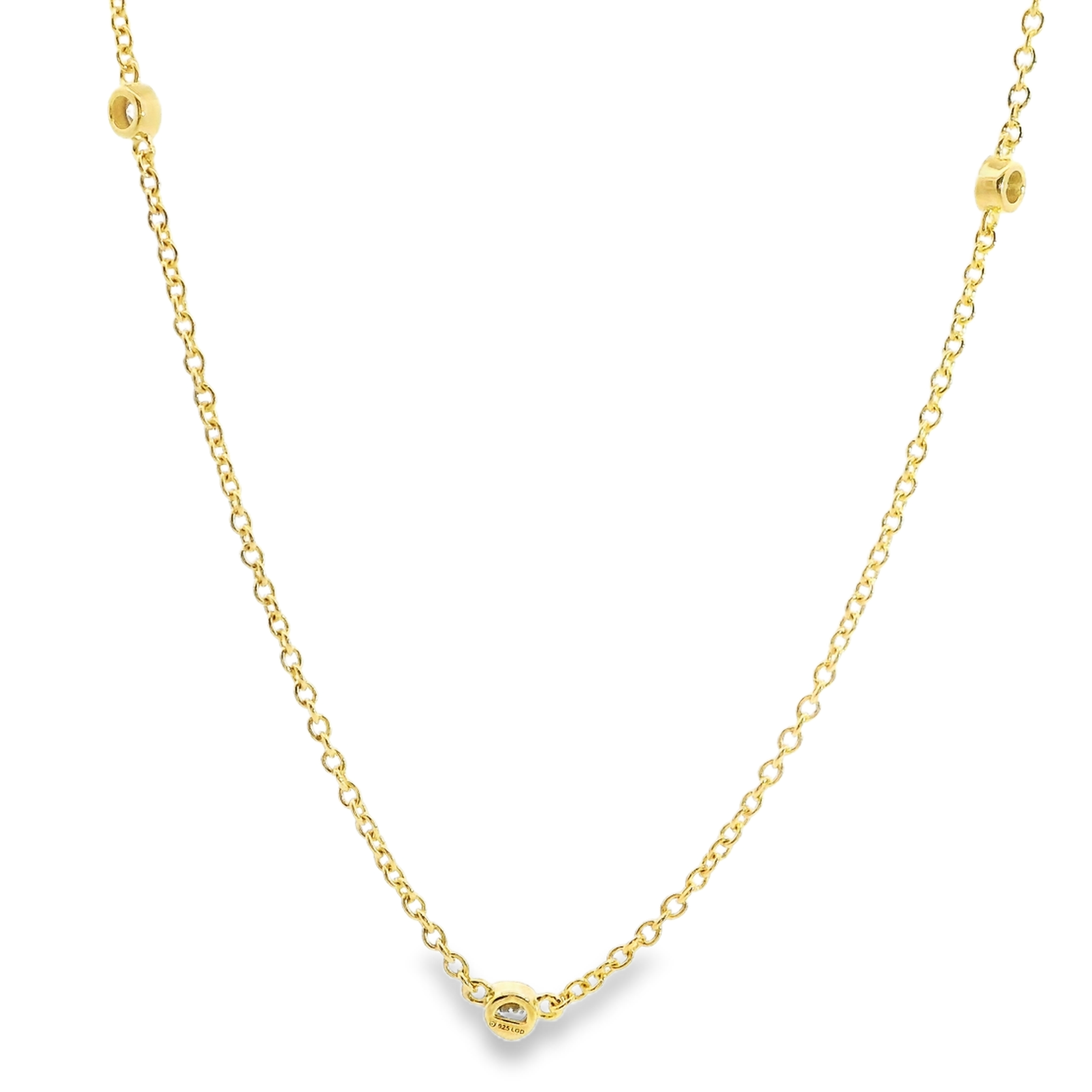 This necklace is sterling silver with yellow gold plating and 5 LAB GROWN DIAMOND stations bezel set in the chain. The diamonds total 0.33 CT TW. The necklace is 18-20" adjustable in length