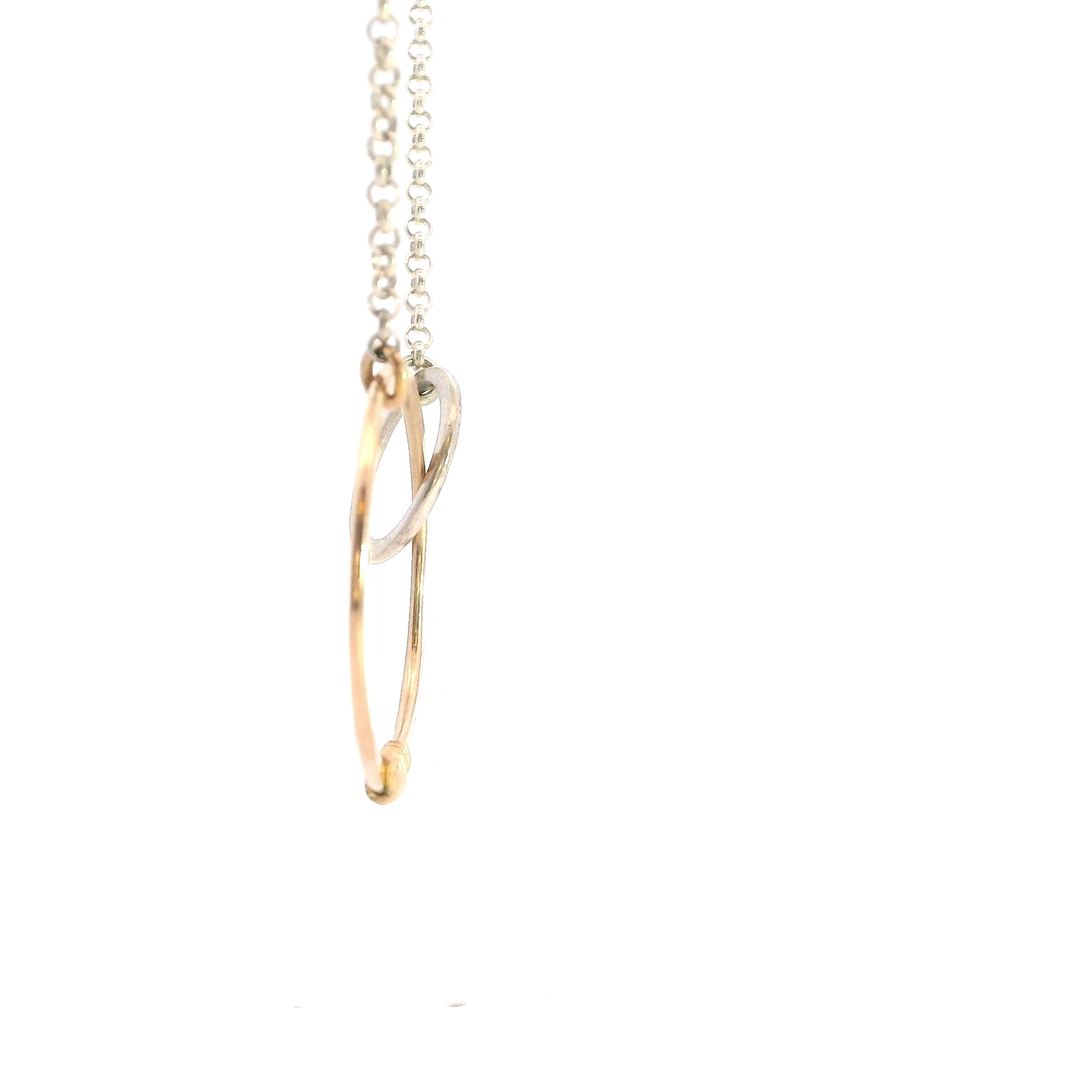 This estate necklace is sterling silver with 2 different size circles at the center, one silver one gold tone, set on a cable link chain with spring ring clasp. The necklace is 18" long and 1.5mm wide,