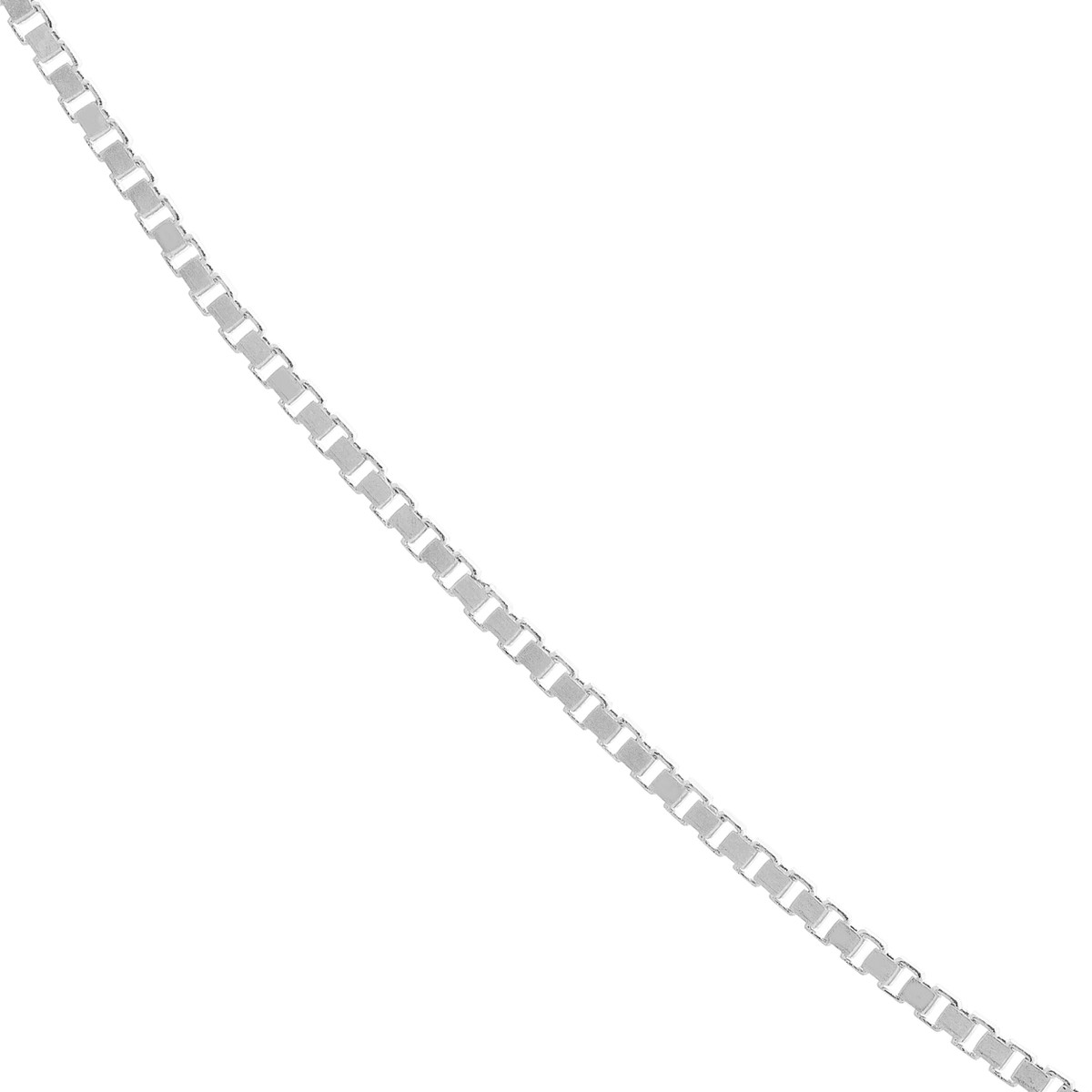 This chain is a 10k white gold box chain. It is 0.55mm wide and 18" long with a lobster clasp.