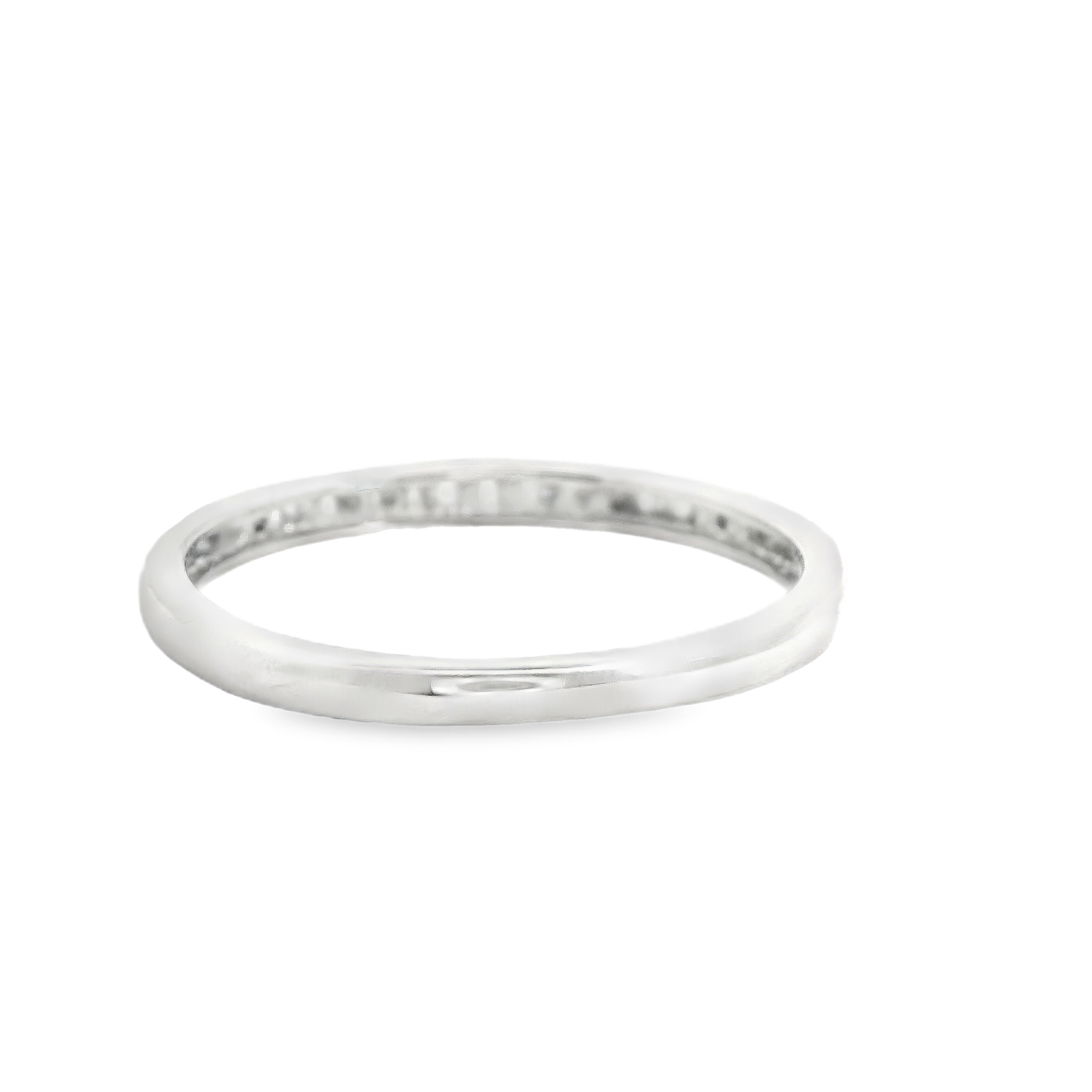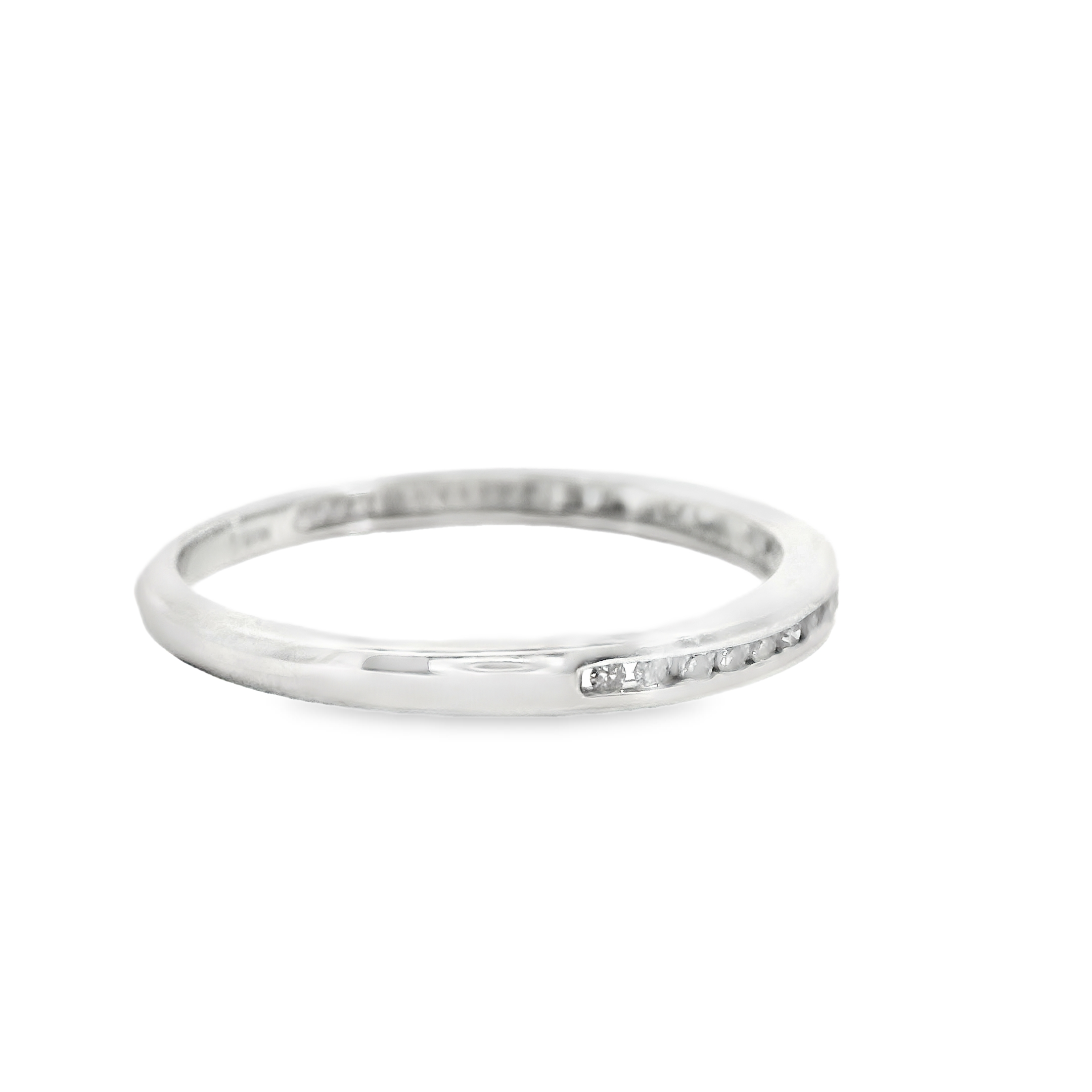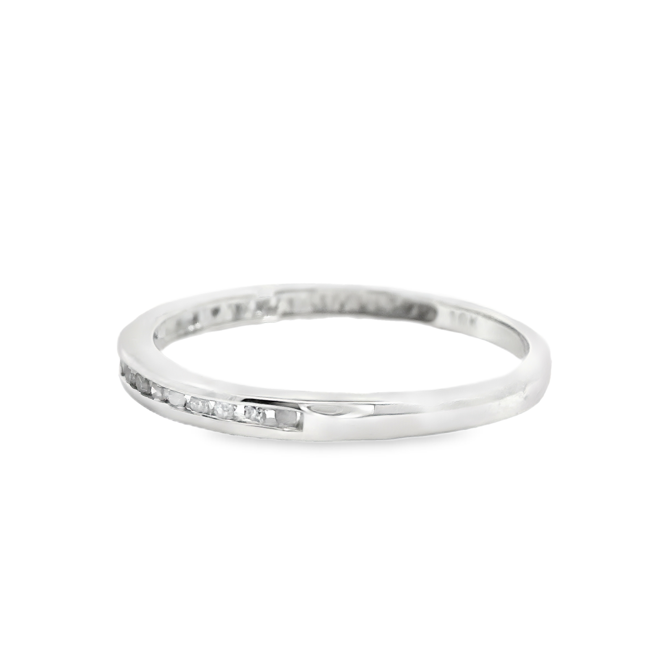 10K WG Channel Set Diamond Band This ring is a 10k white gold band with round diamonds channel set across the top of the band totaling 0.10 ct tw. The ring is a size 7 currently.