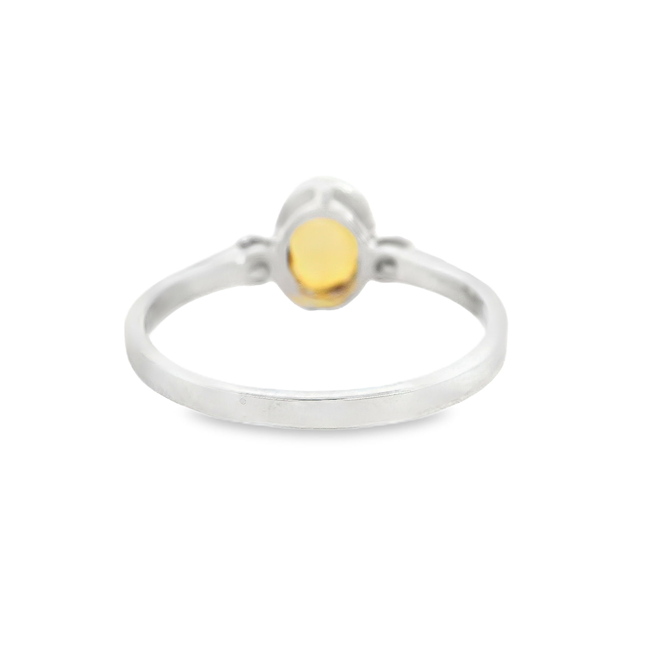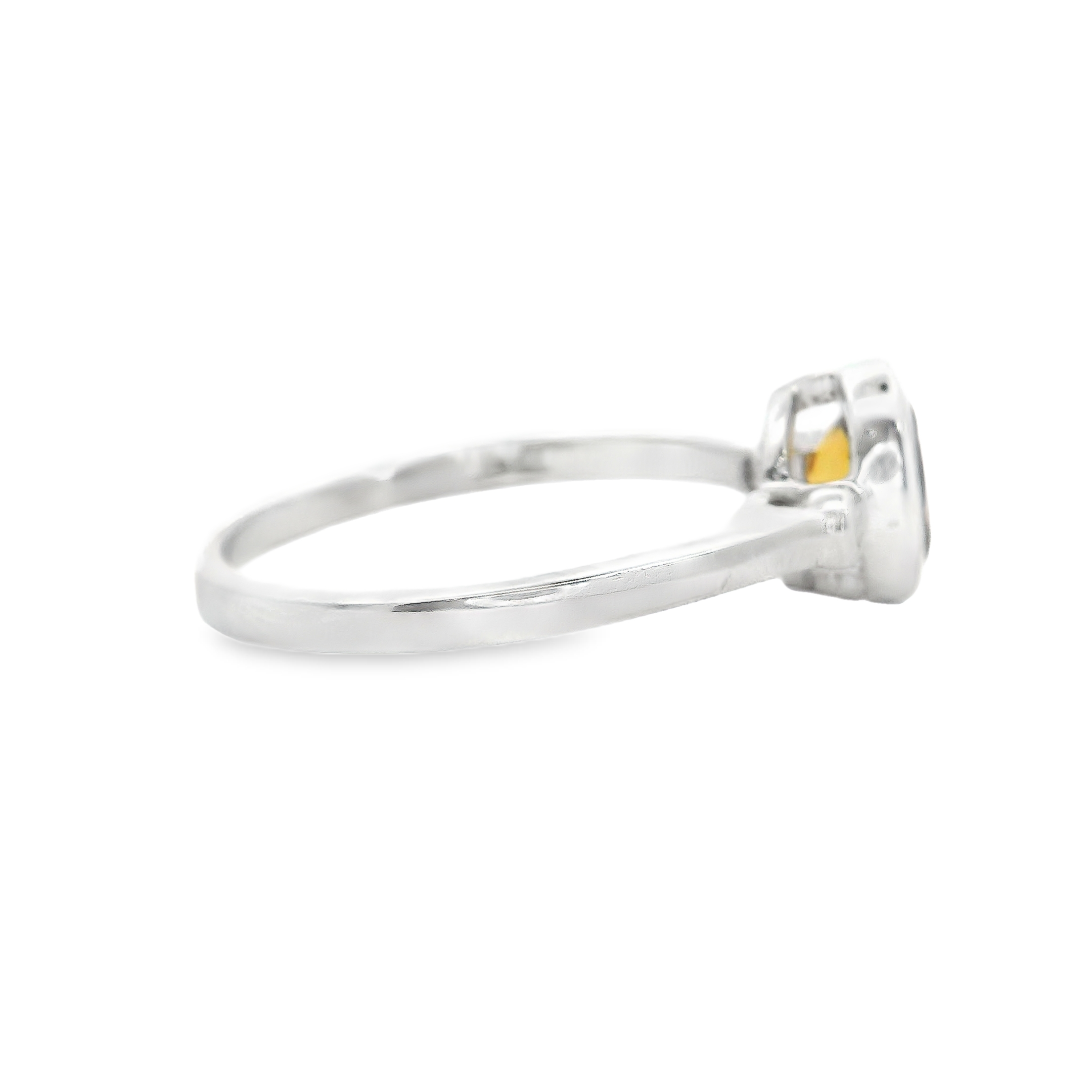 A 10k white gold citrine & diamond ring. The center stone is an oval cut citrine that is 0.68 ct bezel set. It is flanked on either side by a bezel set diamond. Diamonds total 0.02 CT TW.