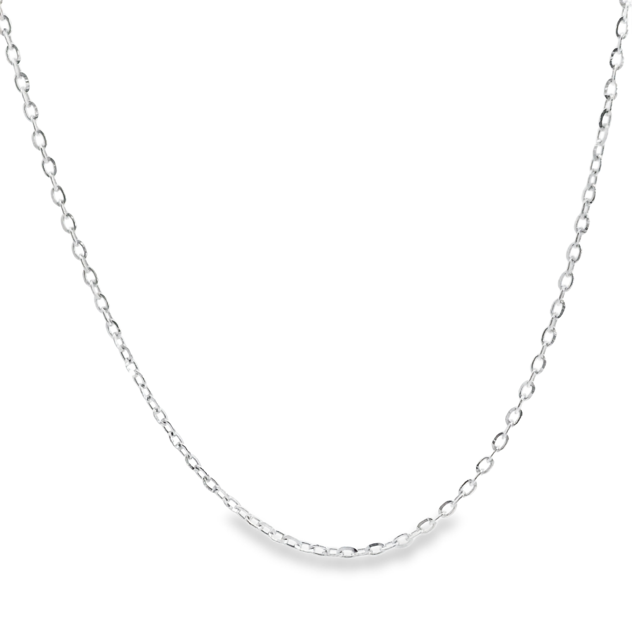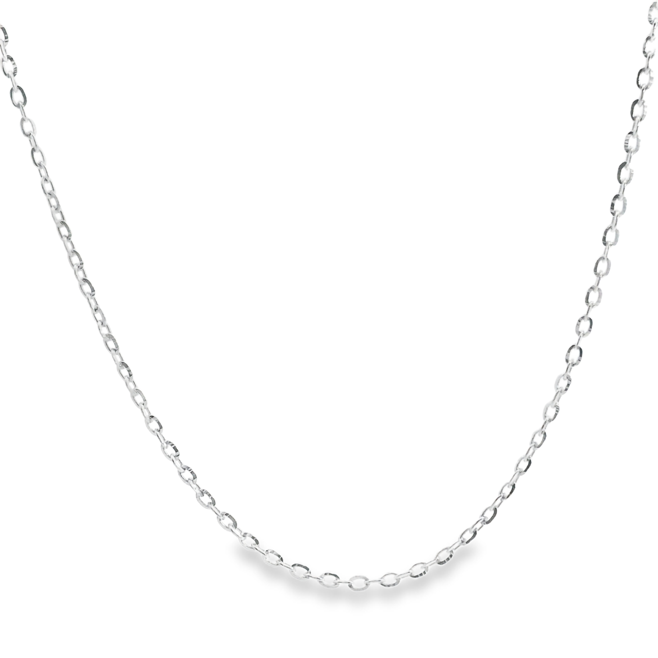 This chain is a 10k white gold diamond cut cable chain that is 1.65mm wide and 16" long with a lobster style clasp.