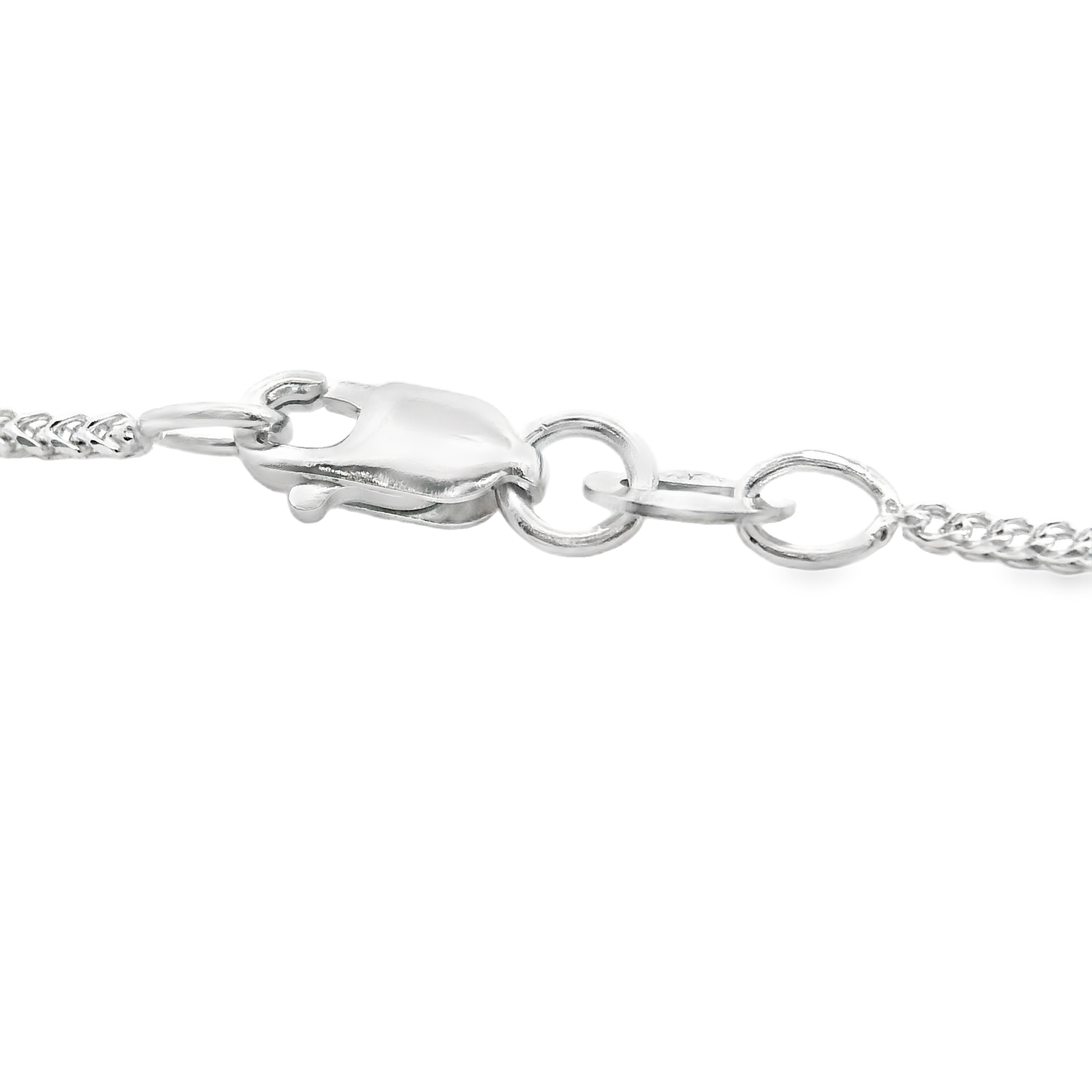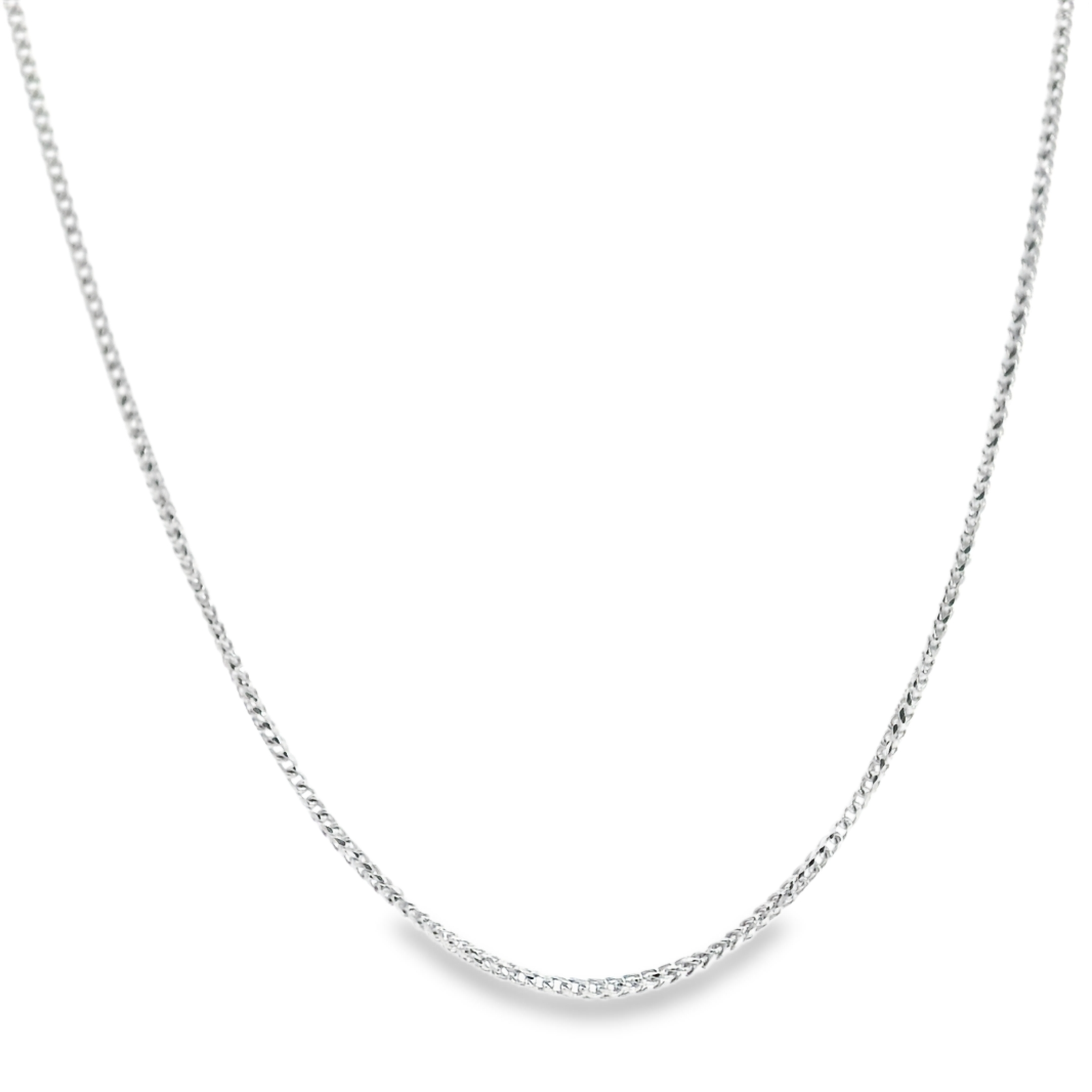 This chain is a 10k white gold diamond cut wheat chain that is 1.1 mm wide and 16" long with a lobster style clasp.