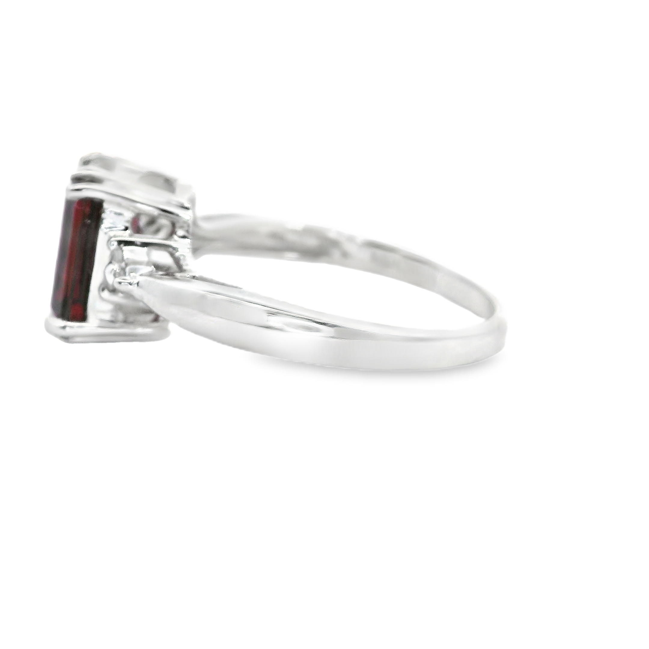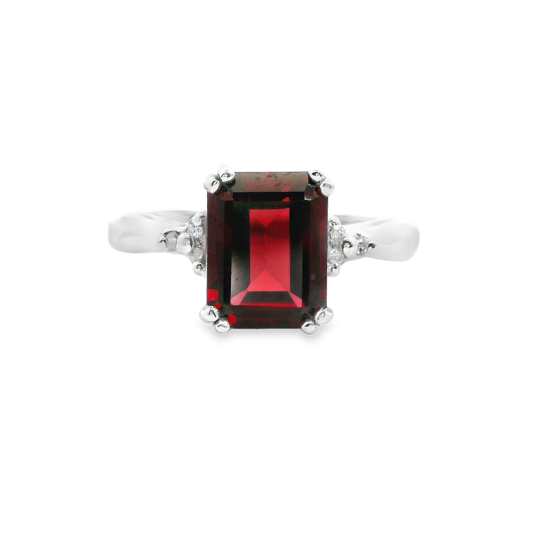 A 10k white gold garnet & diamond ring with an emerald cut garnet set in the center with 3 diamonds set on either side. The garnet is 2.15 CT and the diamonds are 0.02 CT TW Size 7