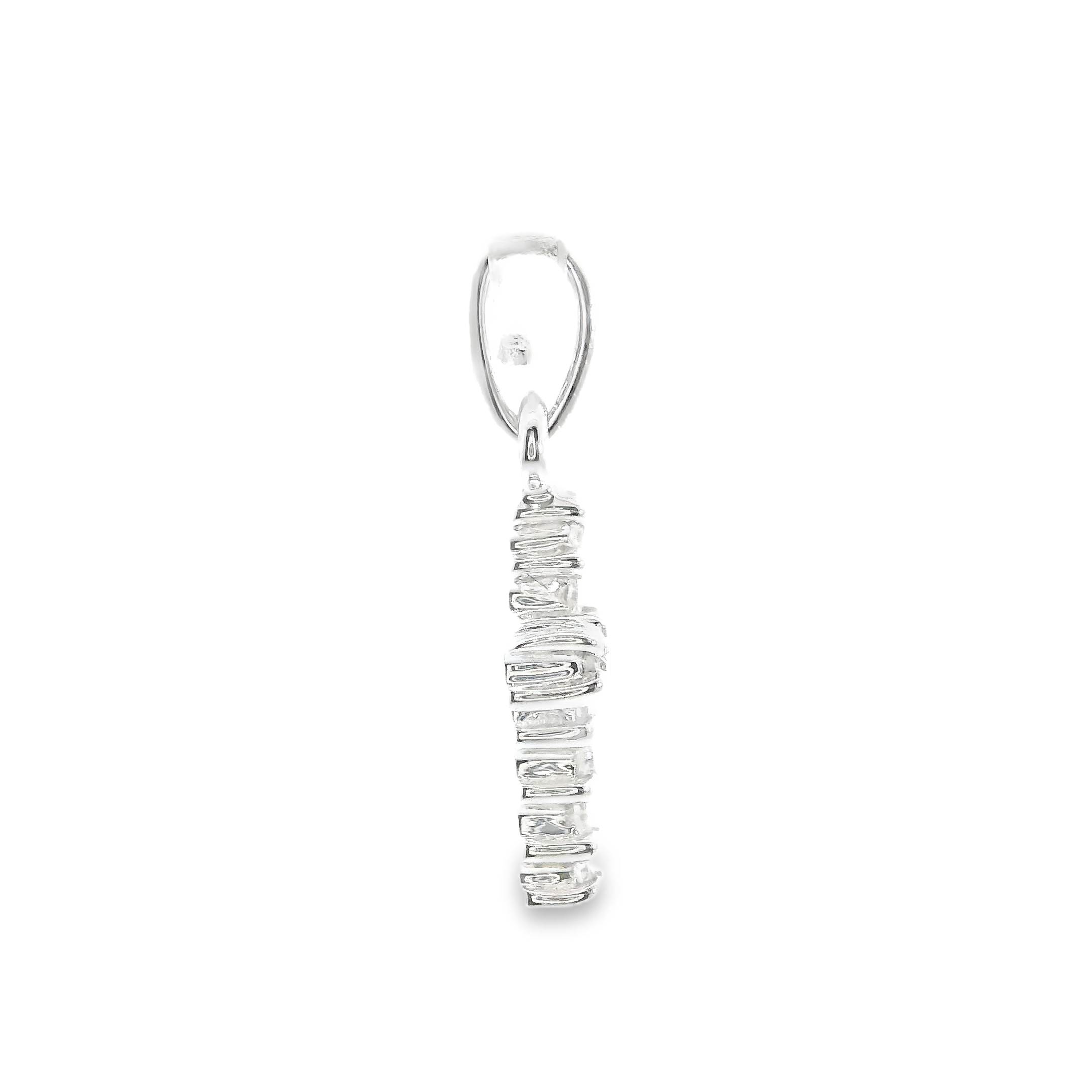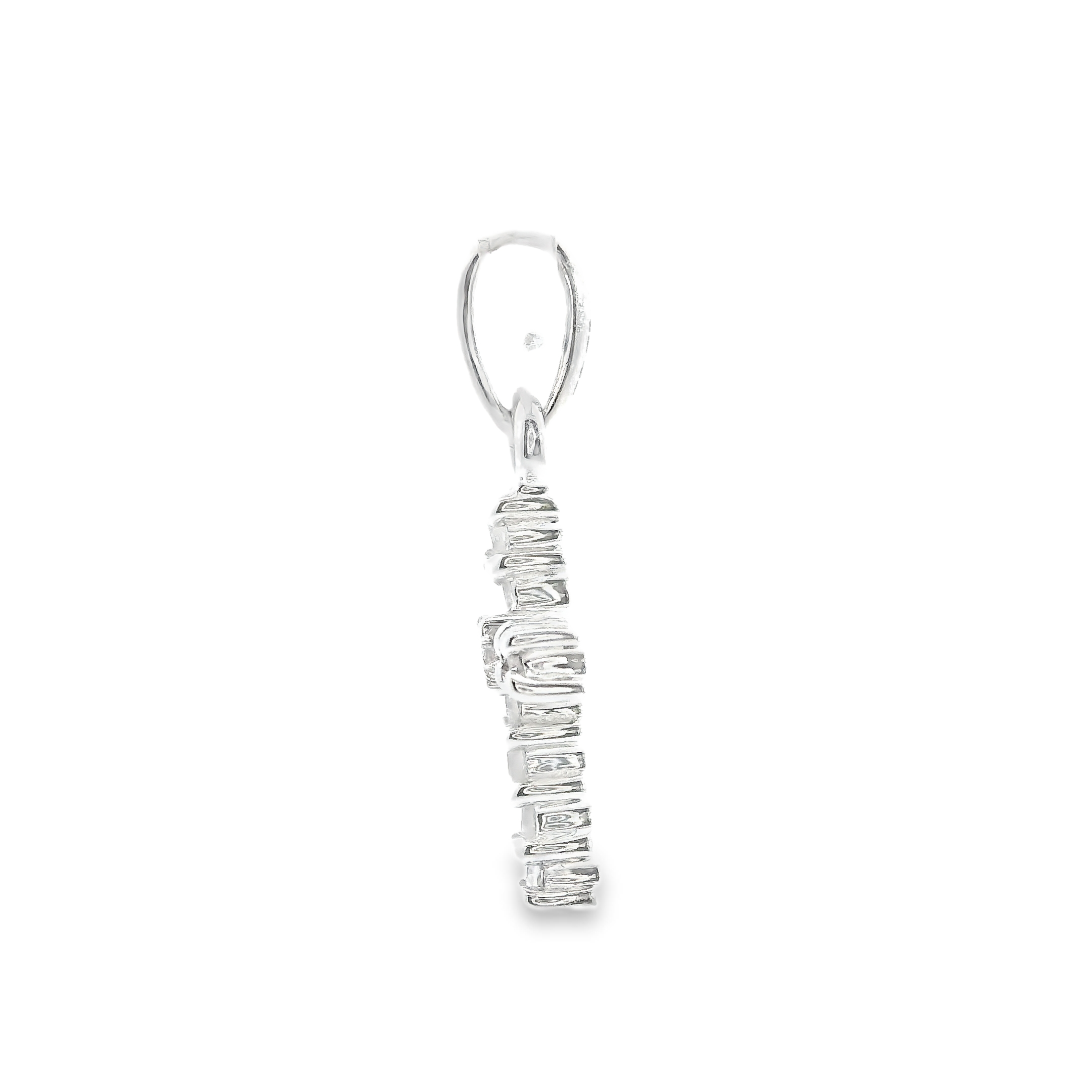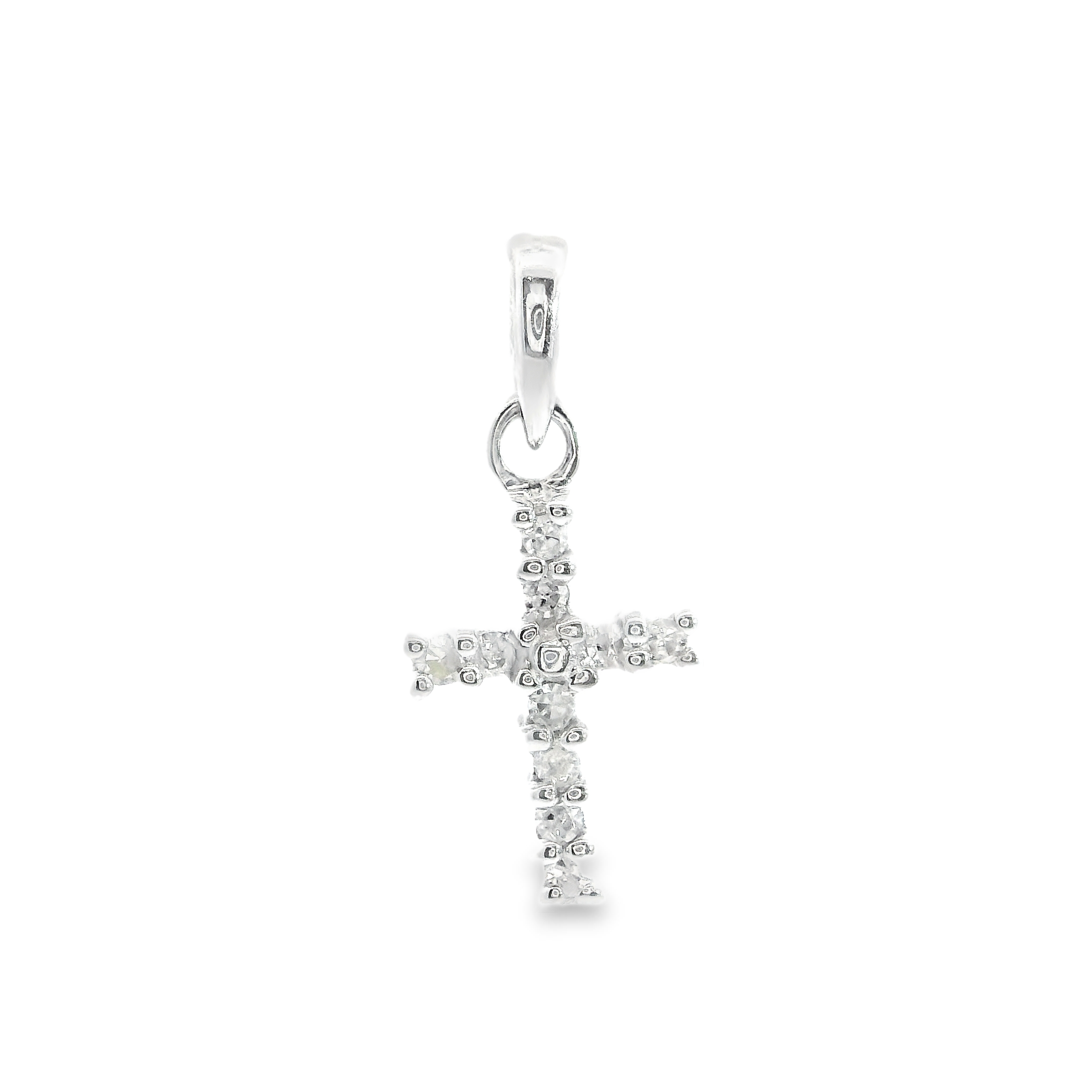 A 10k white gold diamond cross pendant. There are 10 diamonds prong set in the cross, totaling 0.05 ct tw. The cross is approx 1/2" long.
