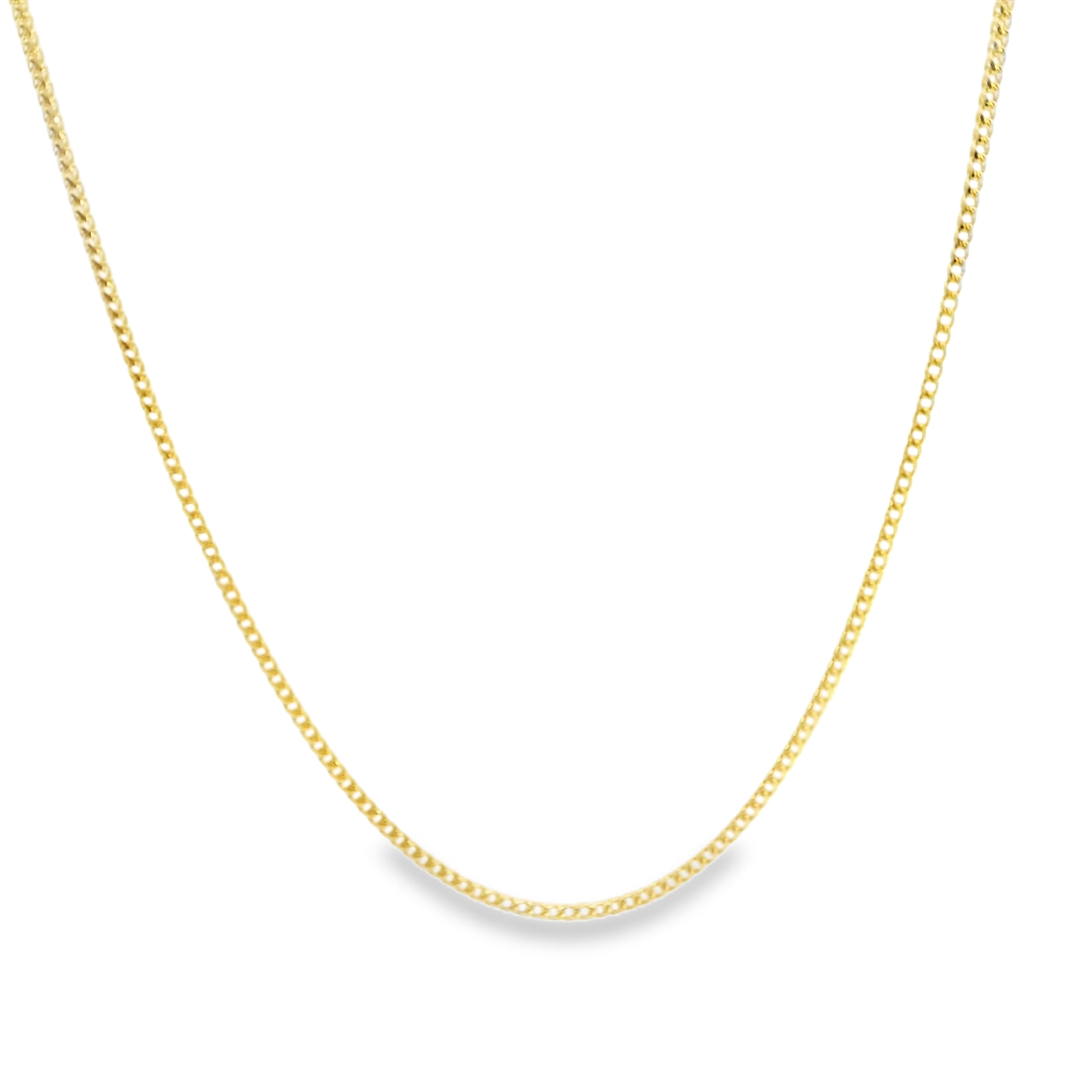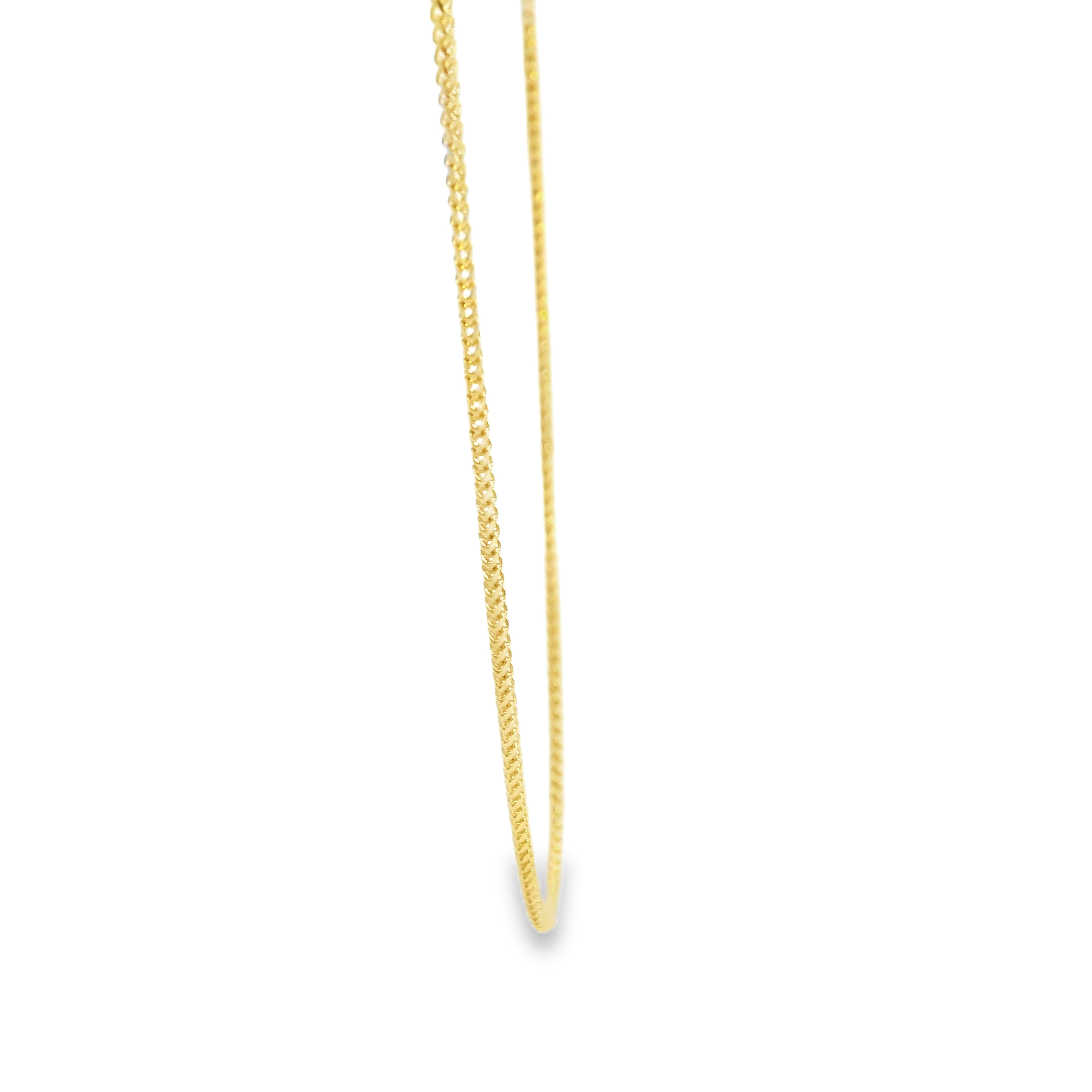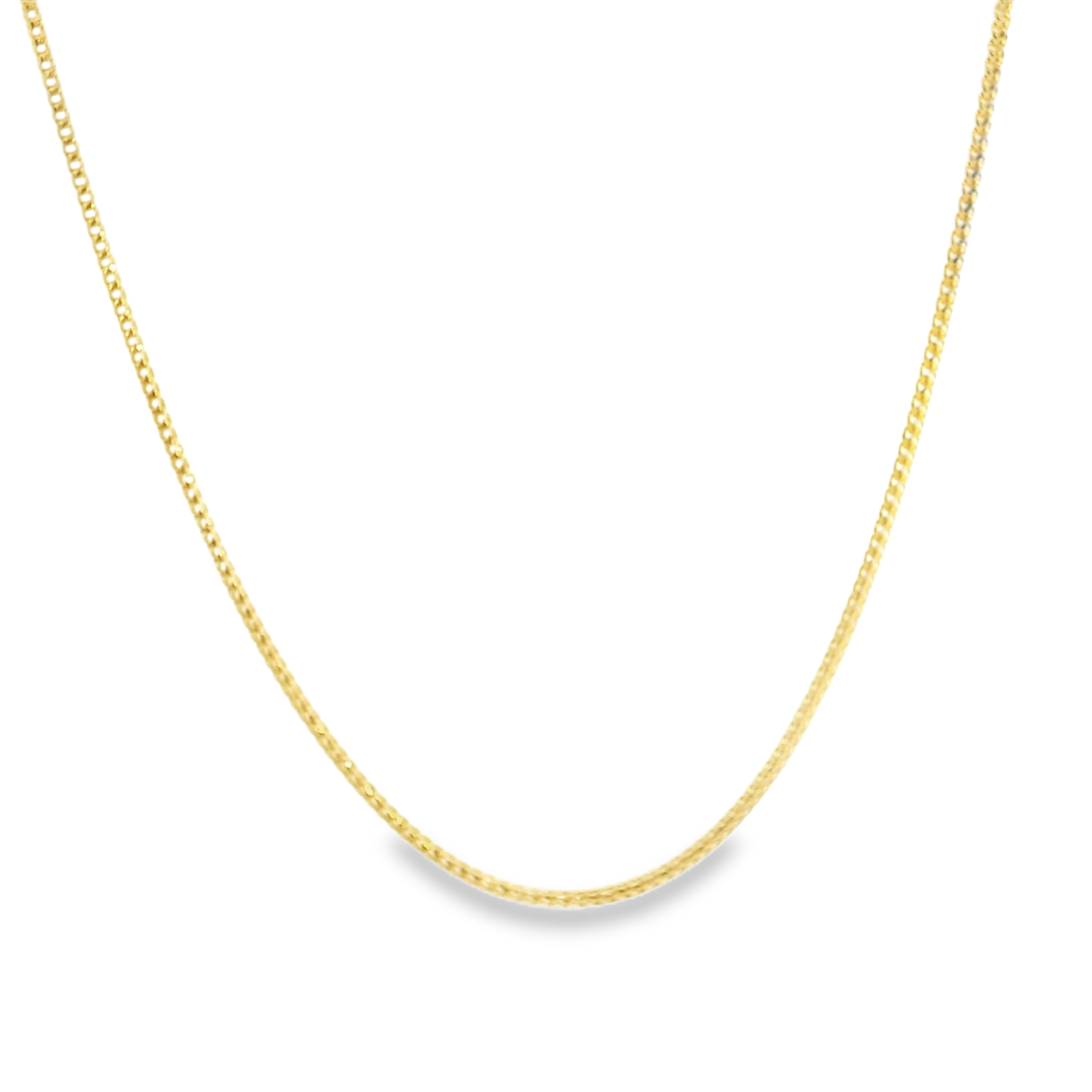 This chain is a 10k yellow gold diamond cut wheat chain that is 1.1 mm wide and 16" long with a lobster style clasp.