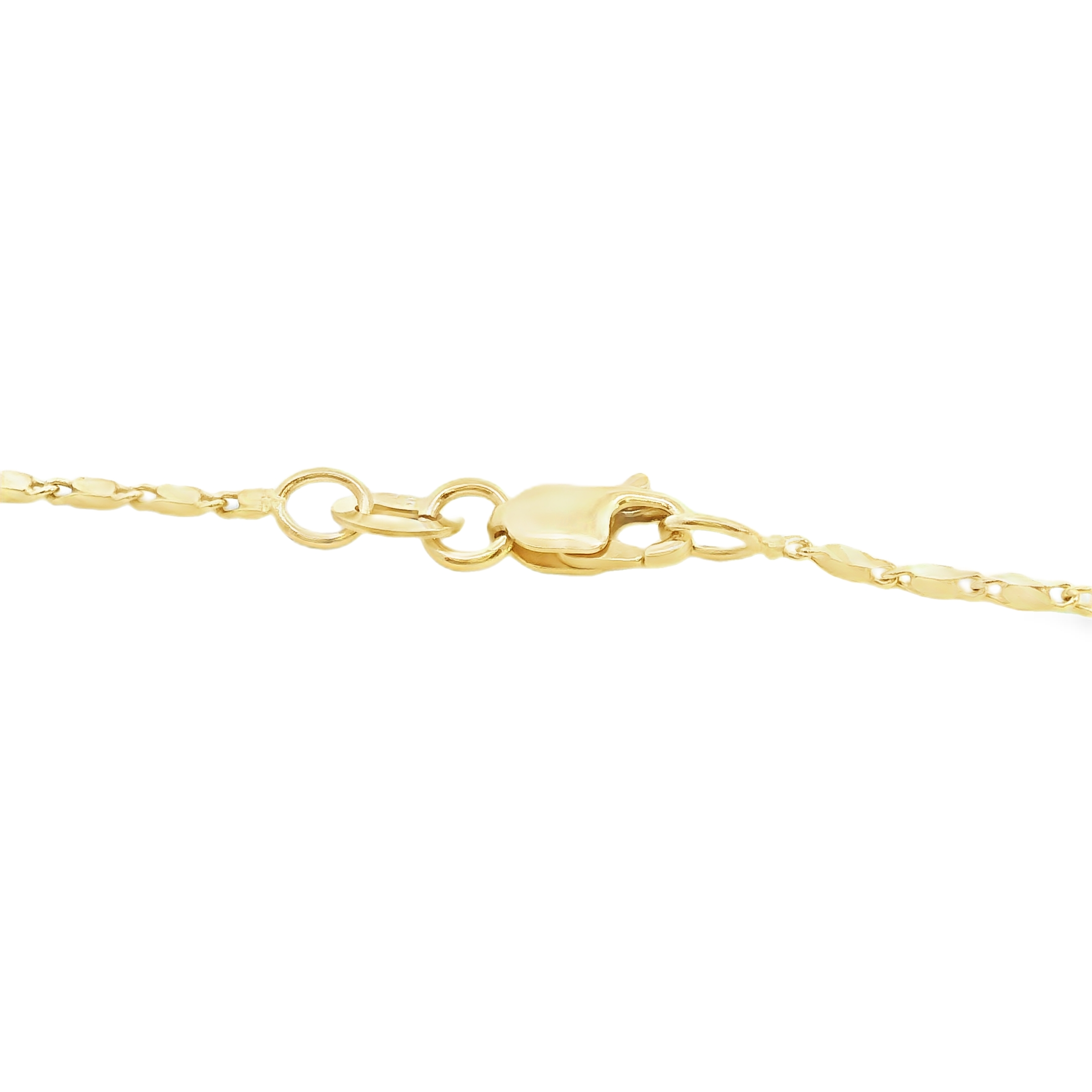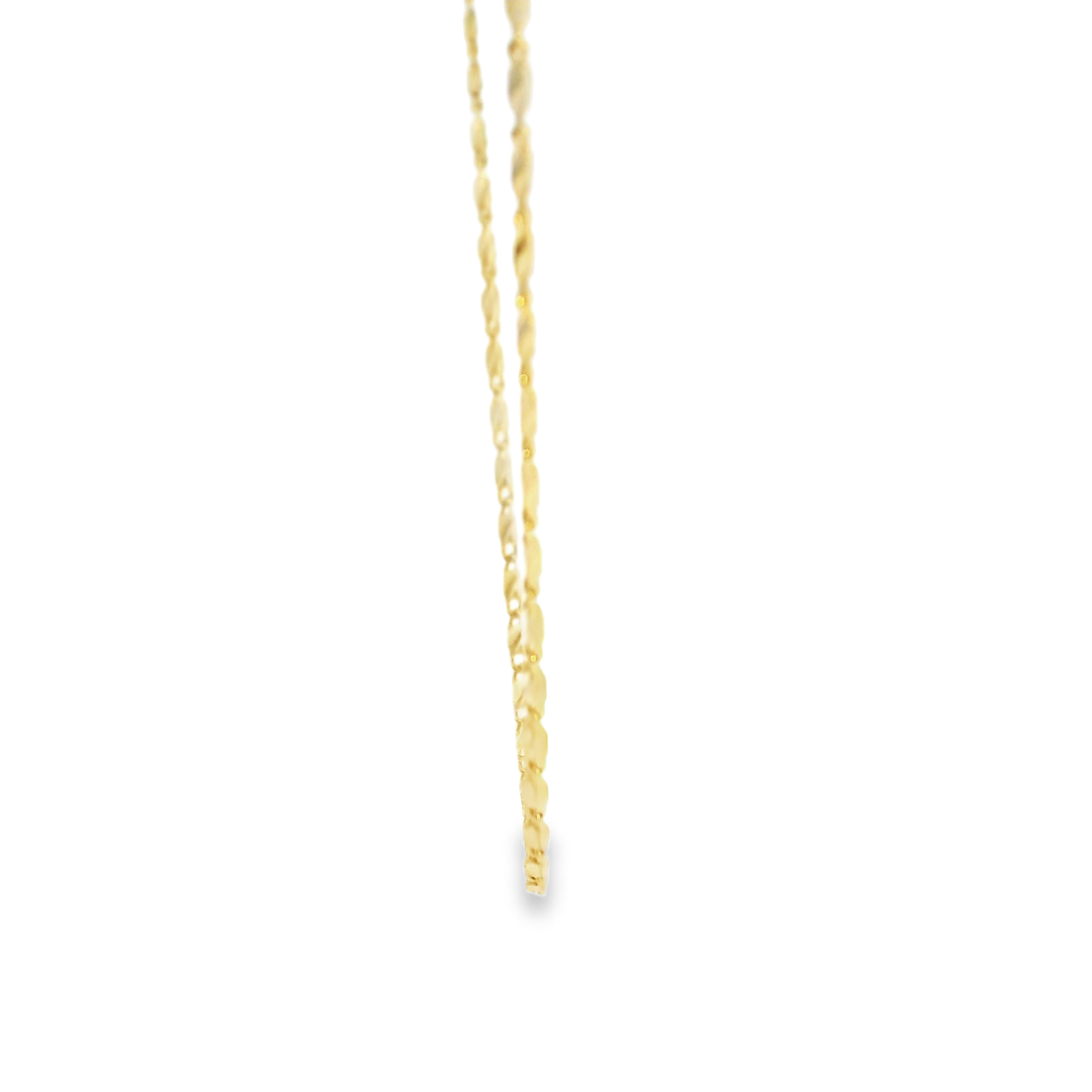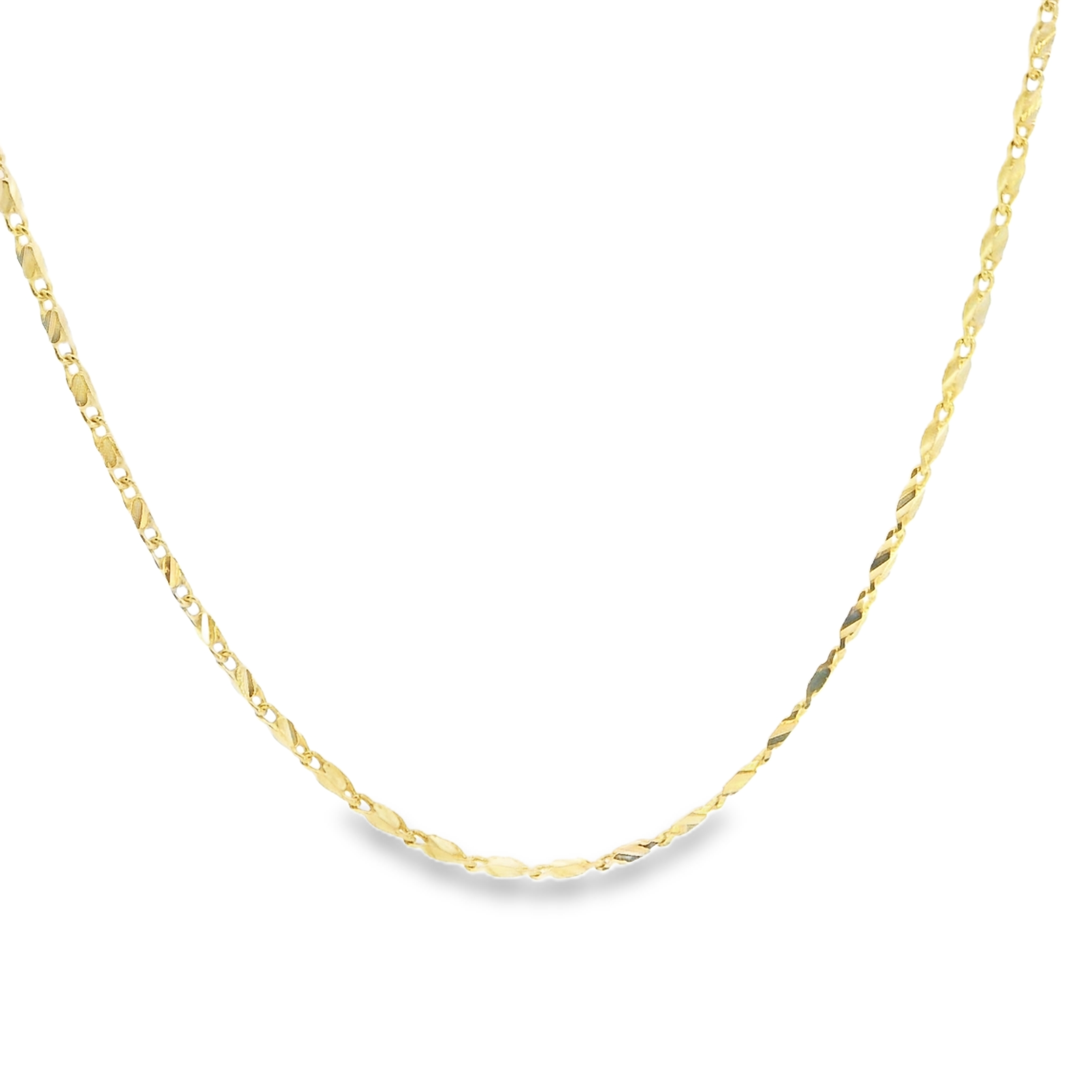 This chain is a 10k yellow gold fancy diamond cut link chain that is 0.9 mm wide and 14" long with a lobster style clasp.