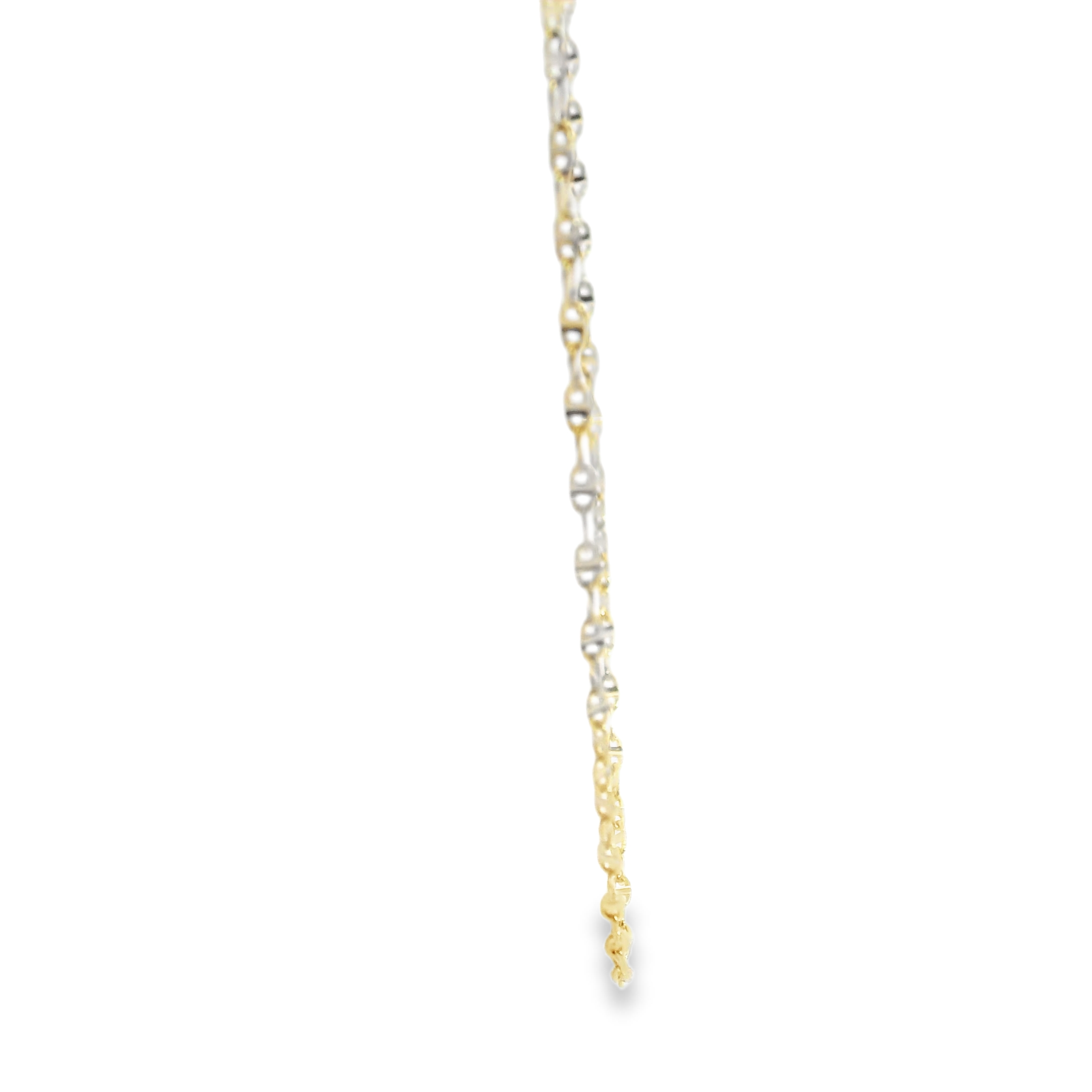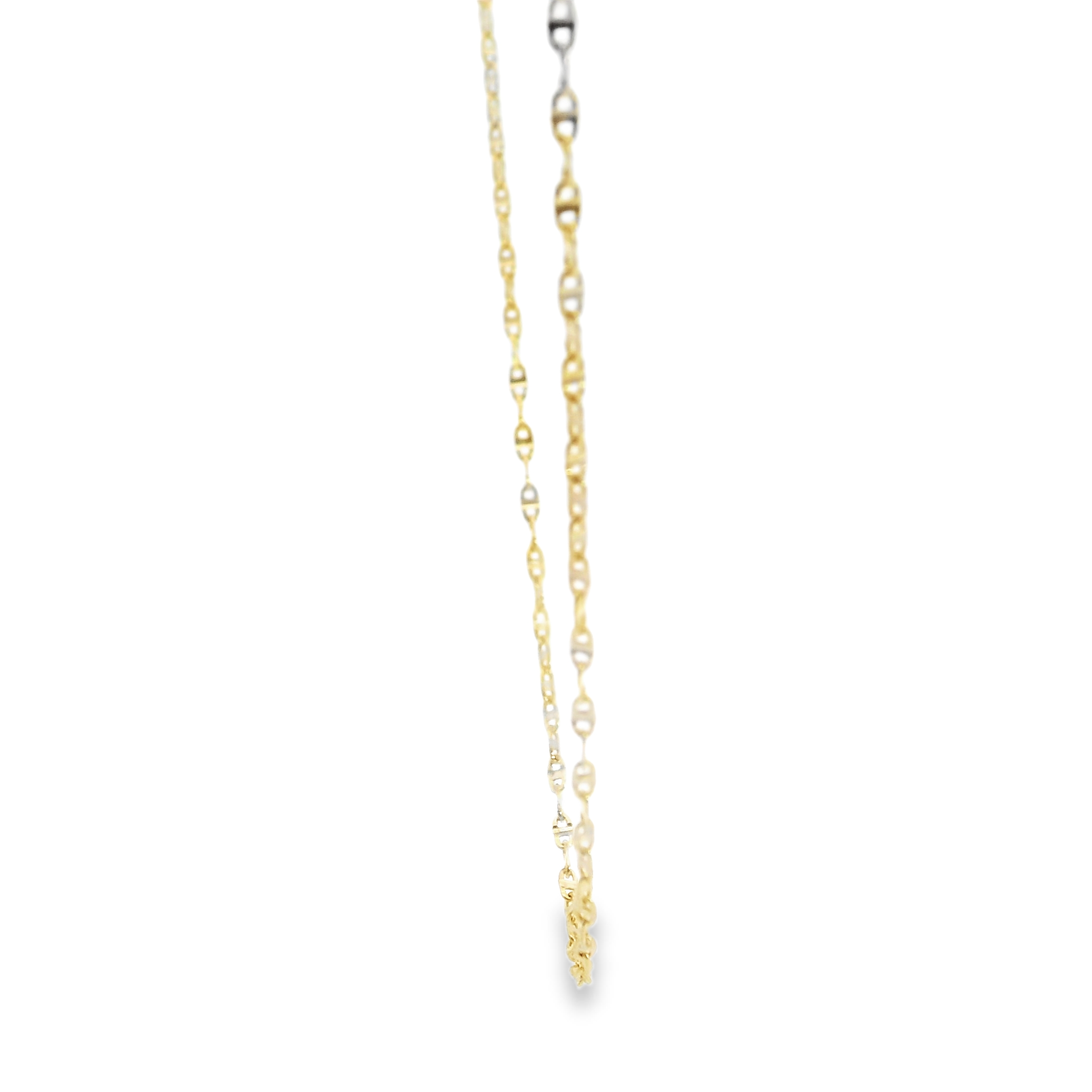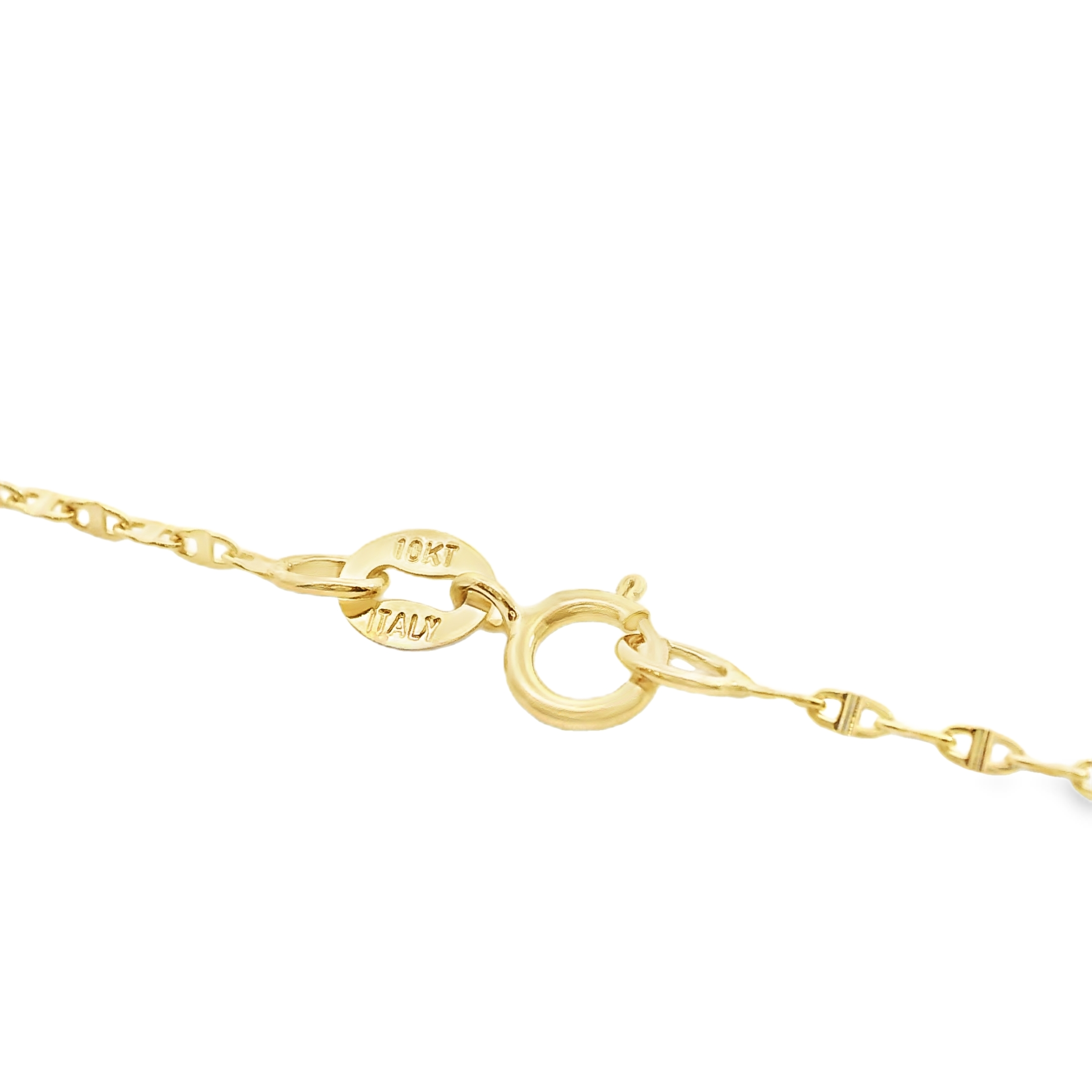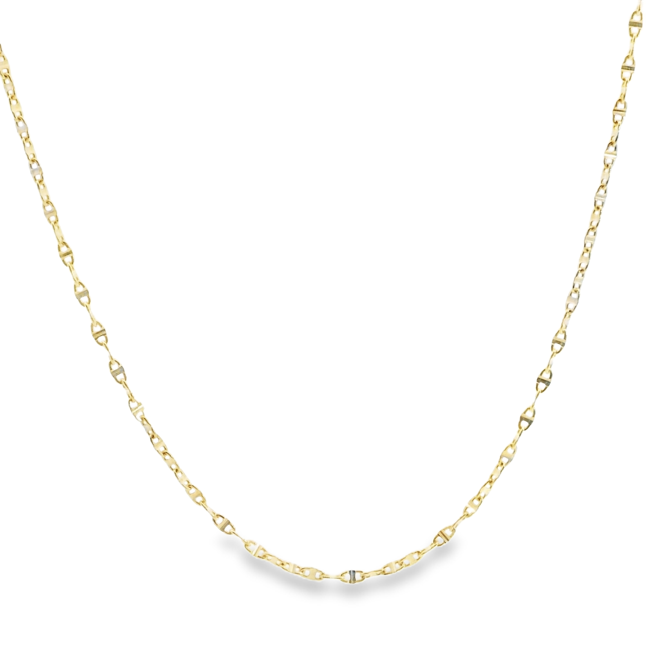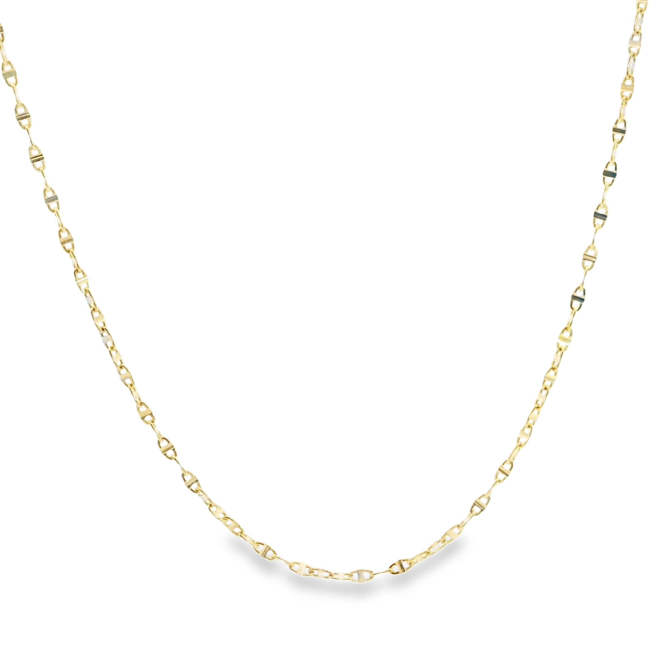 This chain is a 10k yellow gold fancy diamond cut link chain that is 1.2 mm wide and 18" long with a spring ring style clasp.