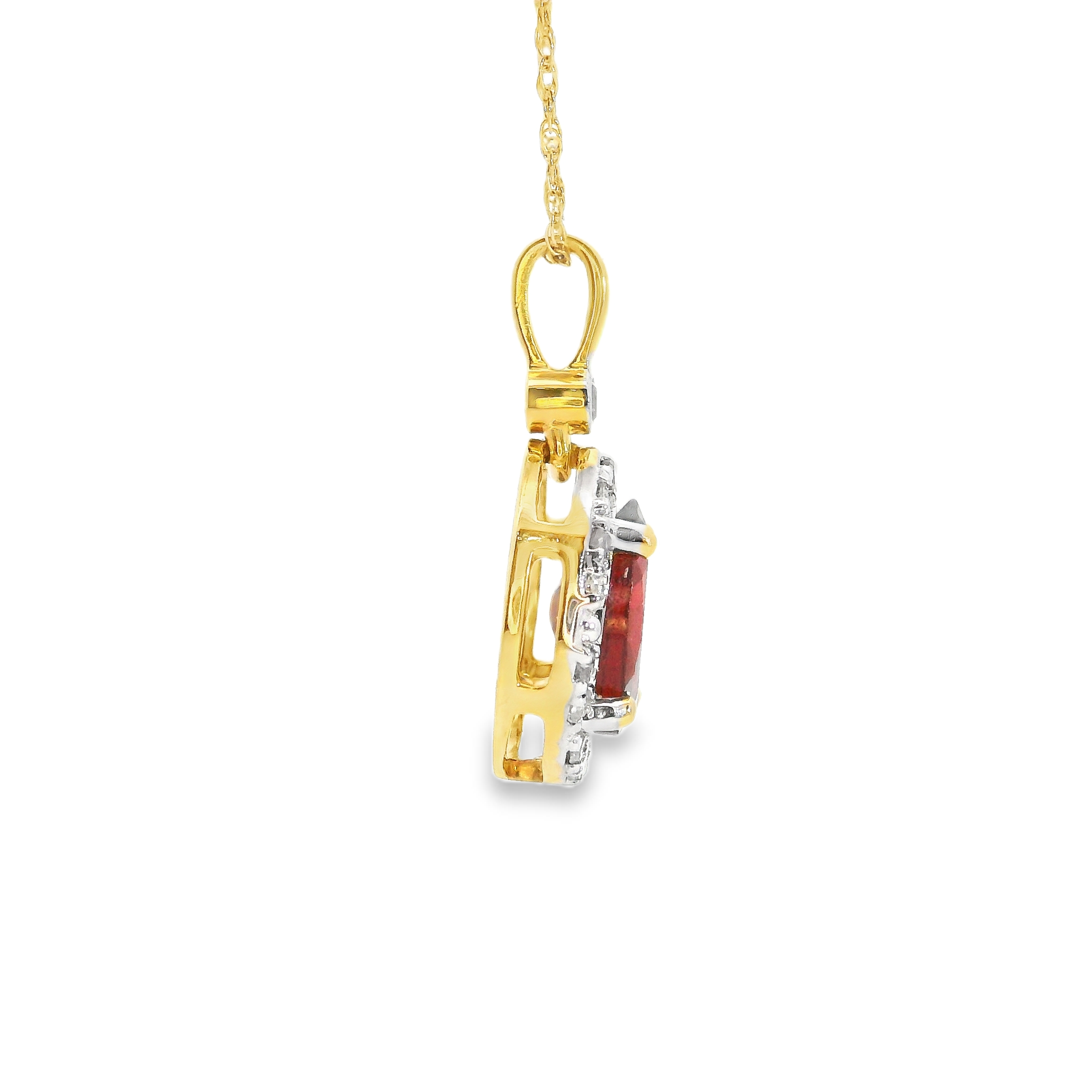 This pendant is a 10k yellow gold garnet & diamond pendant. The center garnet is oval shaped, surrounded by a halo of diamonds totaling 0.12 ct tw set on an 18" loose rope chain.