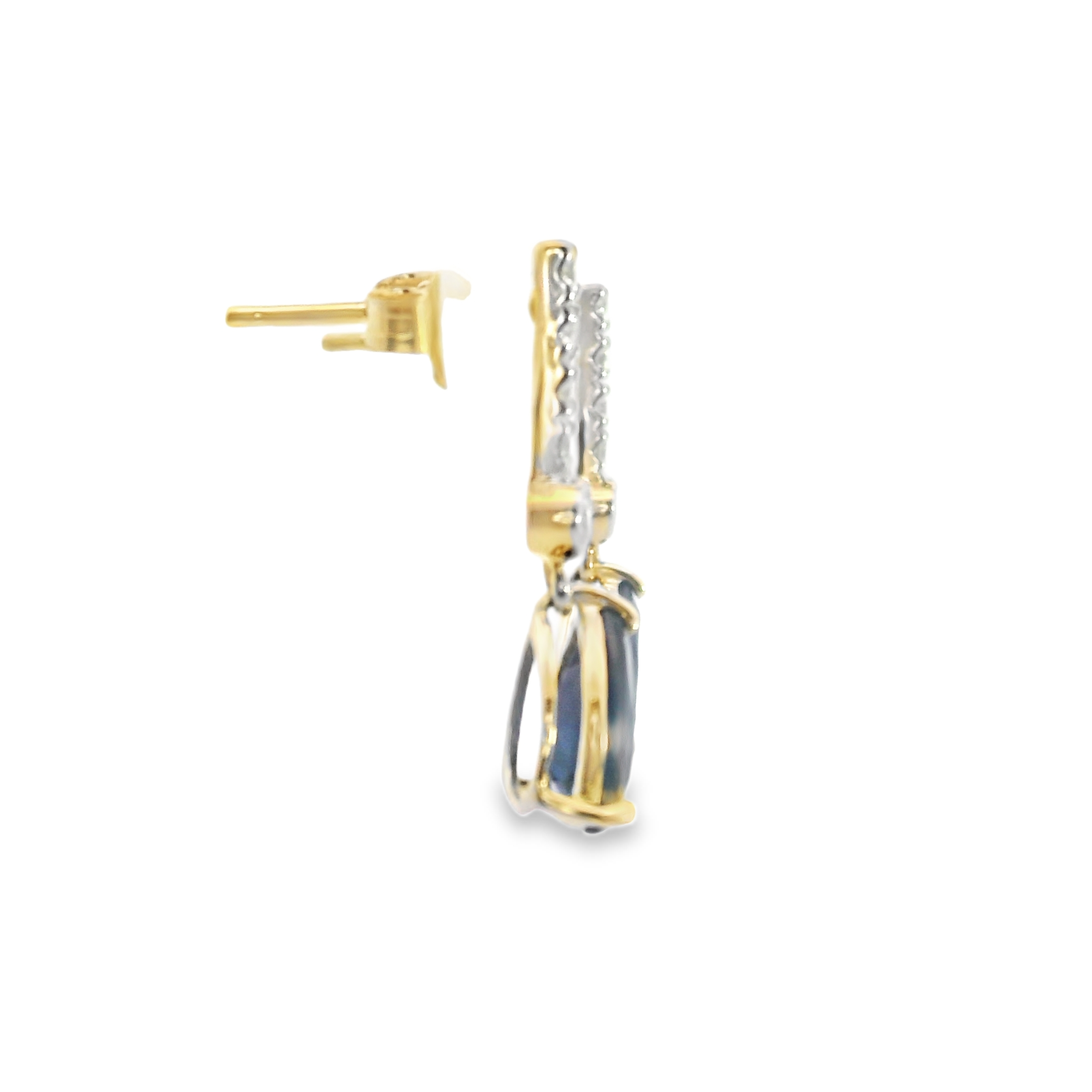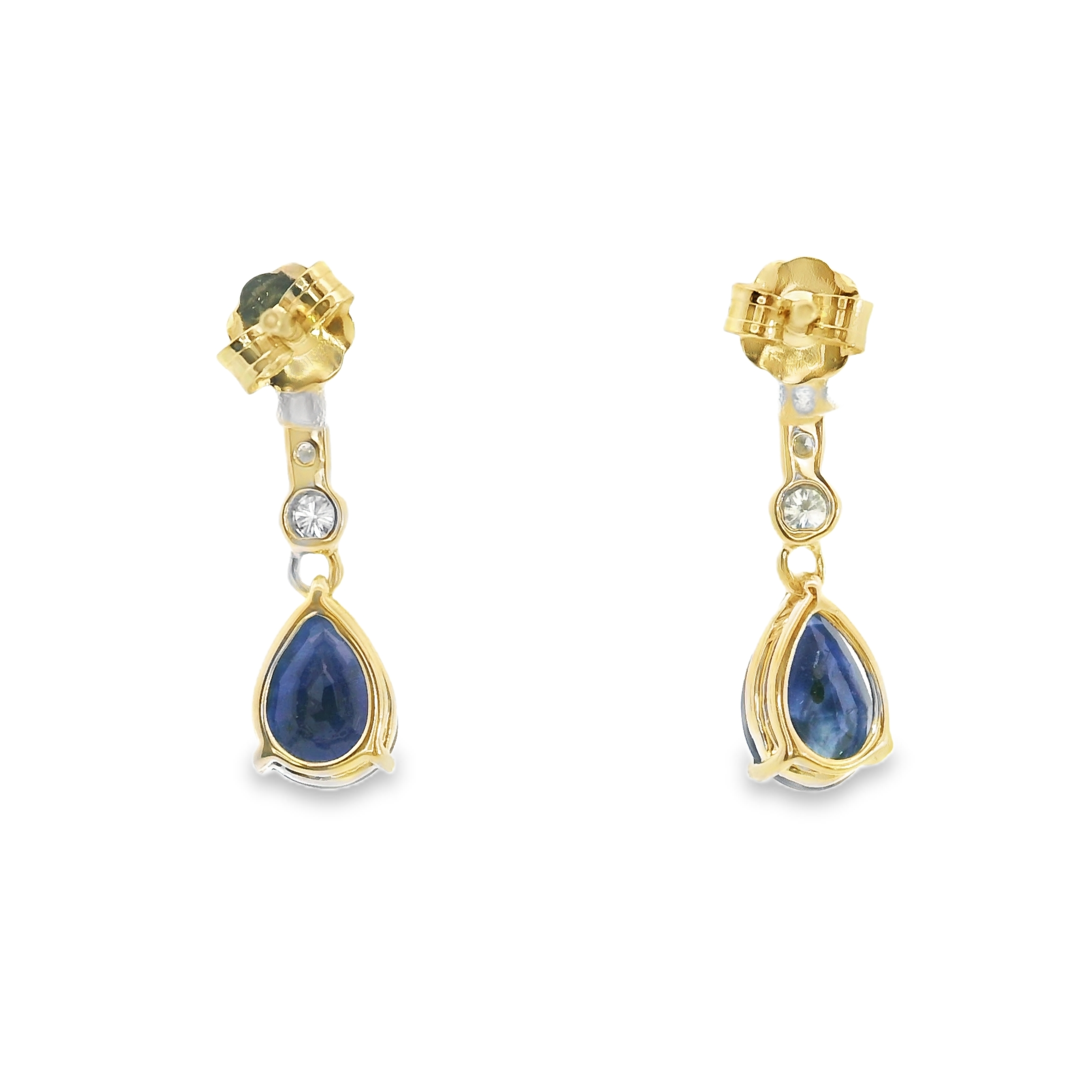 These earrings are 10k yellow gold with diamonds prong set in the drop post and a pear shape sapphire hanging from the bottom of each earring. The sapphires total 1.42 CT TW and the diamonds total 0.17 ct tw. They hang approx 0.75" in total length.