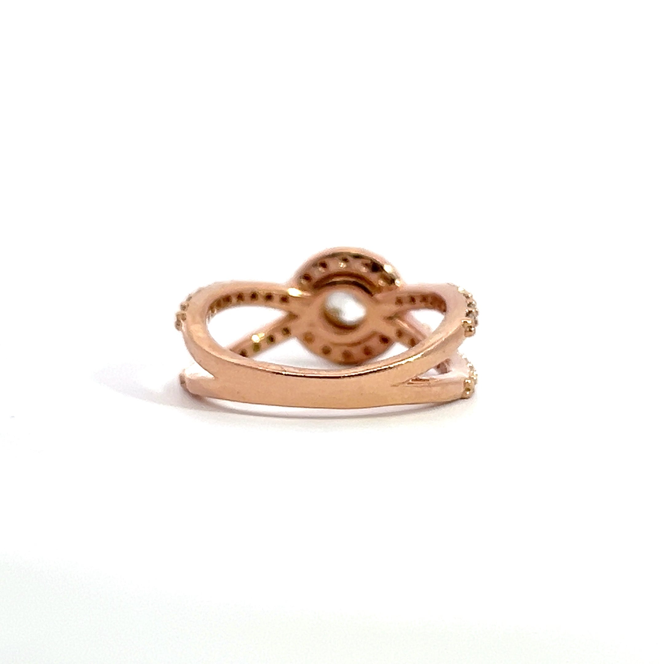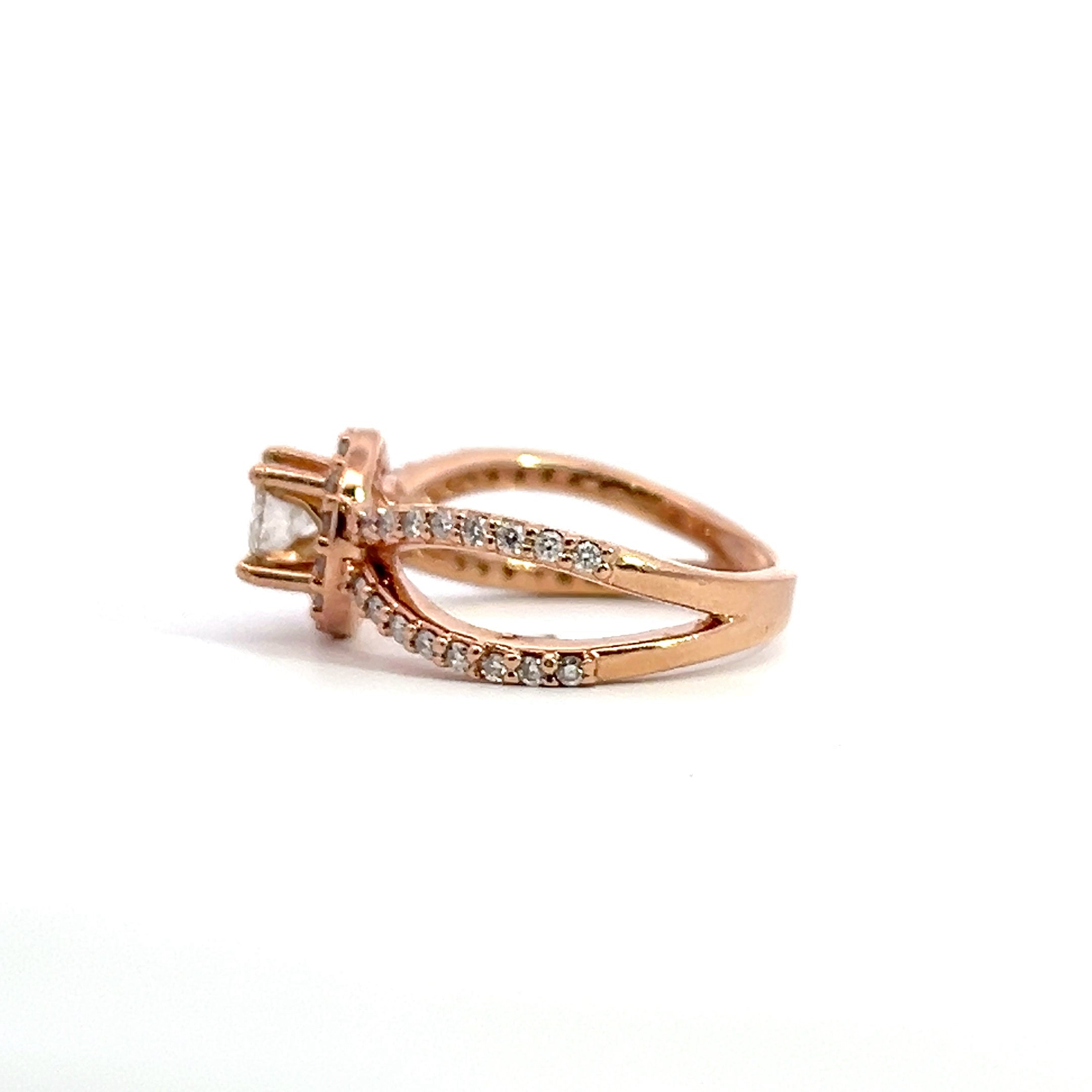 This estate 14k rose gold ring has a center diamond that is approx 0.45 ct, I color and I2 clarity. It is surrounded by a halo of diamonds and diamonds set on the split shank pinched style band. The small diamond total approx 0.50 ct tw. Size 7.75